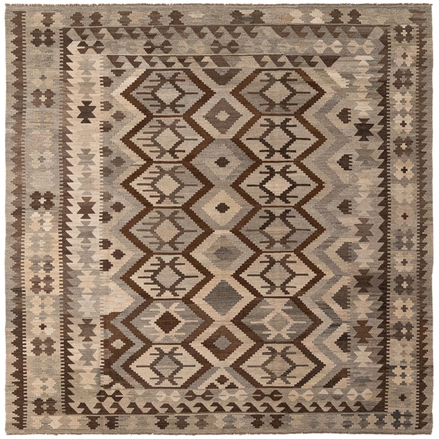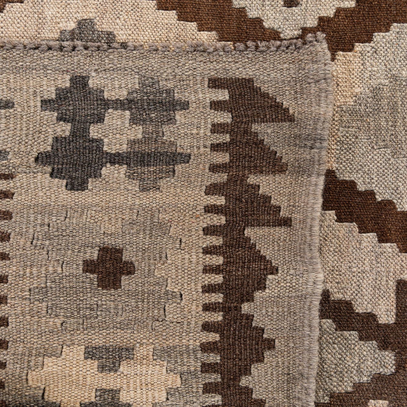 A 7x10 rectangular flatweave Kilim Maymana wool rug in shades of gray and brown with a tribal geometric pattern.