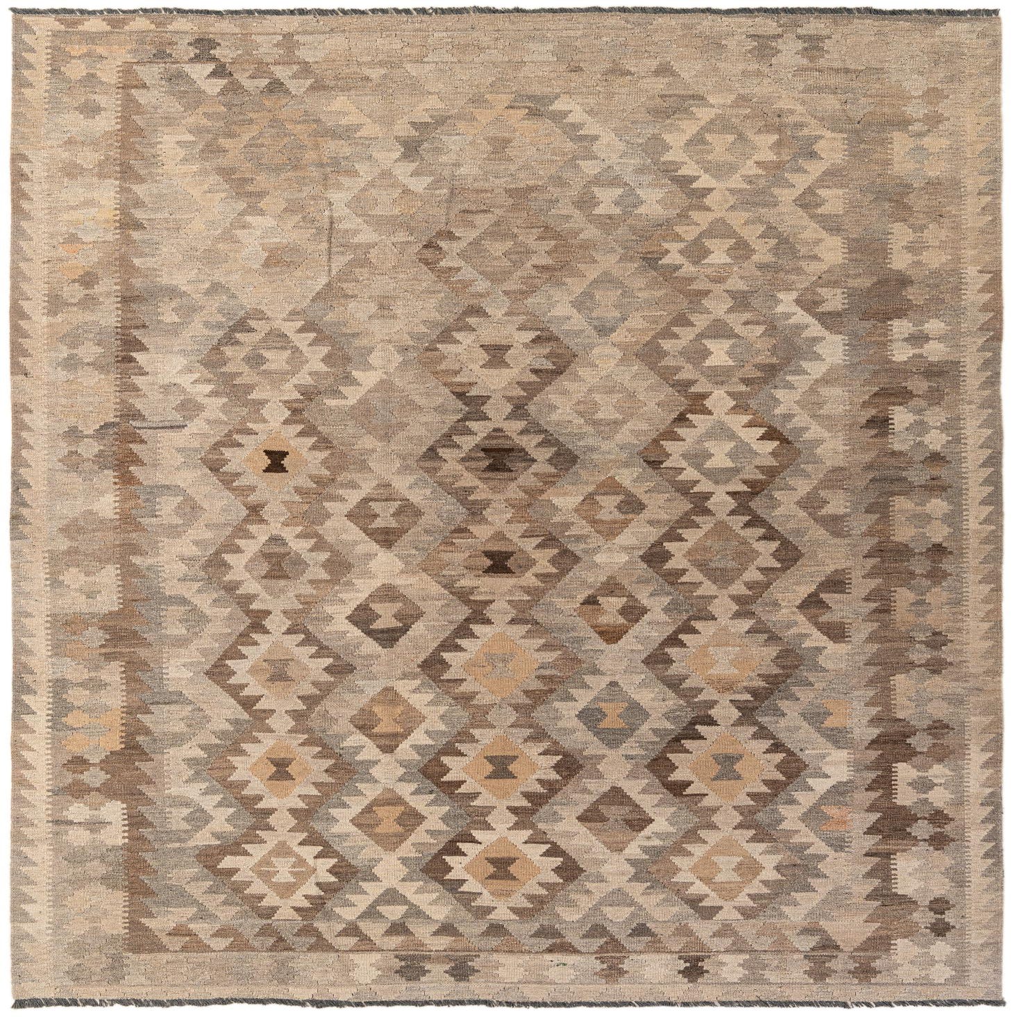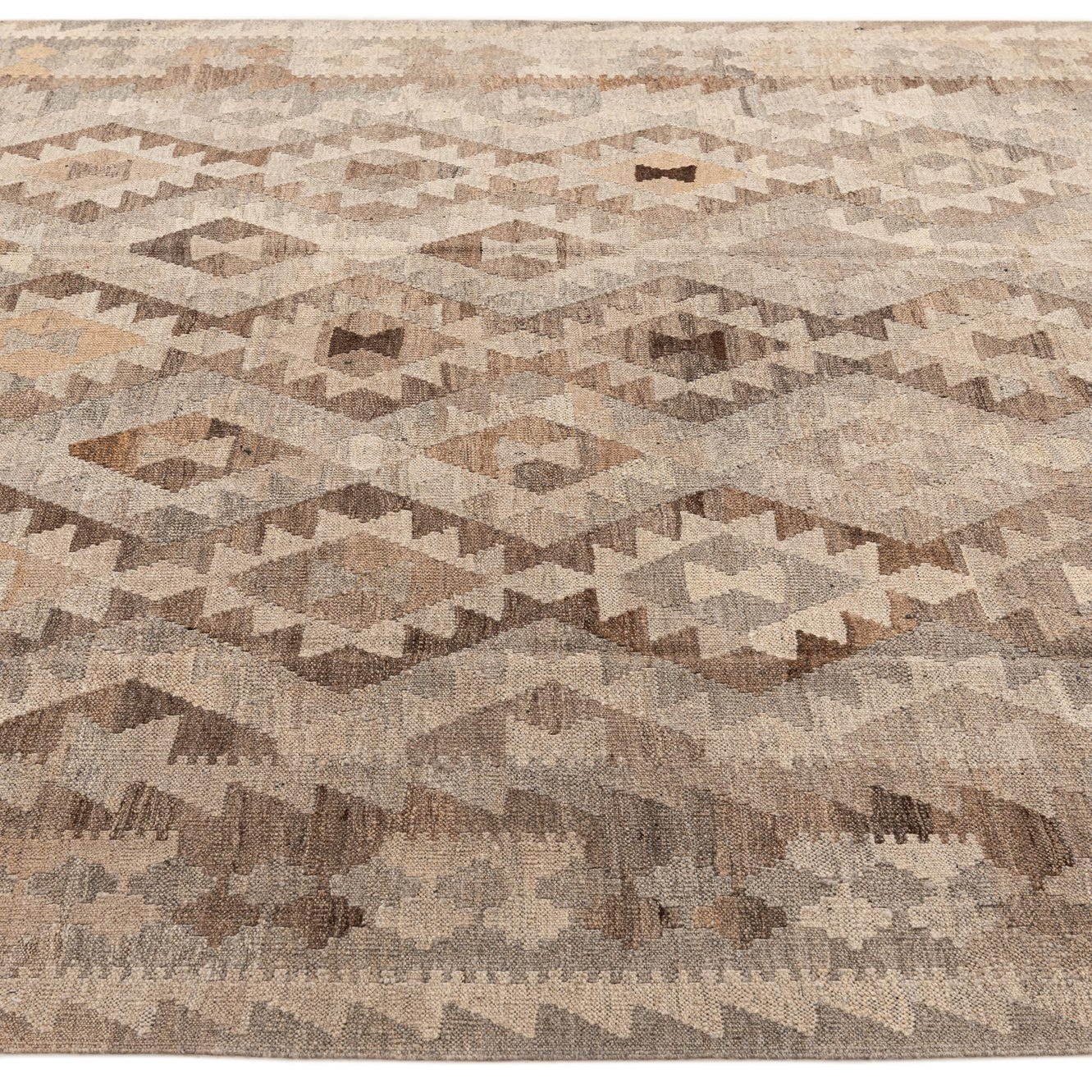 A 7x10 rectangular Kilim Maymana rug featuring a tribal geometric pattern in shades of gray, silver, and beige.