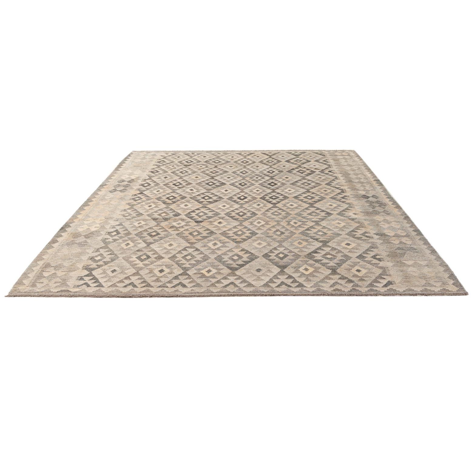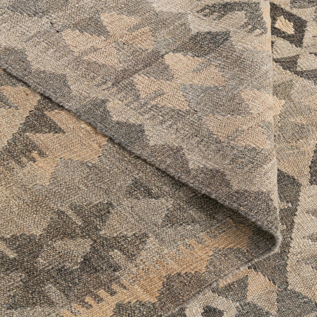 A 7x10 rectangular flatweave Kilim Maymana rug featuring a tribal geometric diamond pattern in varying shades of gray and silver.