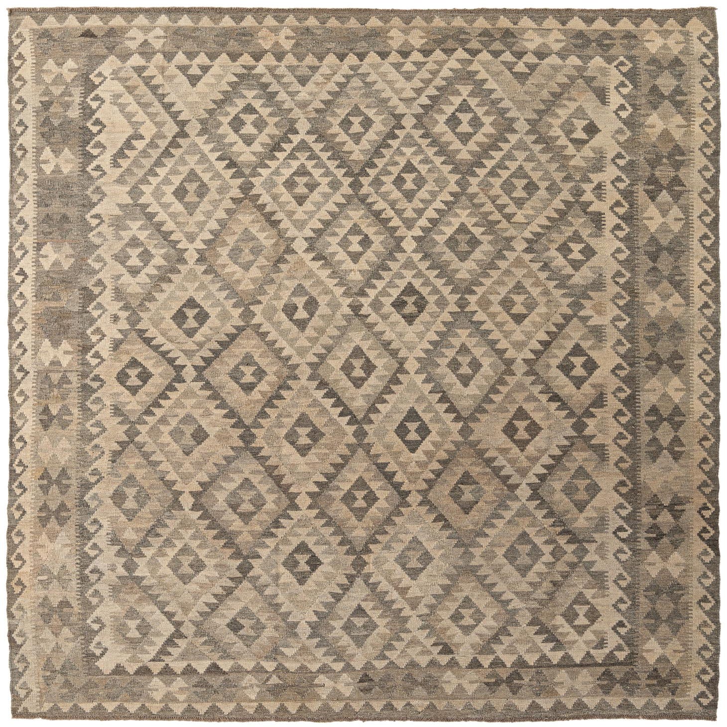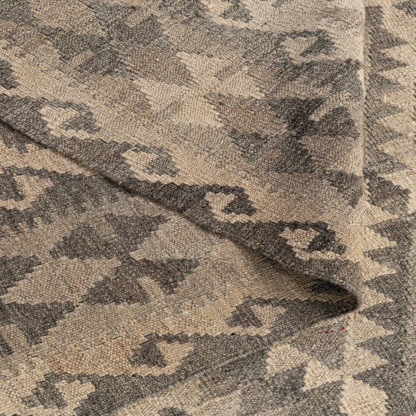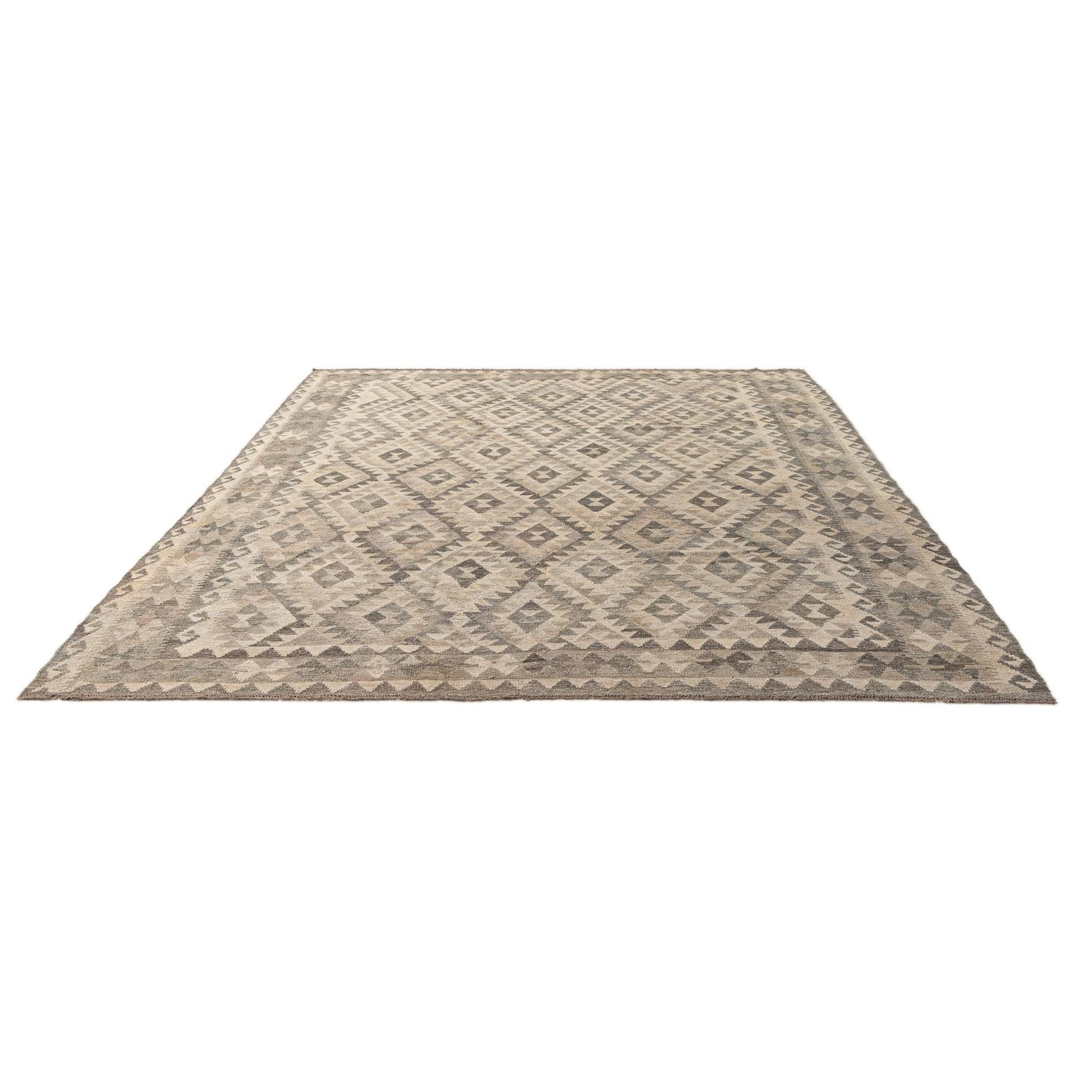 A 7x10 rectangular Kilim Maymana rug featuring a tribal geometric pattern in shades of gray and silver, perfect for a modern living room.