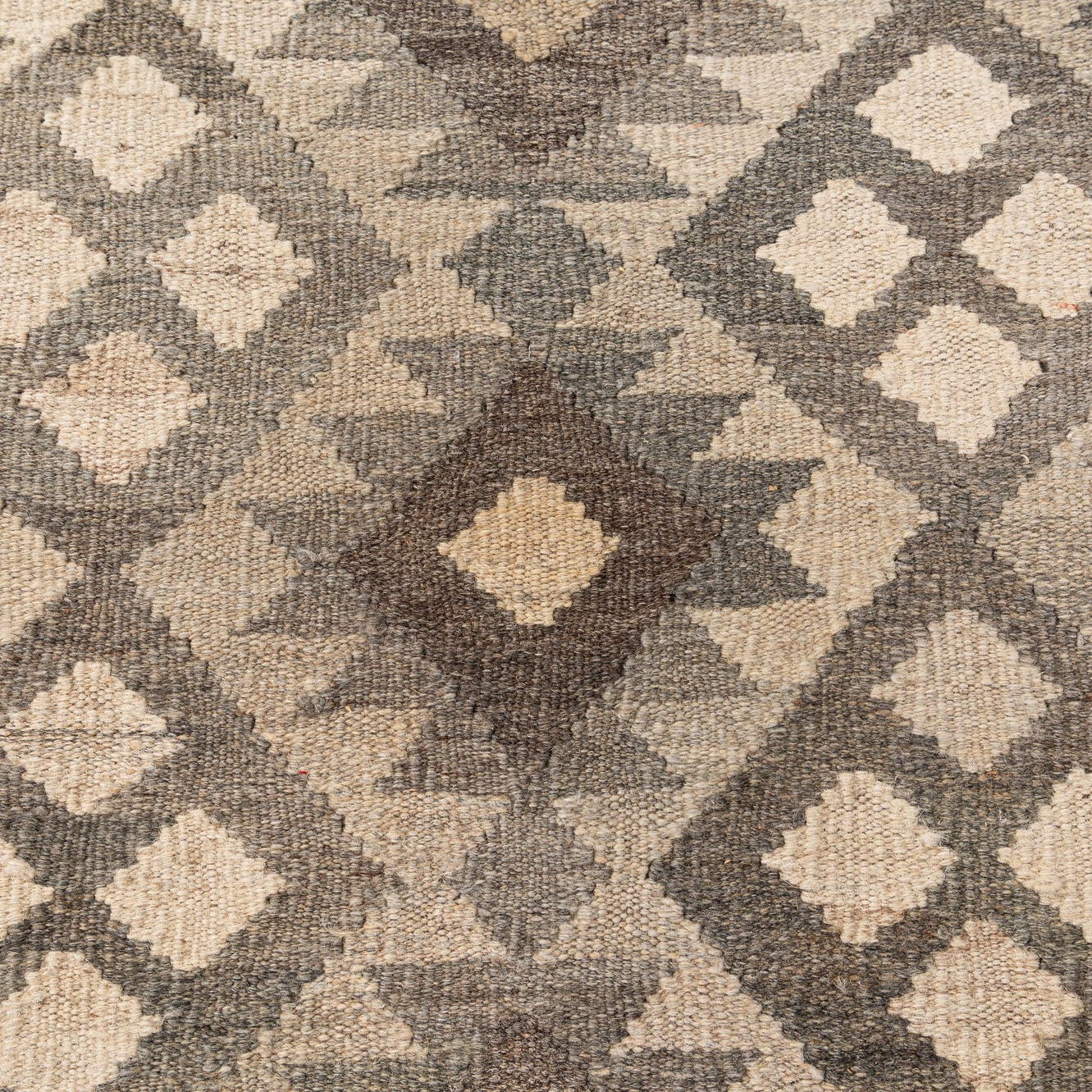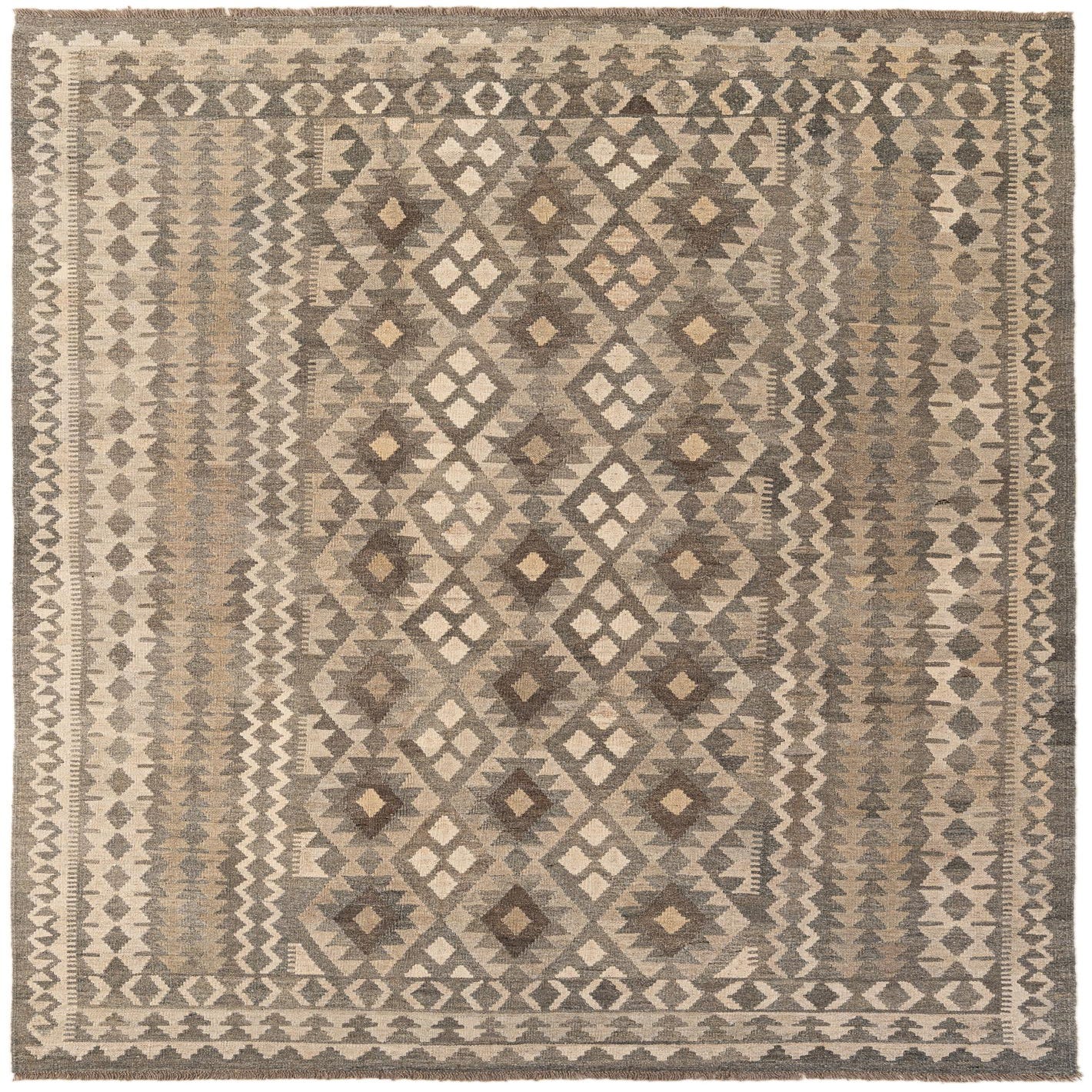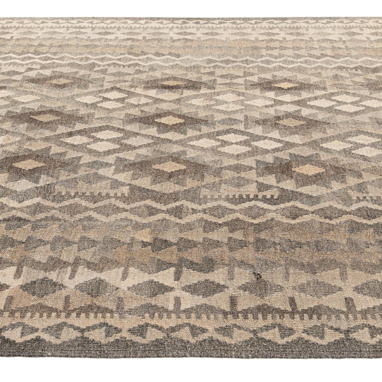 A 7x10 rectangular flatweave Kilim Maymana rug featuring tribal geometric patterns in shades of gray and silver.