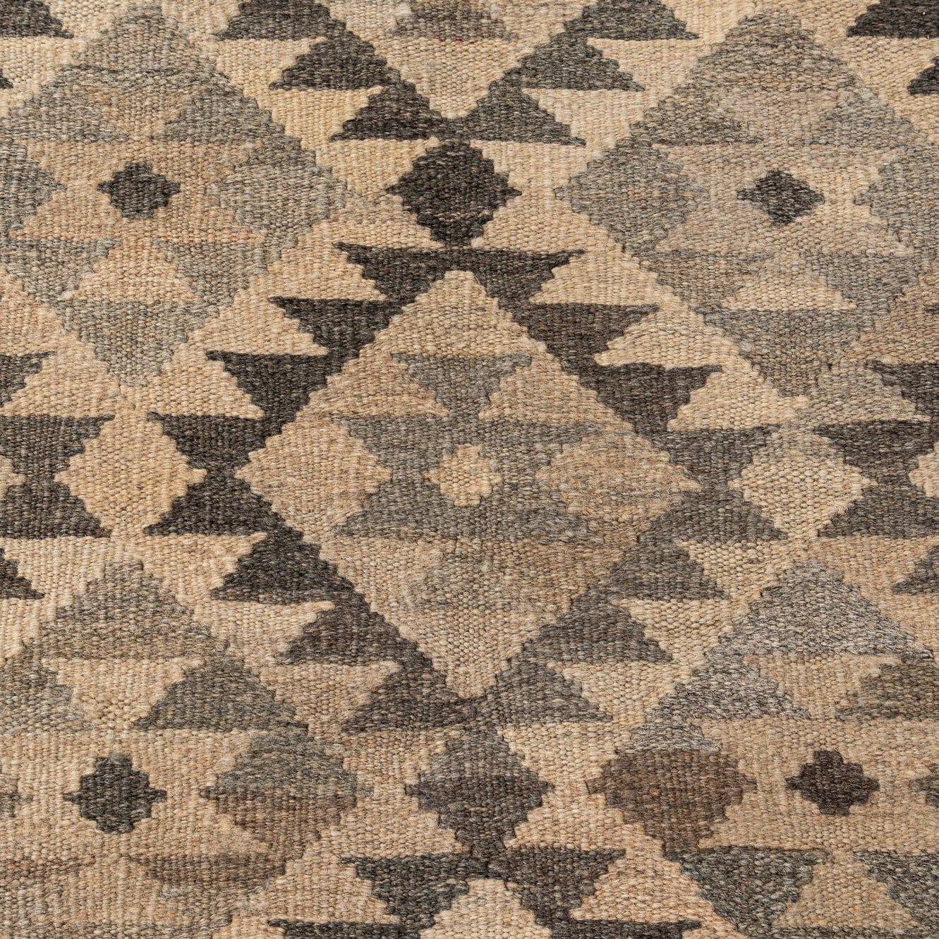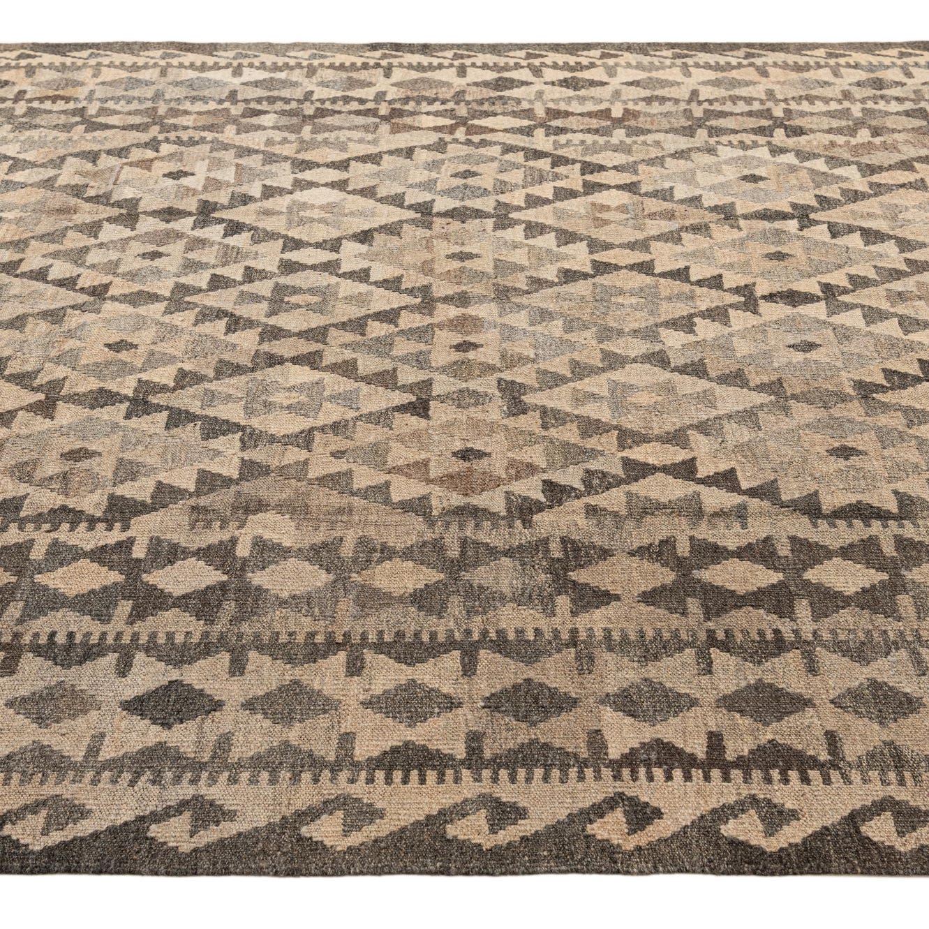 A 7x10 rectangular Kilim Maymana wool rug featuring a tribal geometric pattern in shades of gray and silver.