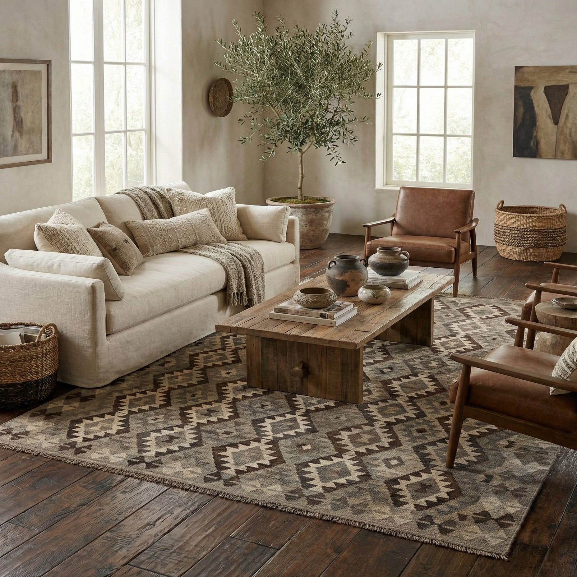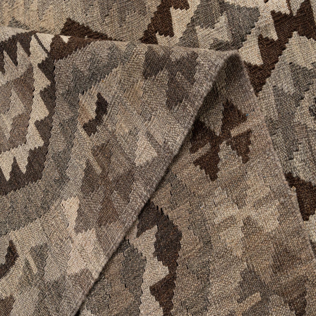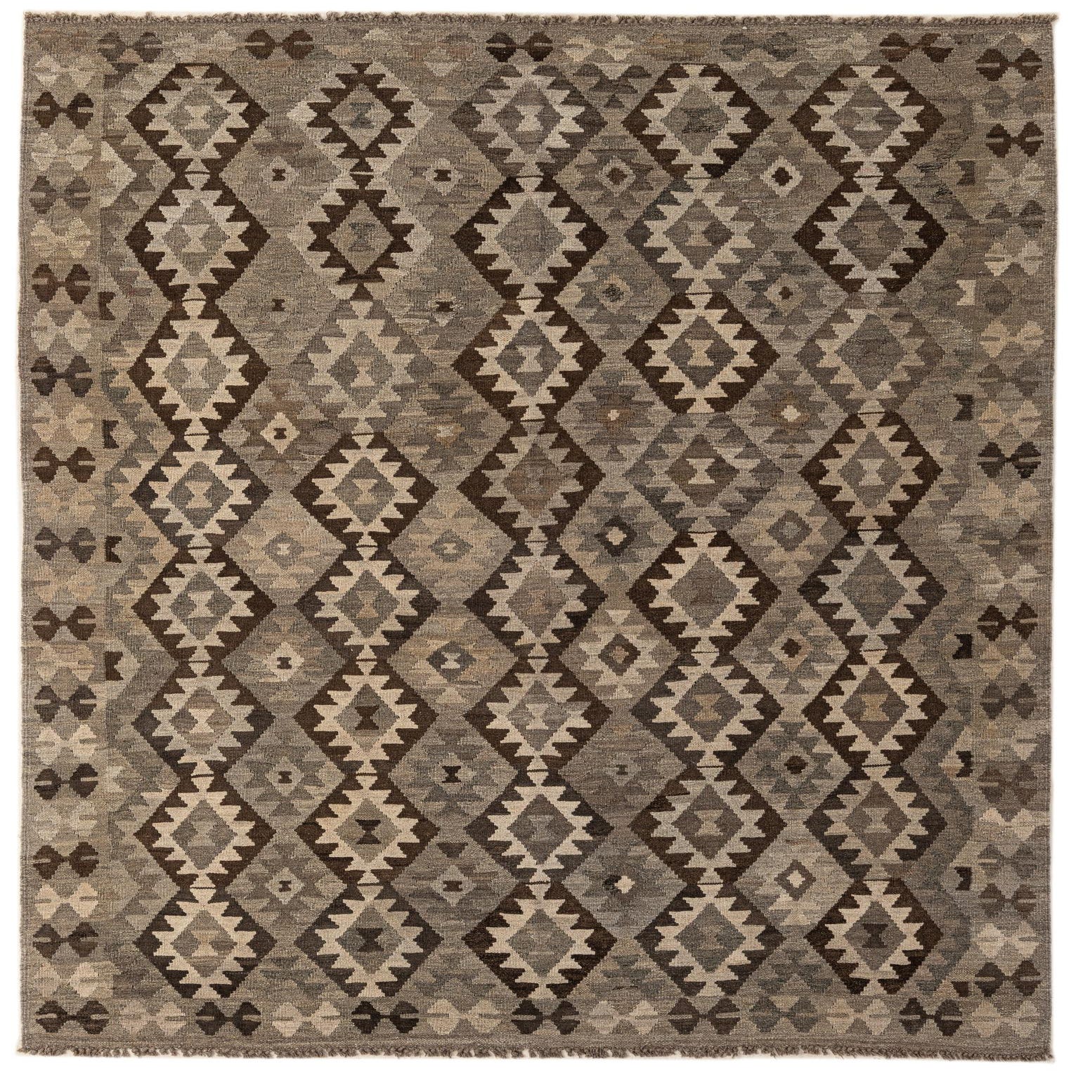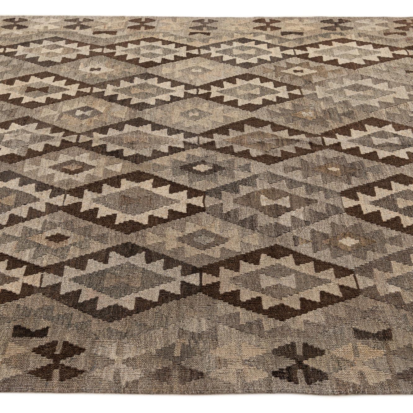 A 7x10 rectangular flatweave rug with a tribal geometric diamond pattern in shades of gray, silver, and brown.