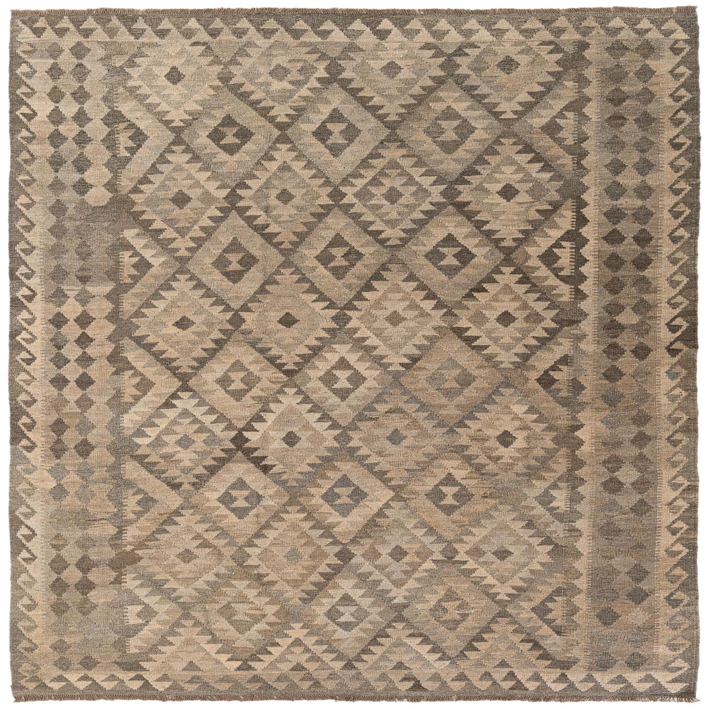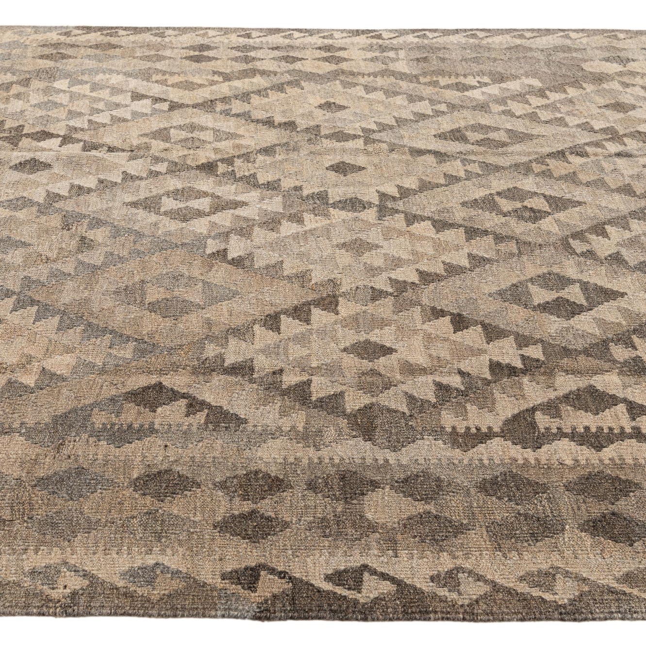 A 7x10 rectangular Kilim Maymana rug featuring a tribal geometric pattern in shades of gray and silver.