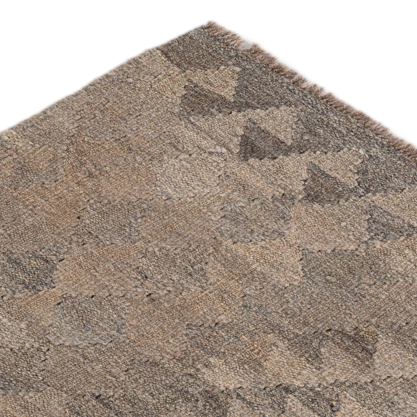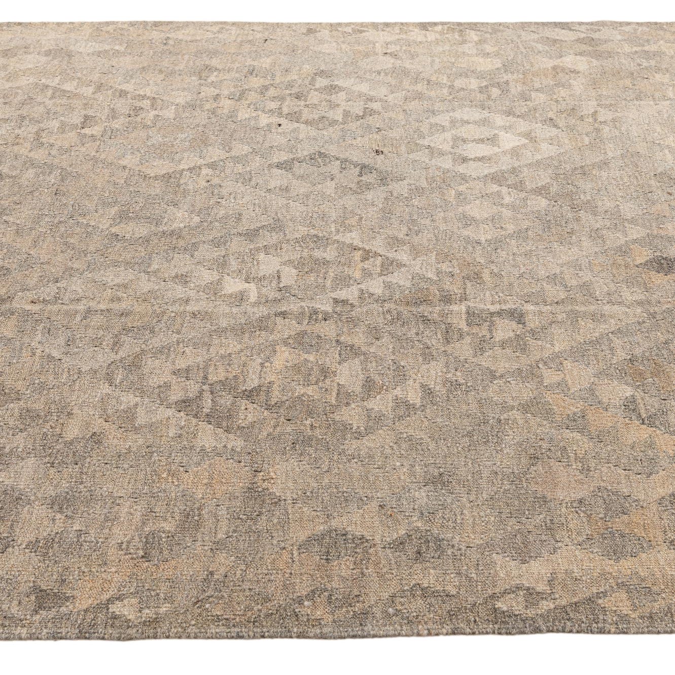 A 7x10 rectangular flatweave Kilim Maymana rug featuring a tribal geometric pattern in various shades of gray and silver.