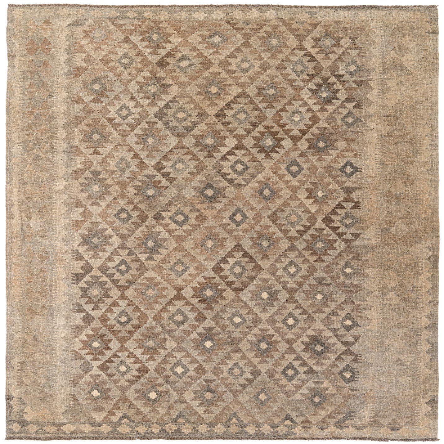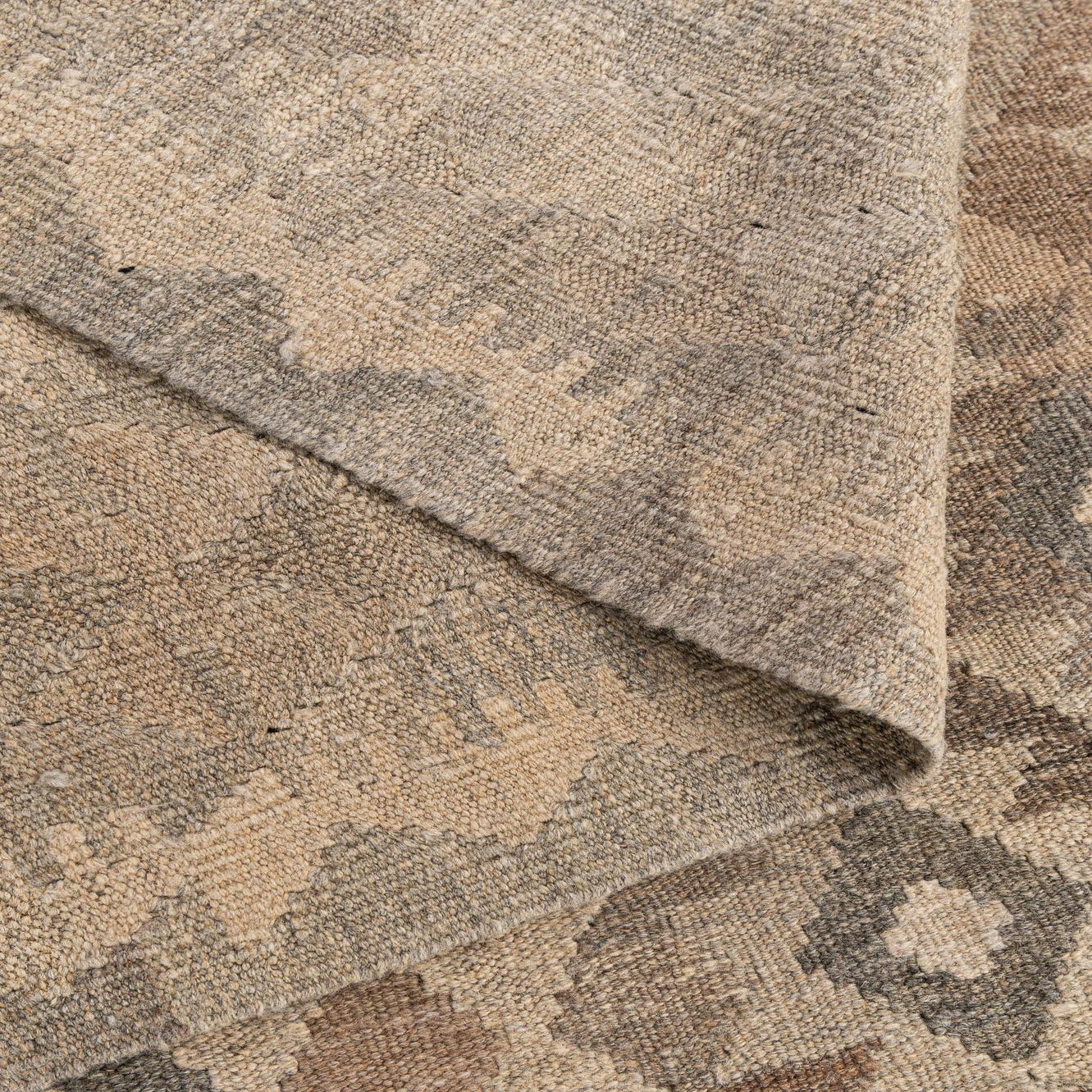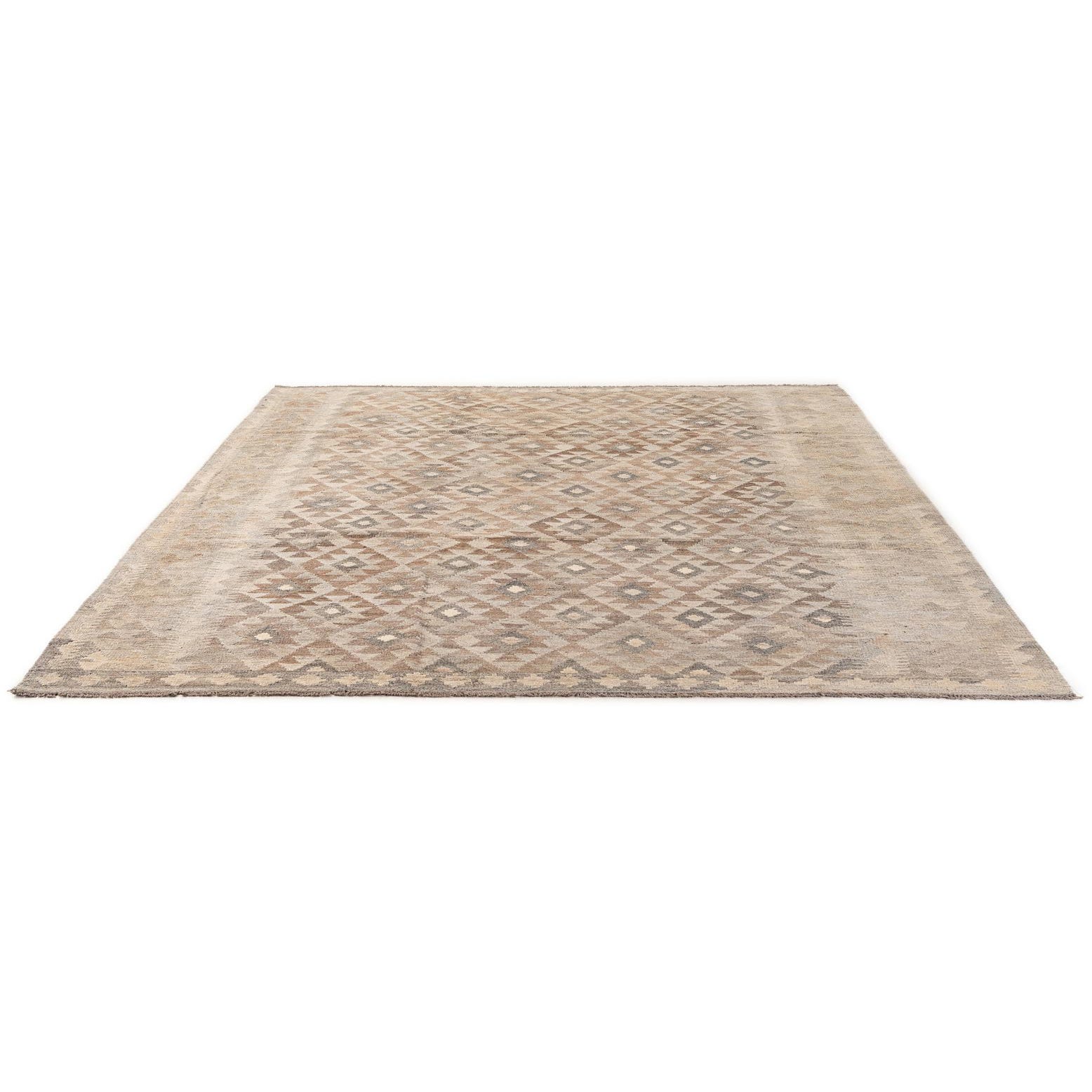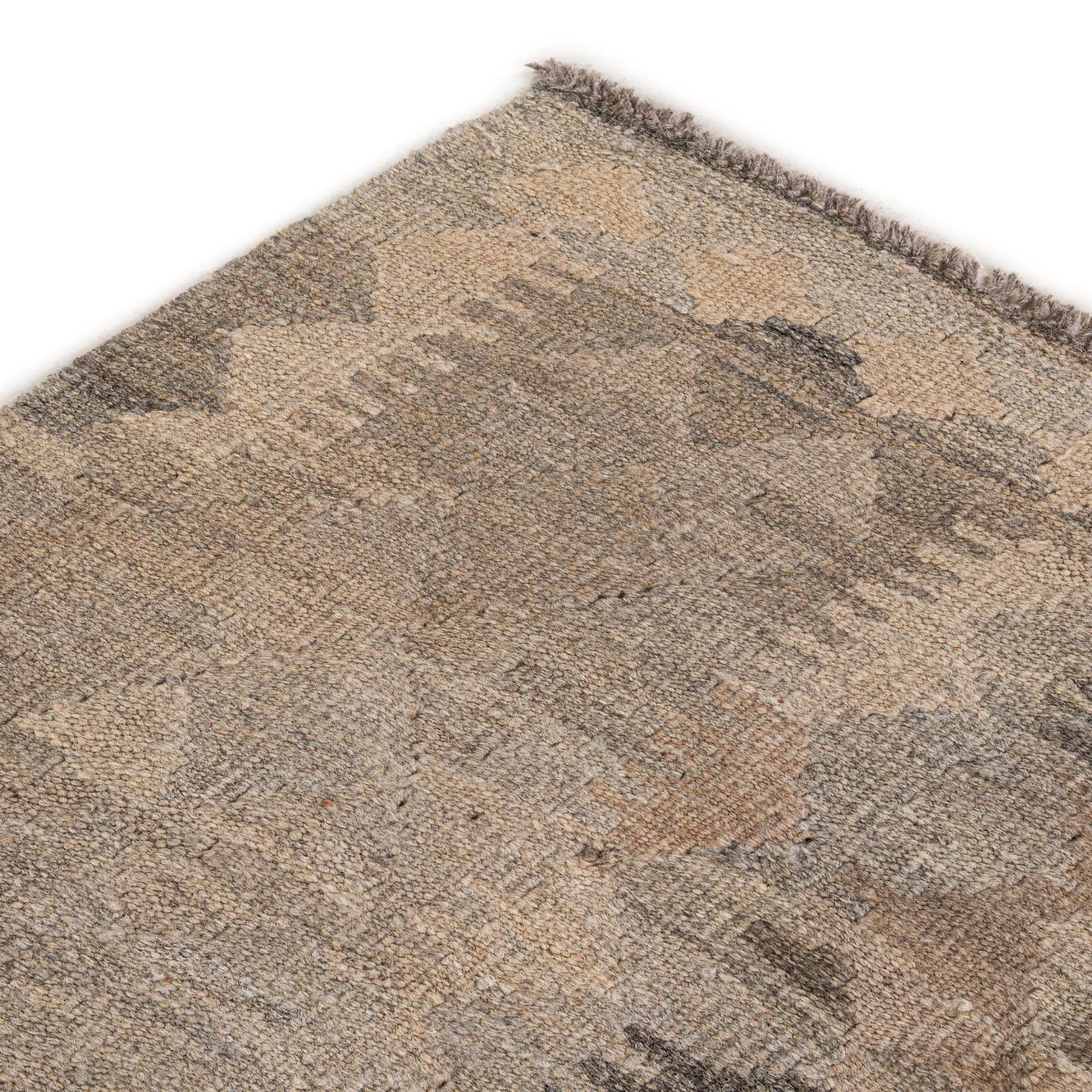 A 7x10 rectangular flatweave Kilim Maymana rug featuring a tribal geometric pattern in shades of gray and silver.