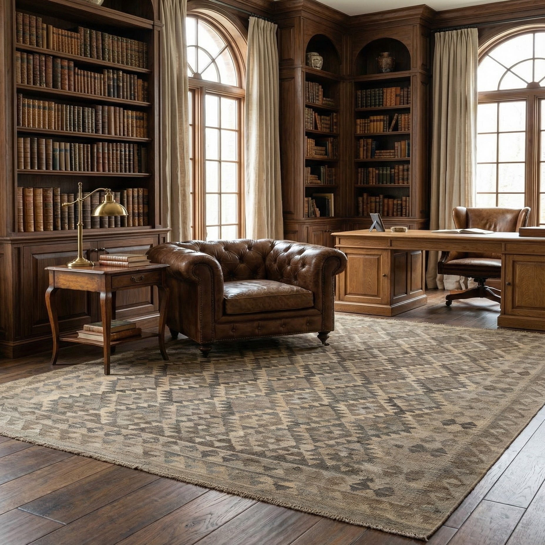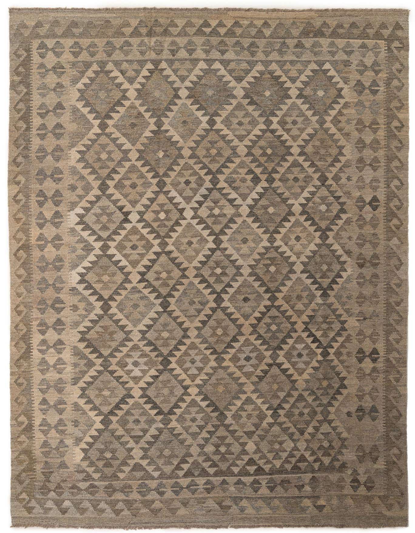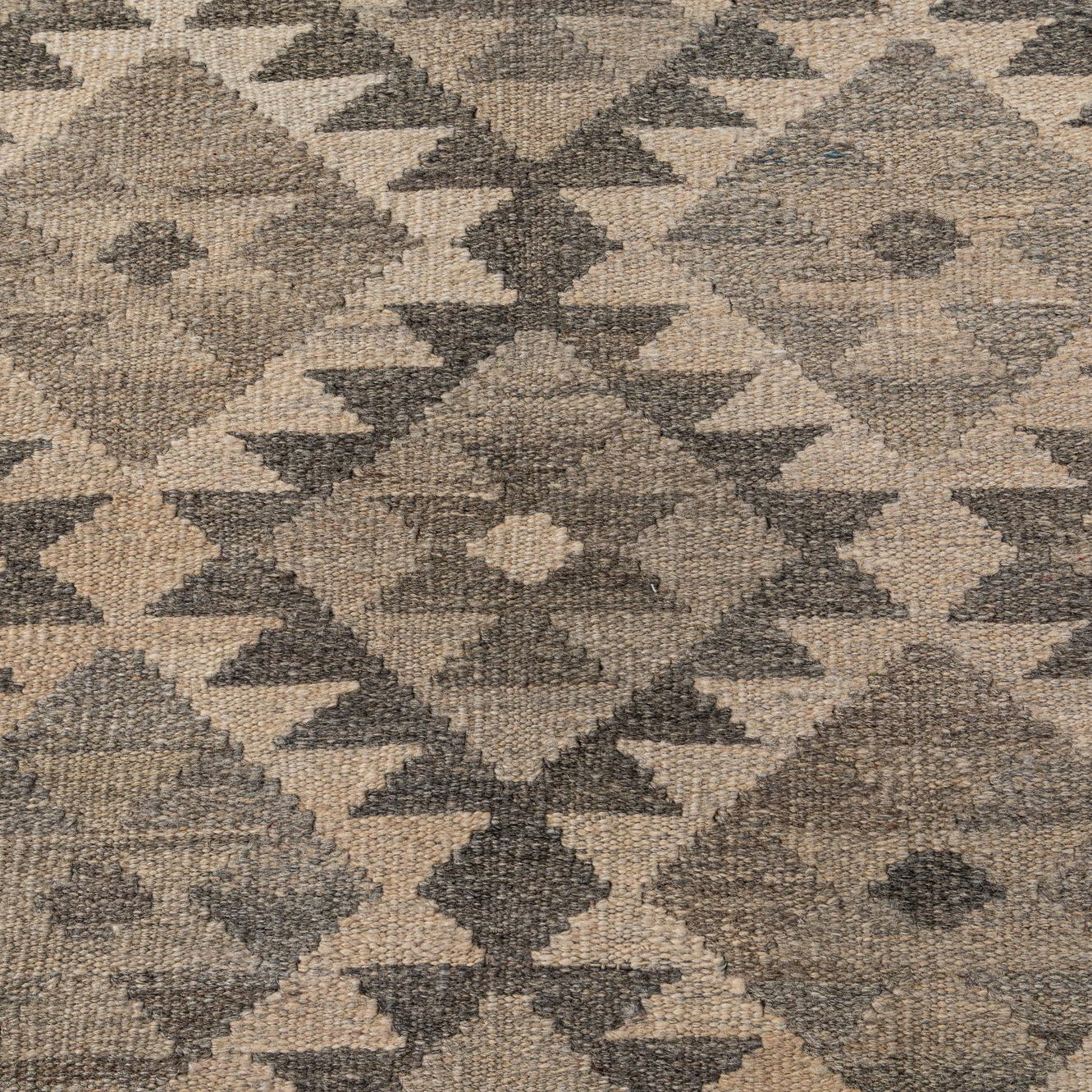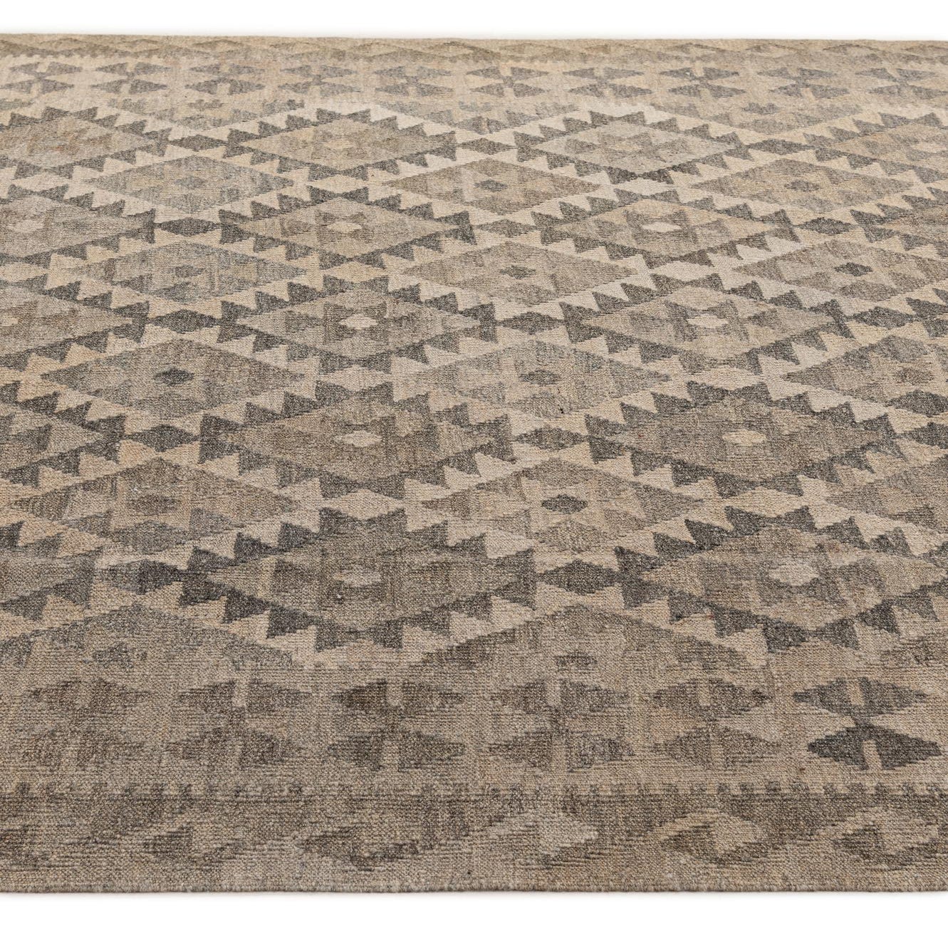 A 7x10 rectangular flatweave Kilim Maymana rug featuring a tribal diamond pattern in various shades of gray and beige.
