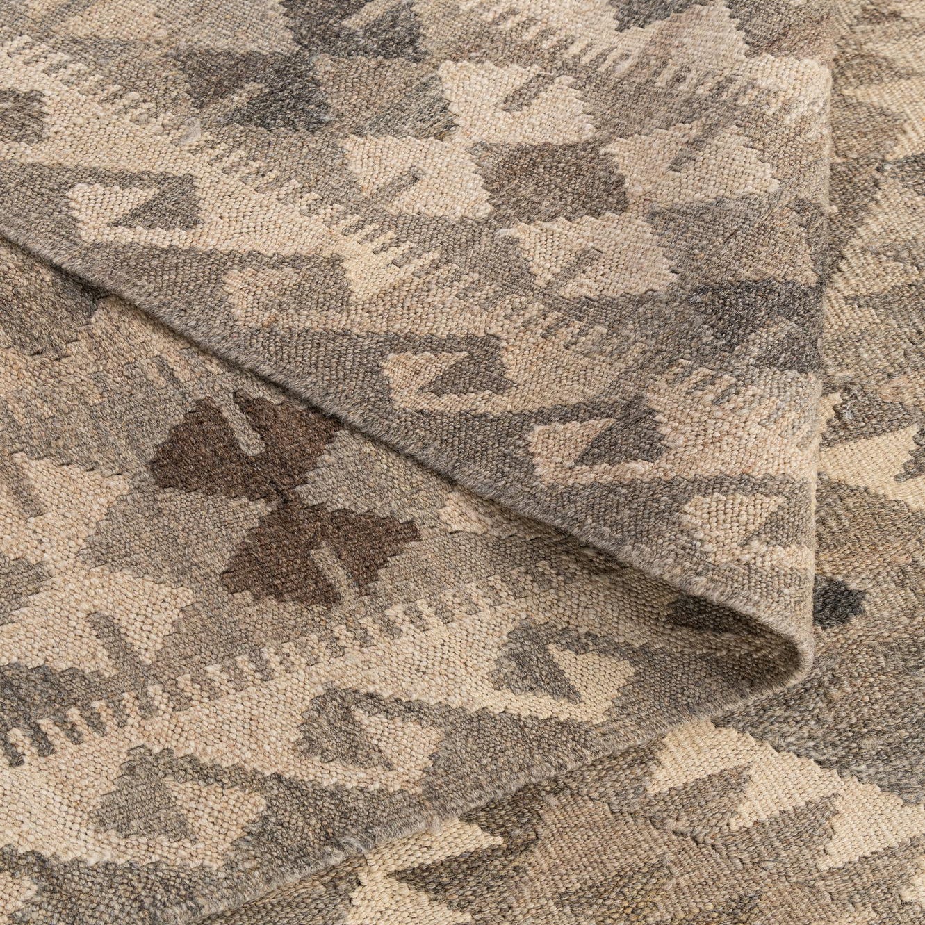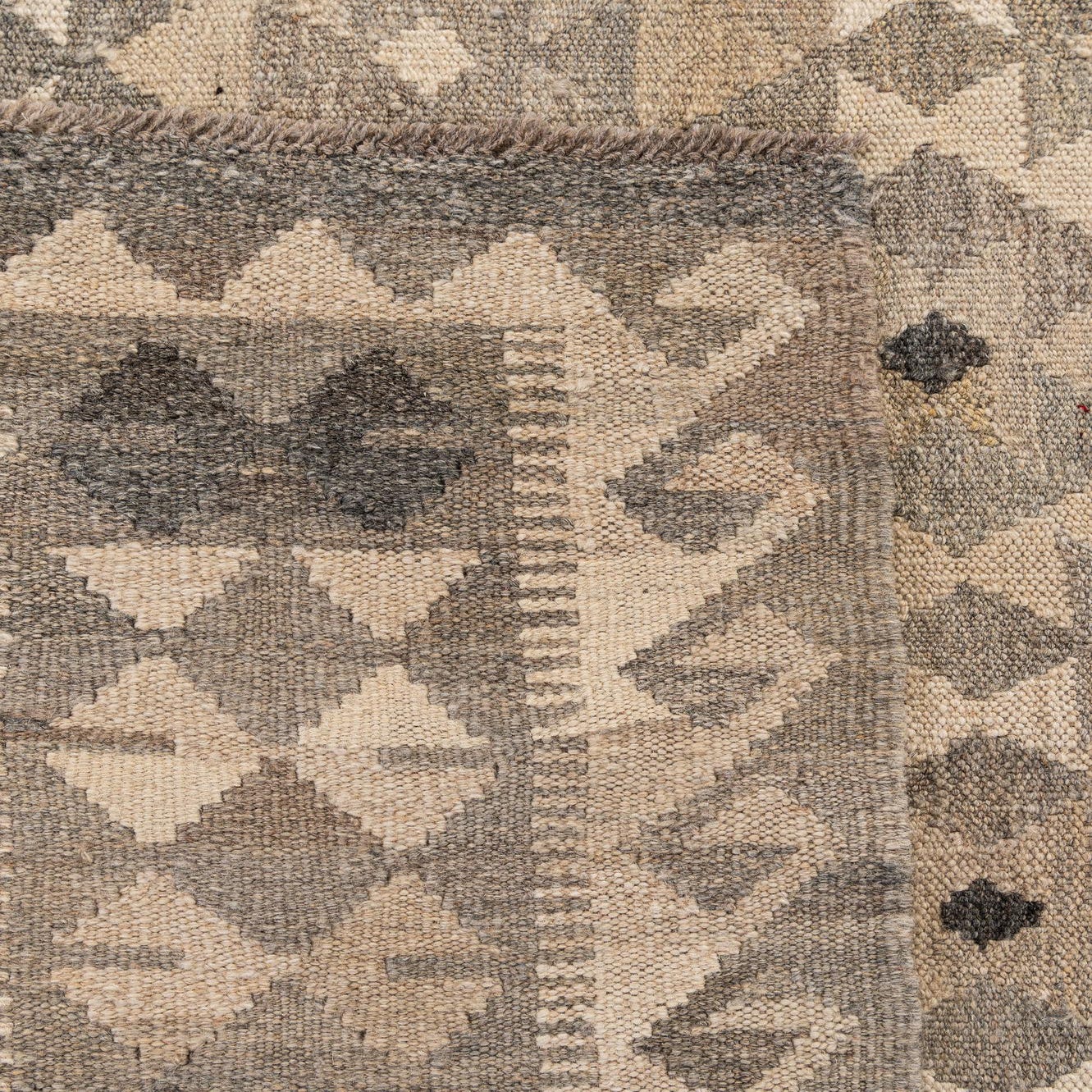 A 7x10 rectangular flatweave rug featuring a tribal geometric pattern in varying shades of gray, silver, and natural beige.
