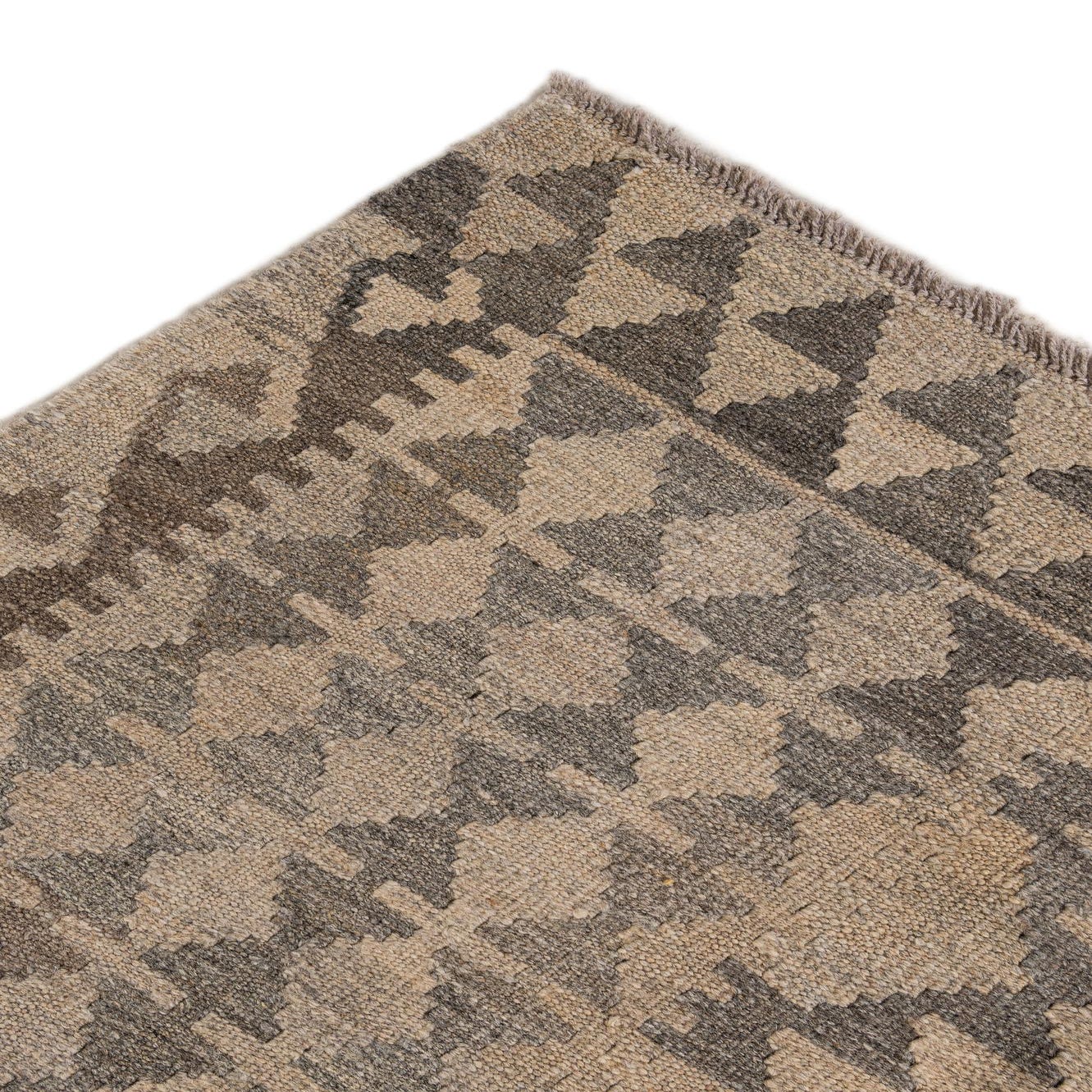 A 7x10 rectangular flatweave Kilim Maymana rug featuring a tribal diamond pattern in various shades of gray and silver.