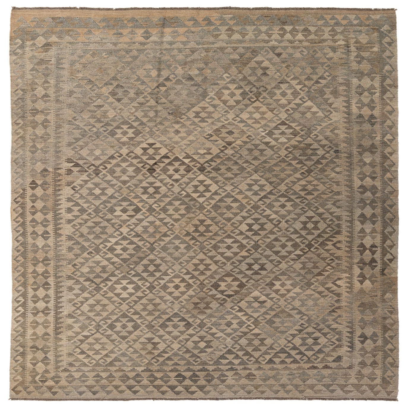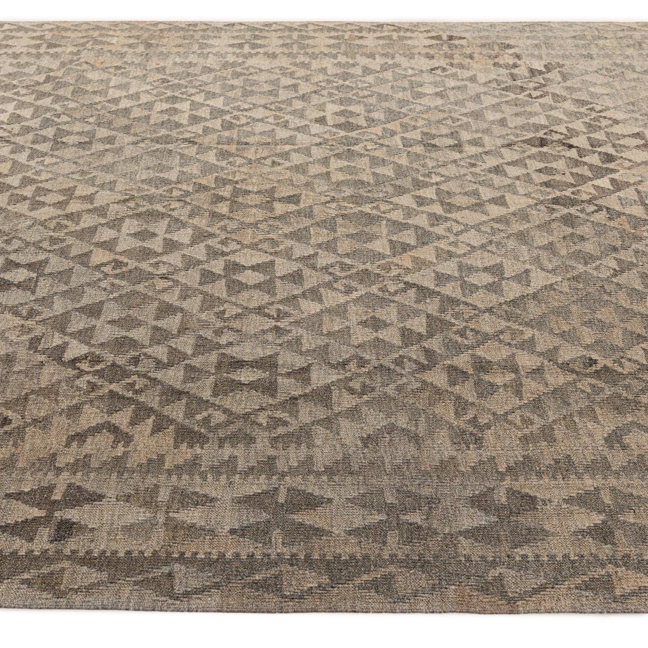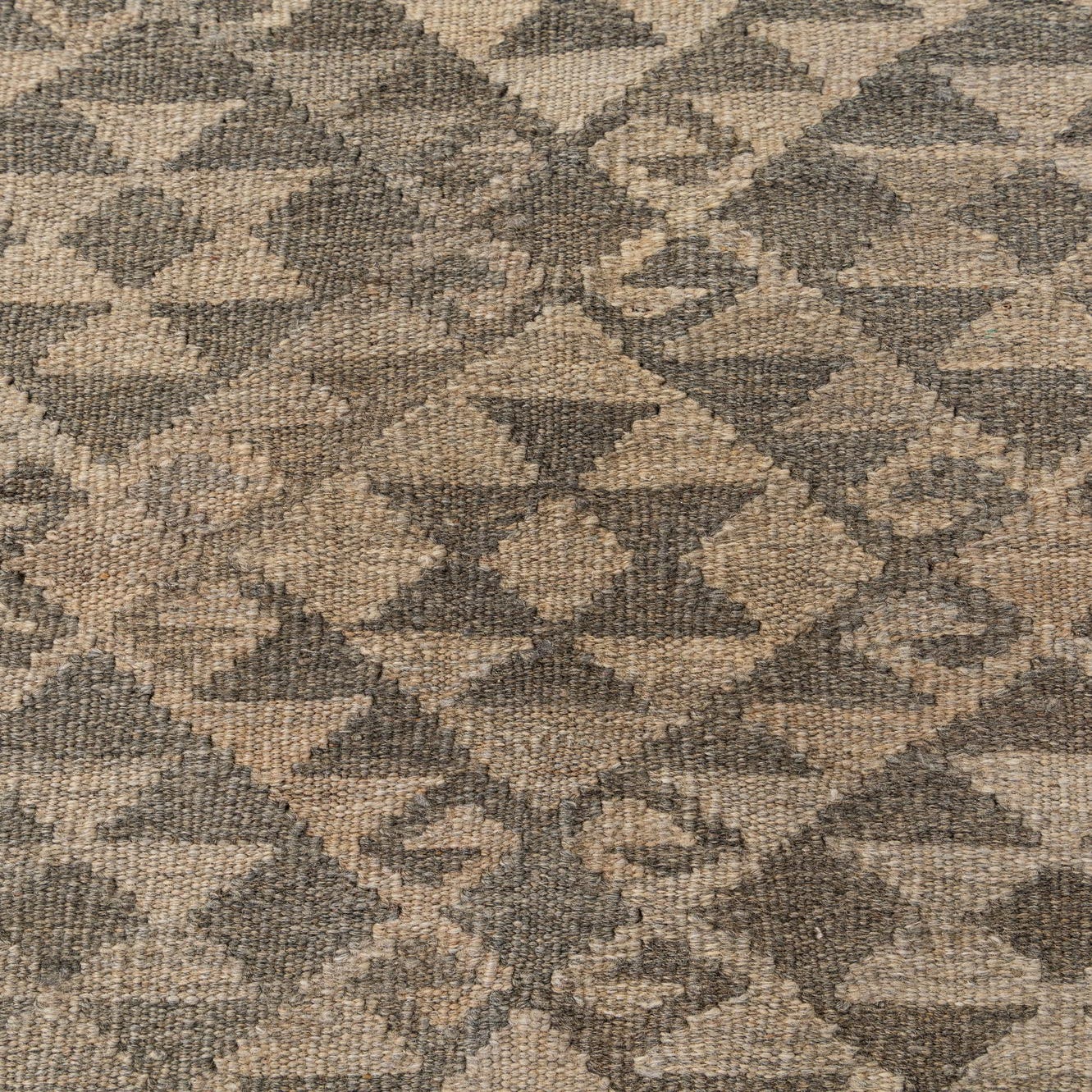A 7x10 rectangular Kilim Maymana wool rug featuring a tribal geometric pattern in varying shades of gray.