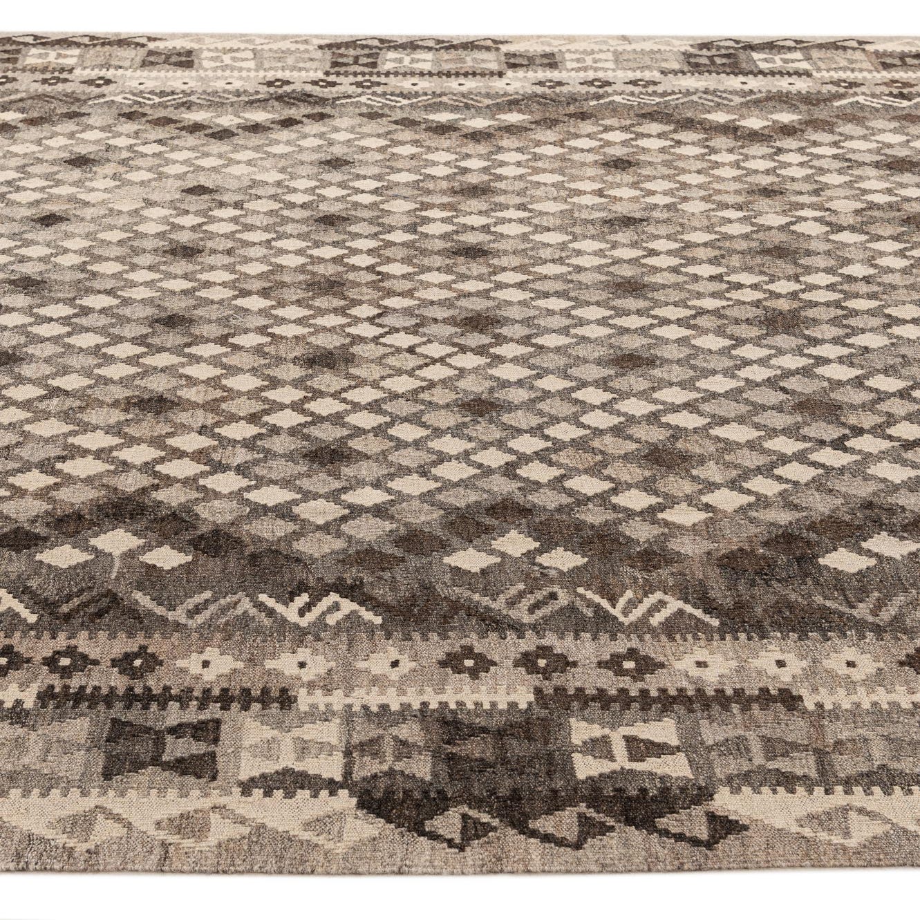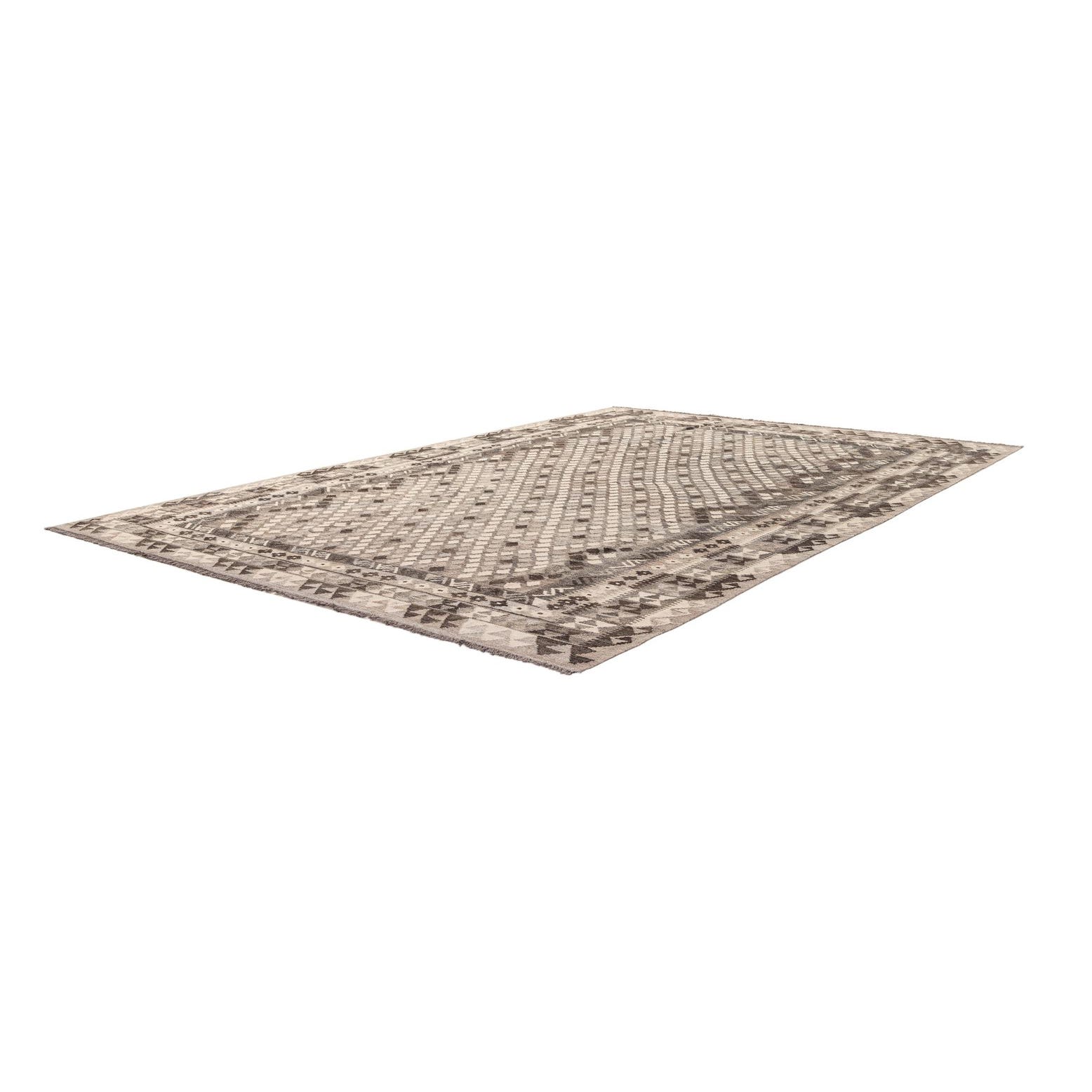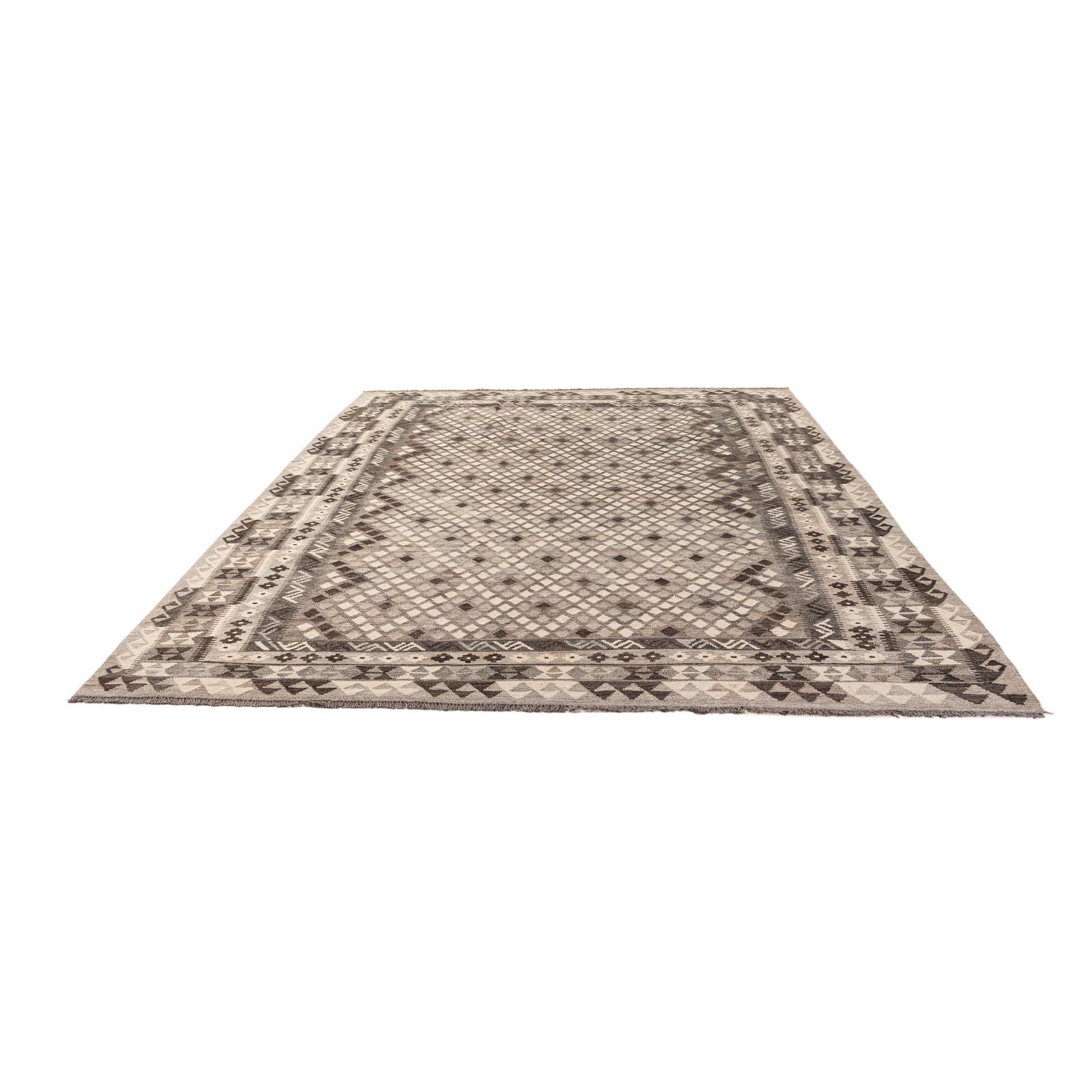 A 7x10 rectangular flatweave Kilim Maymana rug featuring a tribal diamond pattern in various shades of gray and silver.