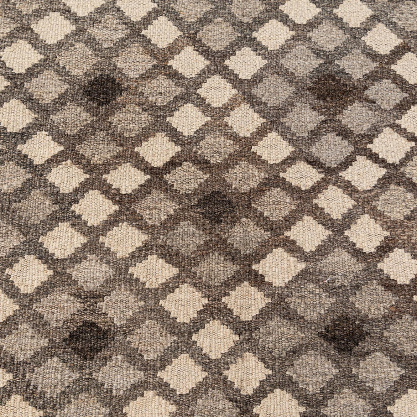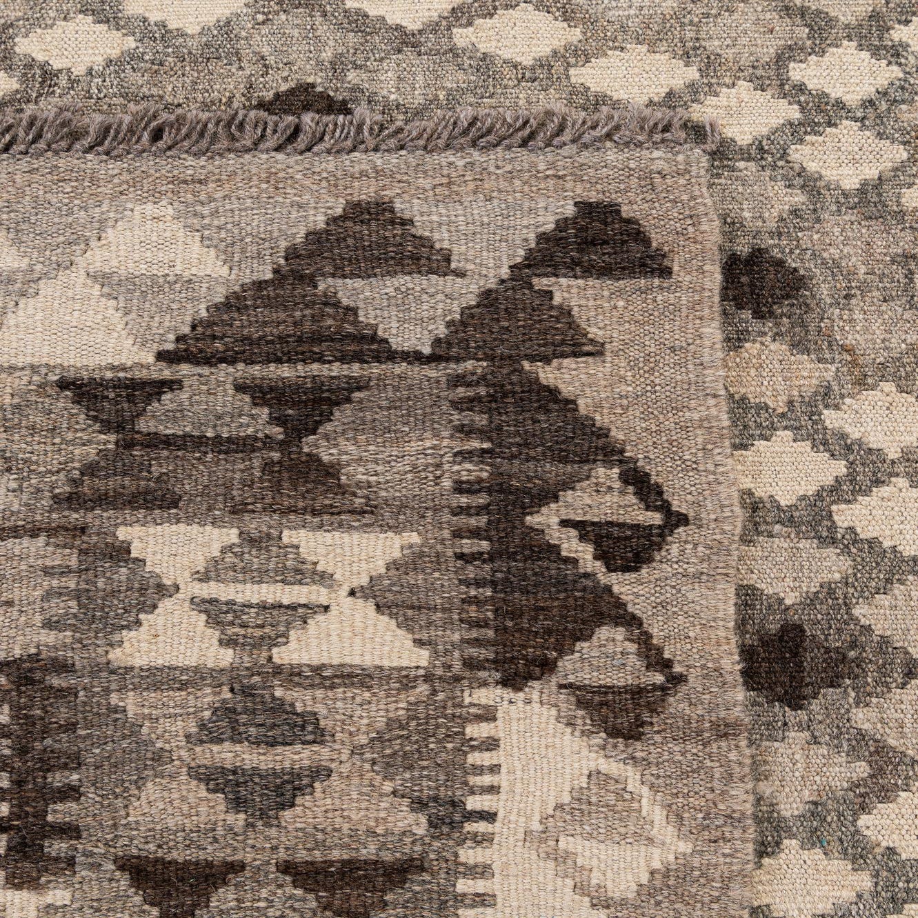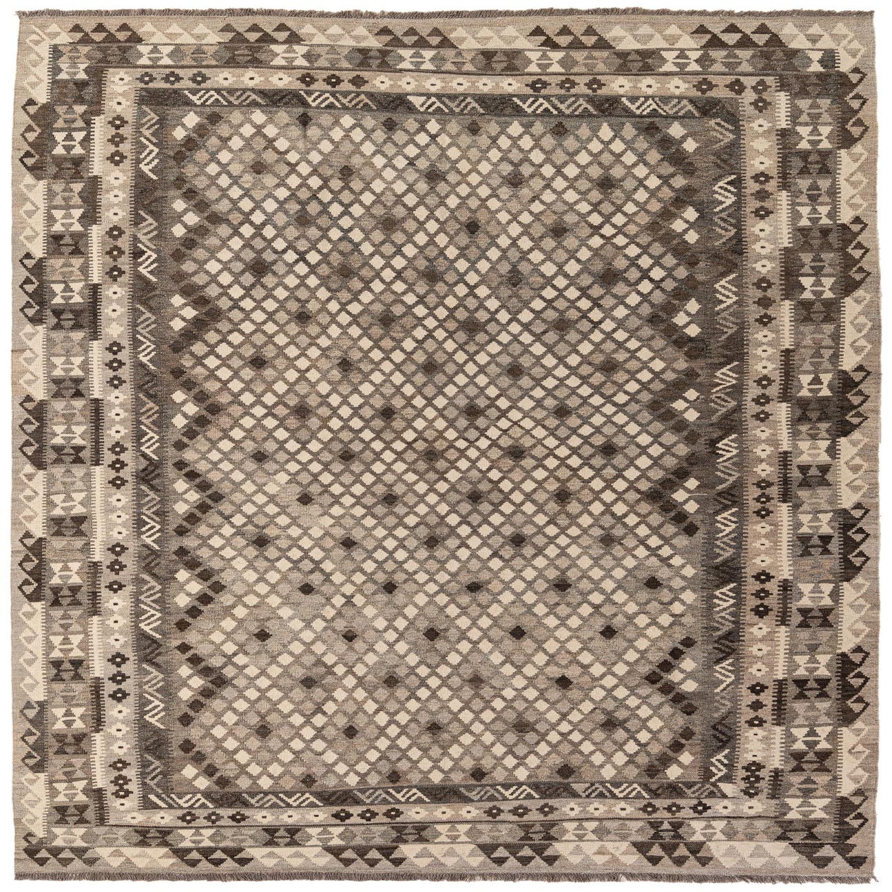 A 7x10 rectangular flatweave Kilim Maymana rug featuring a tribal diamond pattern in various shades of gray and silver.