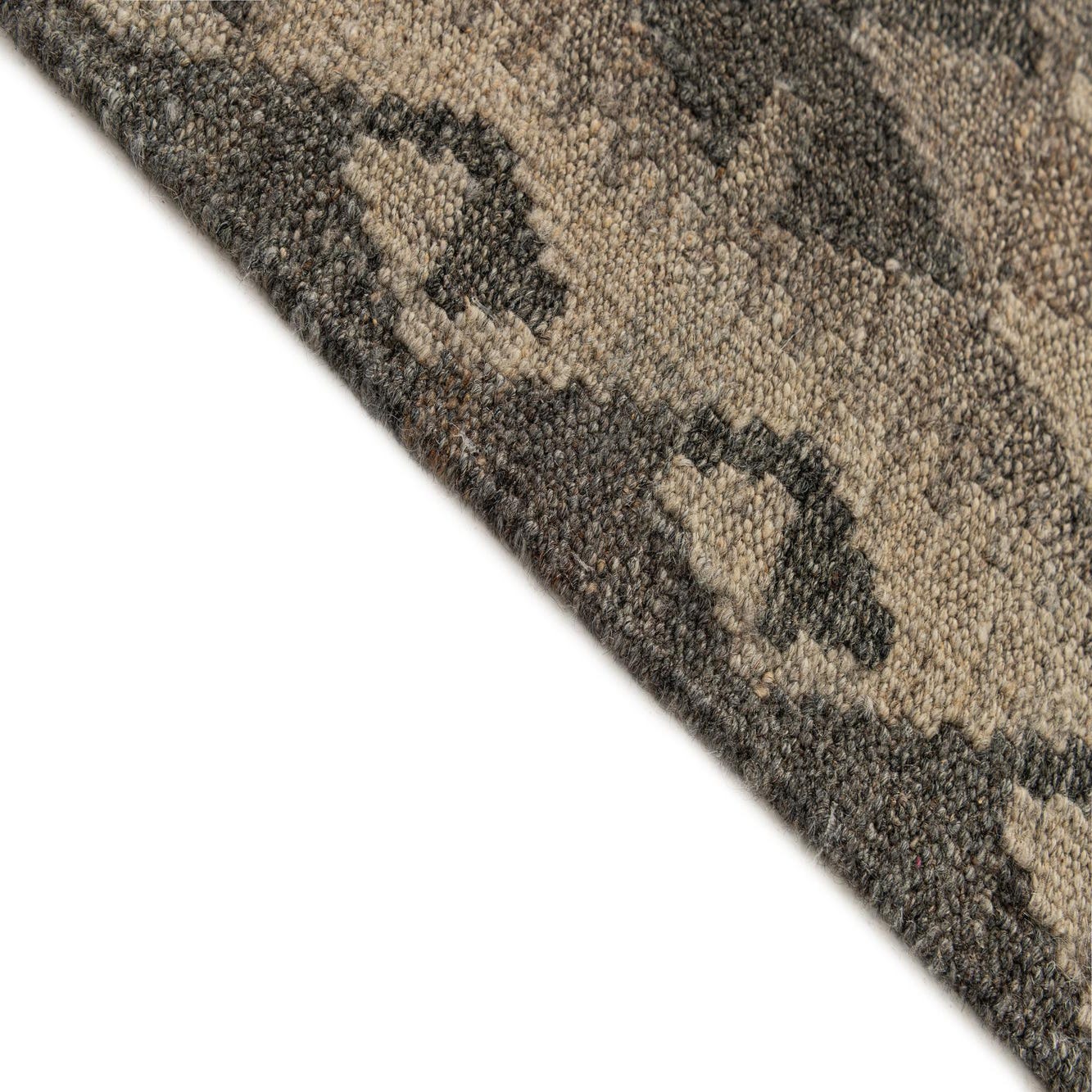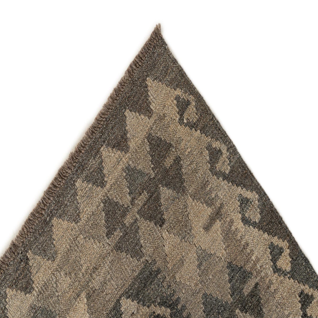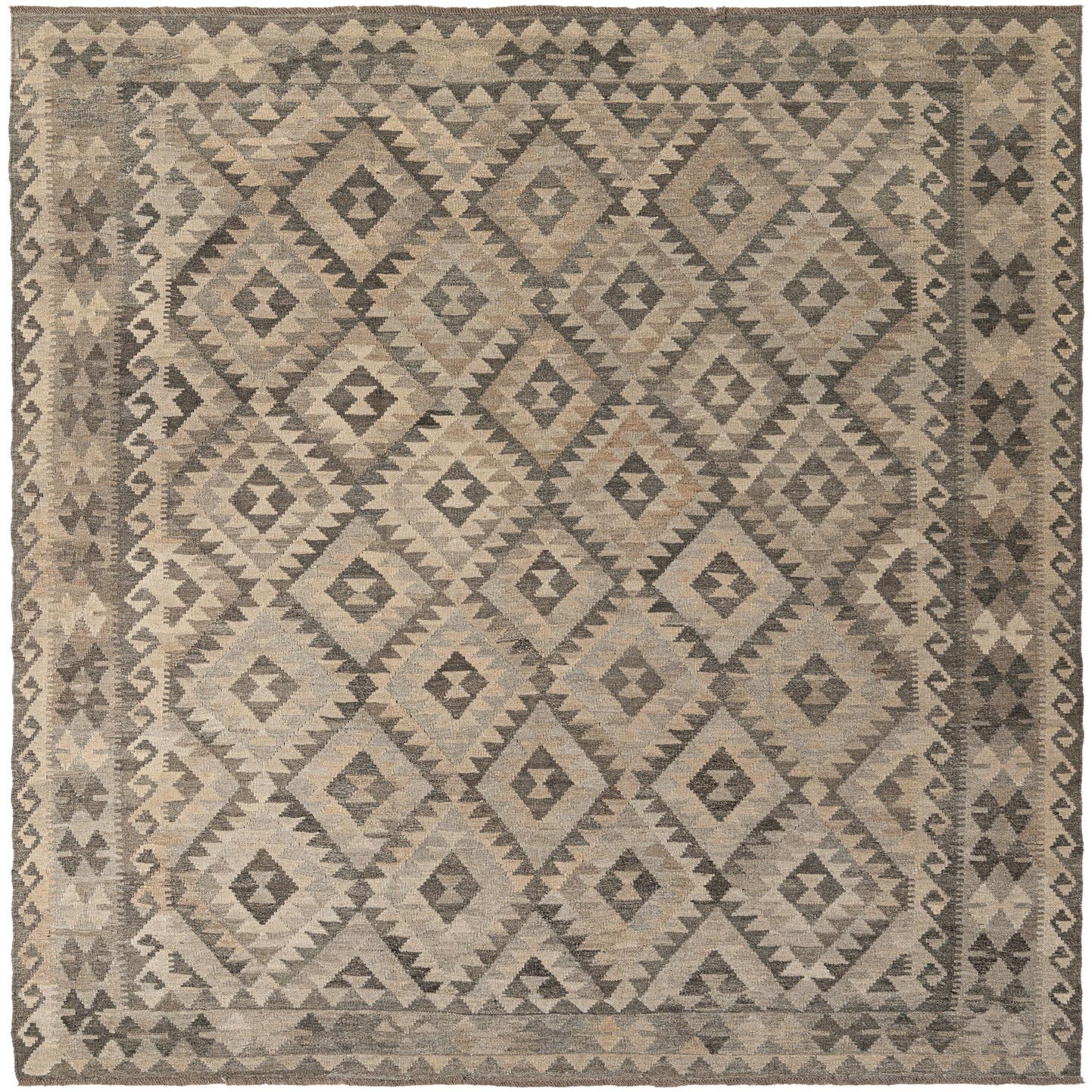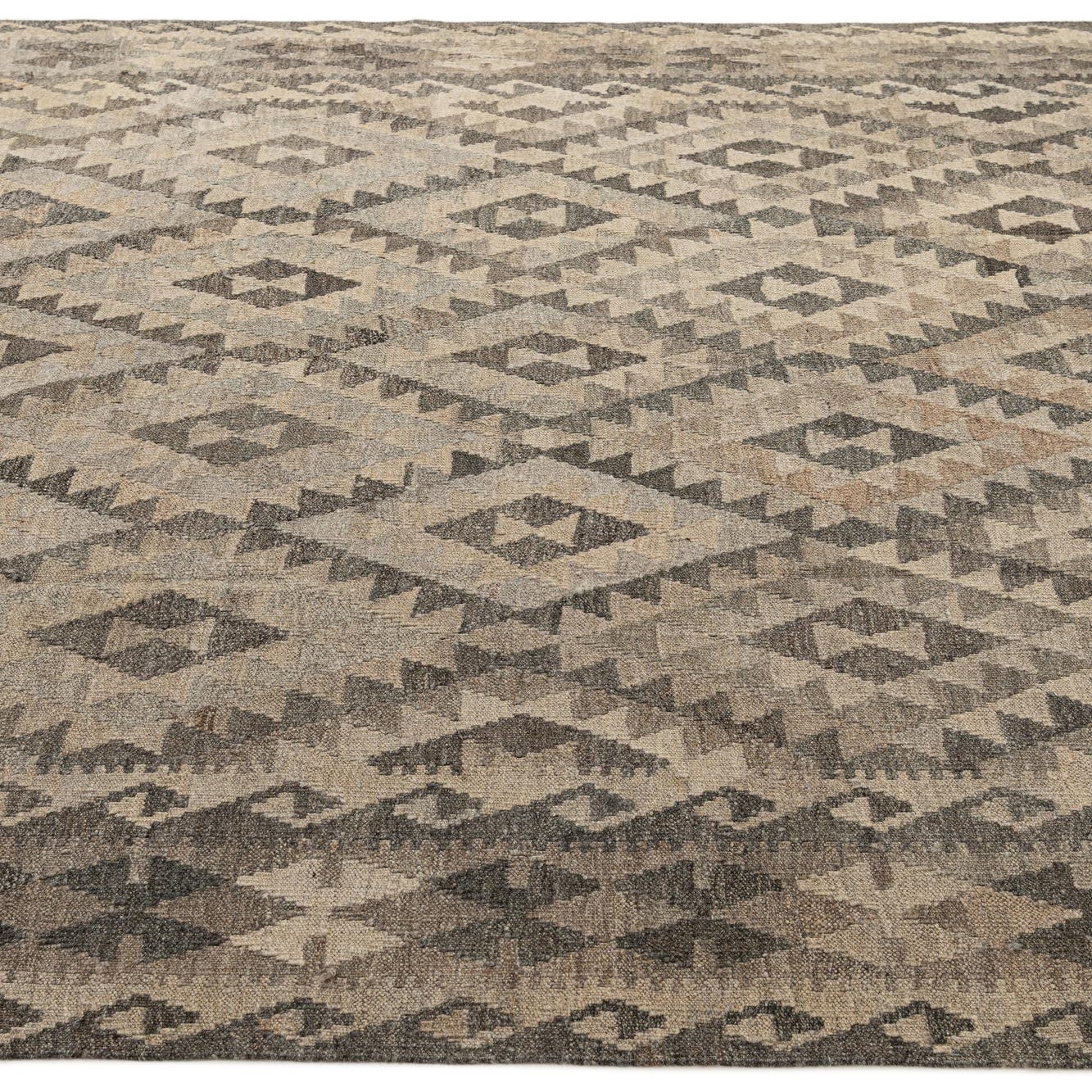 A 7x10 rectangular Kilim Maymana rug featuring a tribal geometric diamond pattern in varying shades of gray and silver.