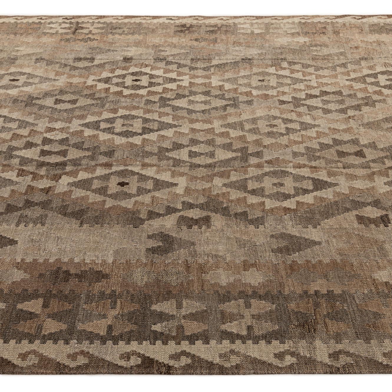 A 7x10 rectangular flatweave Kilim Maymana rug featuring a tribal geometric pattern in varying shades of gray and silver.