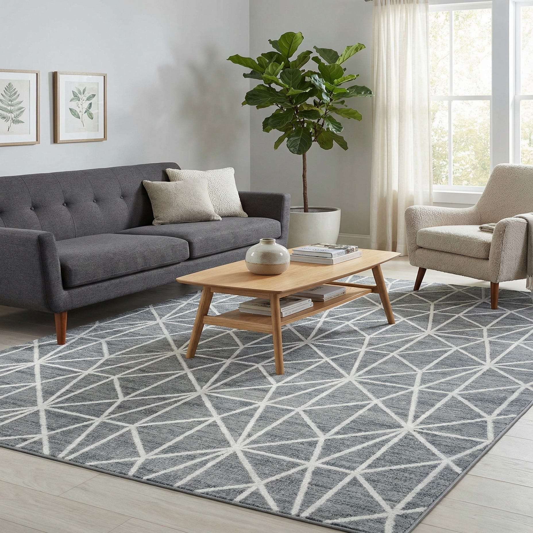 This neutral gray-and-ivory palette and modern geometric style work well in contemporary and transitional interiors. Place it to anchor a living room seating area, define a dining space, or add structure to a bedroom or home office. It pairs easily with warm wood tones and cool metal accents, or layered with soft textiles and neutral furnishings for a balanced, pulled-together look.