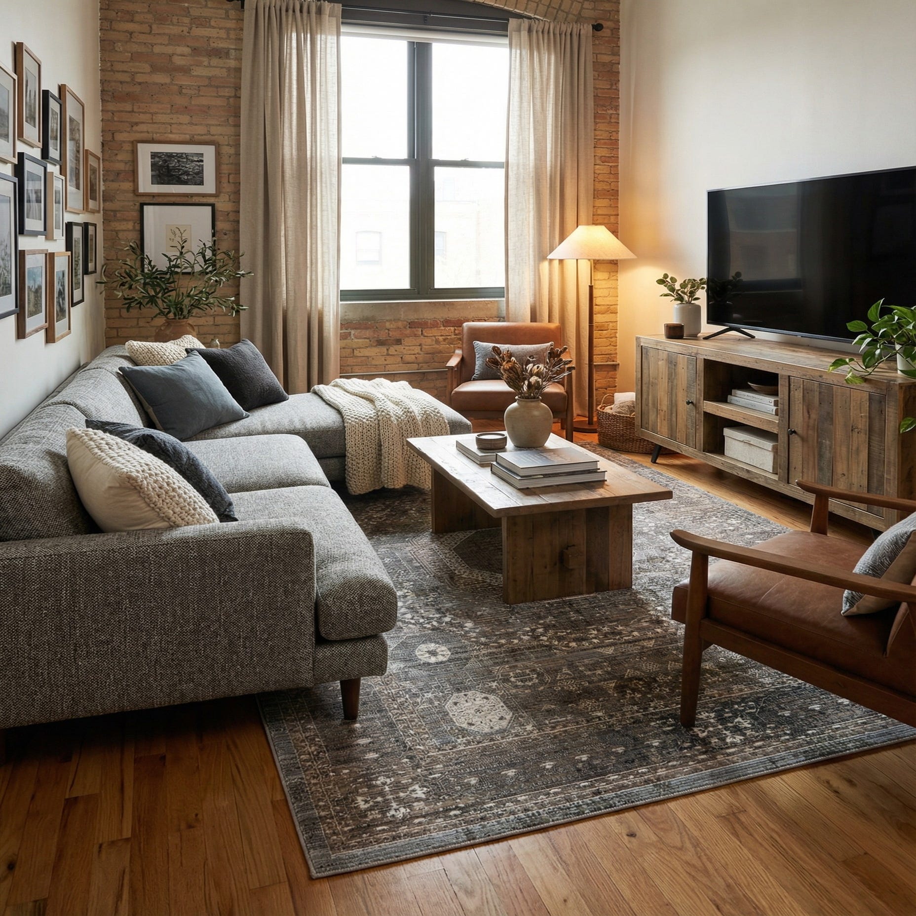 Primary color is Gray. Colors in this rug include: Gray, Brown, Ivory, Olive, Beige.