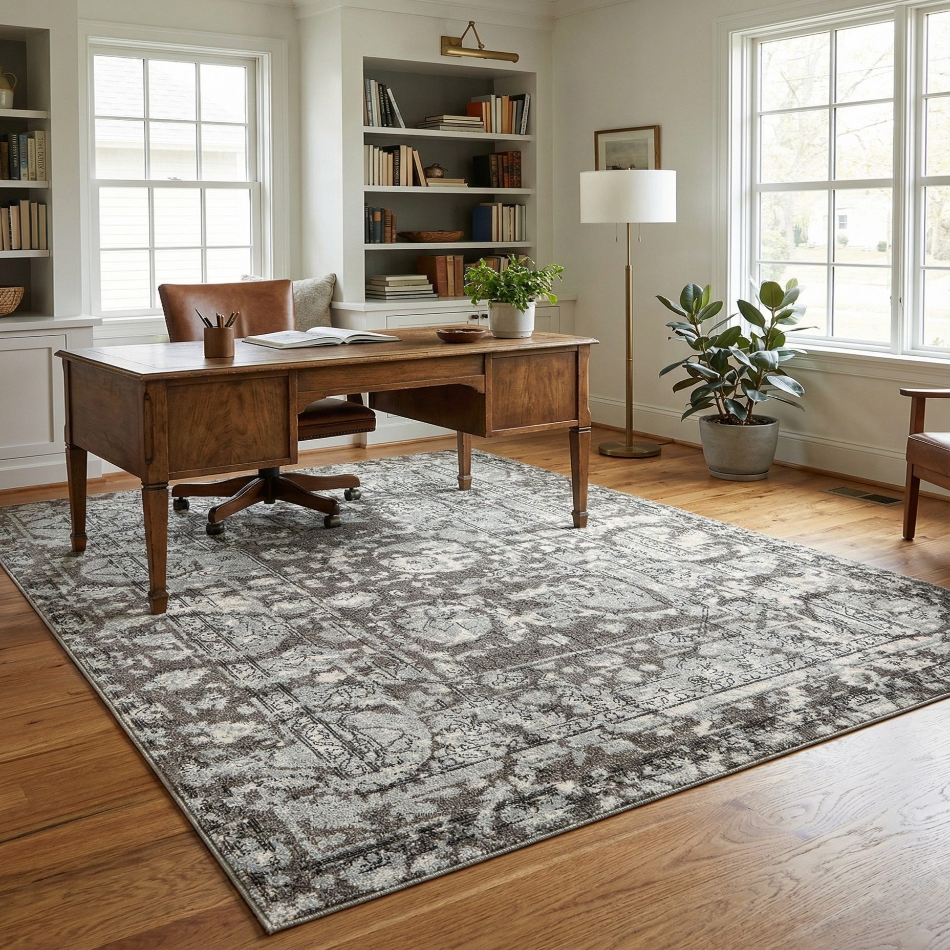 This rug works well anchored beneath a living room seating group, layered at the foot of a bed, or centered under a dining table to bring quiet pattern and neutral contrast to a space. It complements transitional and contemporary palettes—pair it with cool woods, steel or chrome accents, and soft neutrals—or use it to temper richer, darker furnishings in a study or family room. The neutral gray base and silver-ivory highlights make it easy to coordinate while adding visual interest without overwhelming a room.