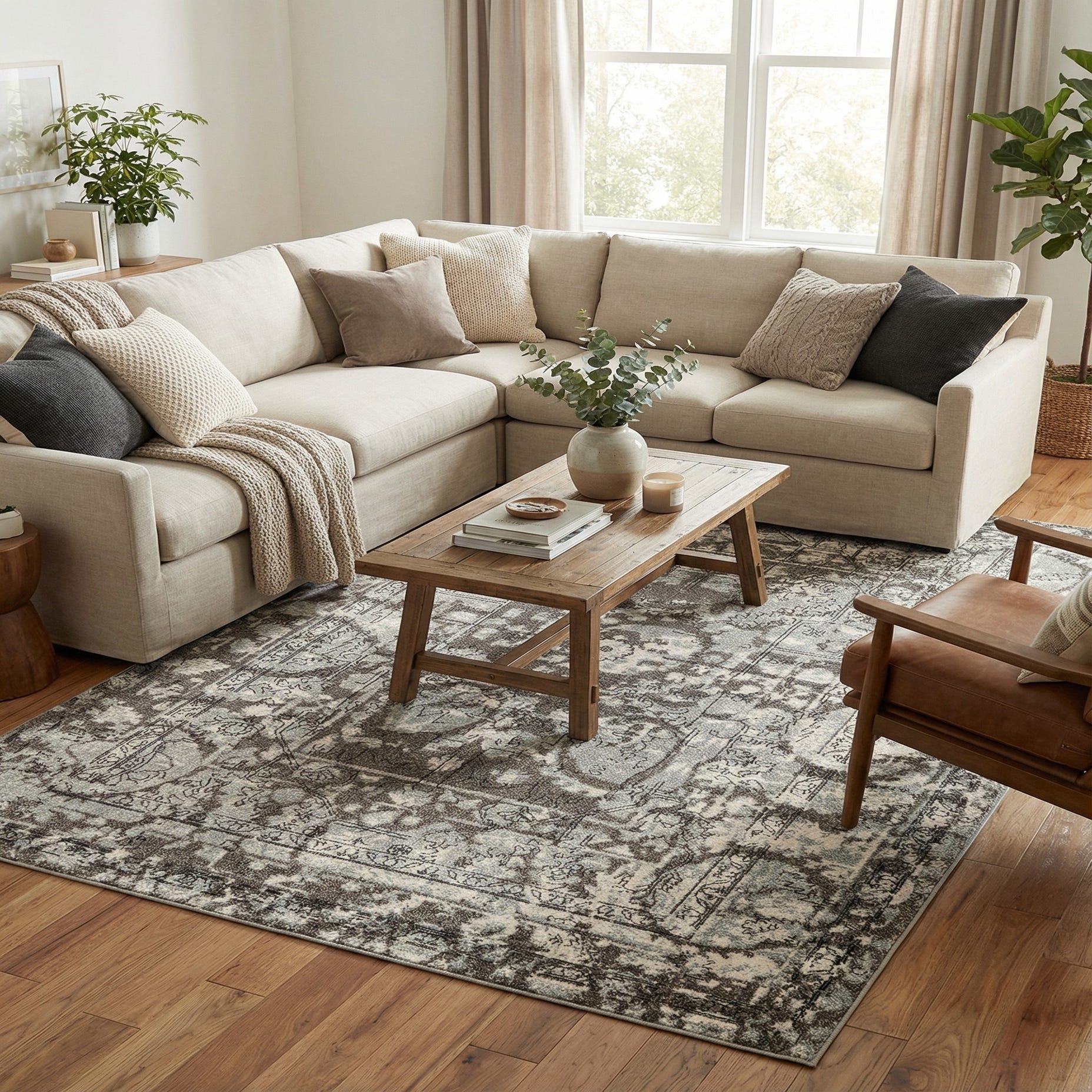 A soft, low-profile pile gives this machine-made rug a gentle, welcoming feel underfoot. Woven from 100% polypropylene, the surface pairs a muted, gray background with silver and ivory highlights to create a distressed, vintage-inspired medallion and border layout. Ornamental floral and scroll details float across the face in a layered, tonal way, offering the look of a timeworn antique with a clean, modern finish. The tight weave and subtle variation in pile create a textured effect you can both see and feel.