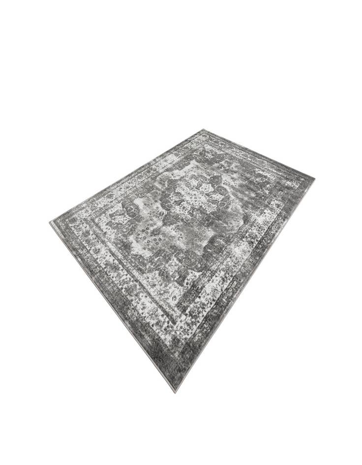 A 7x10 rectangular Monte Carlo rug in shades of gray and silver, featuring a distressed medallion and border pattern.