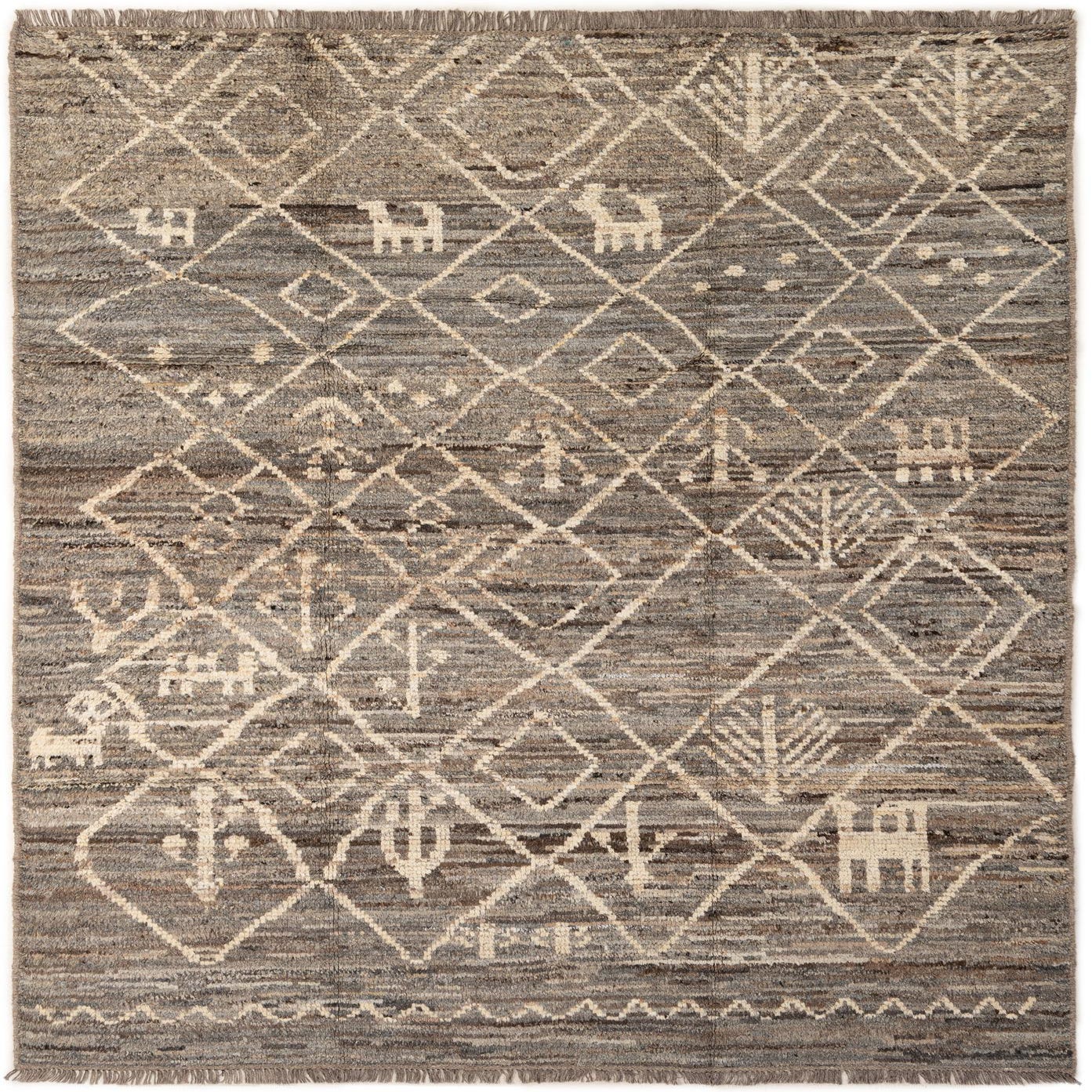 A 7x10 rectangular gray wool rug with a tribal pattern of light diamond lattice and abstract symbols.