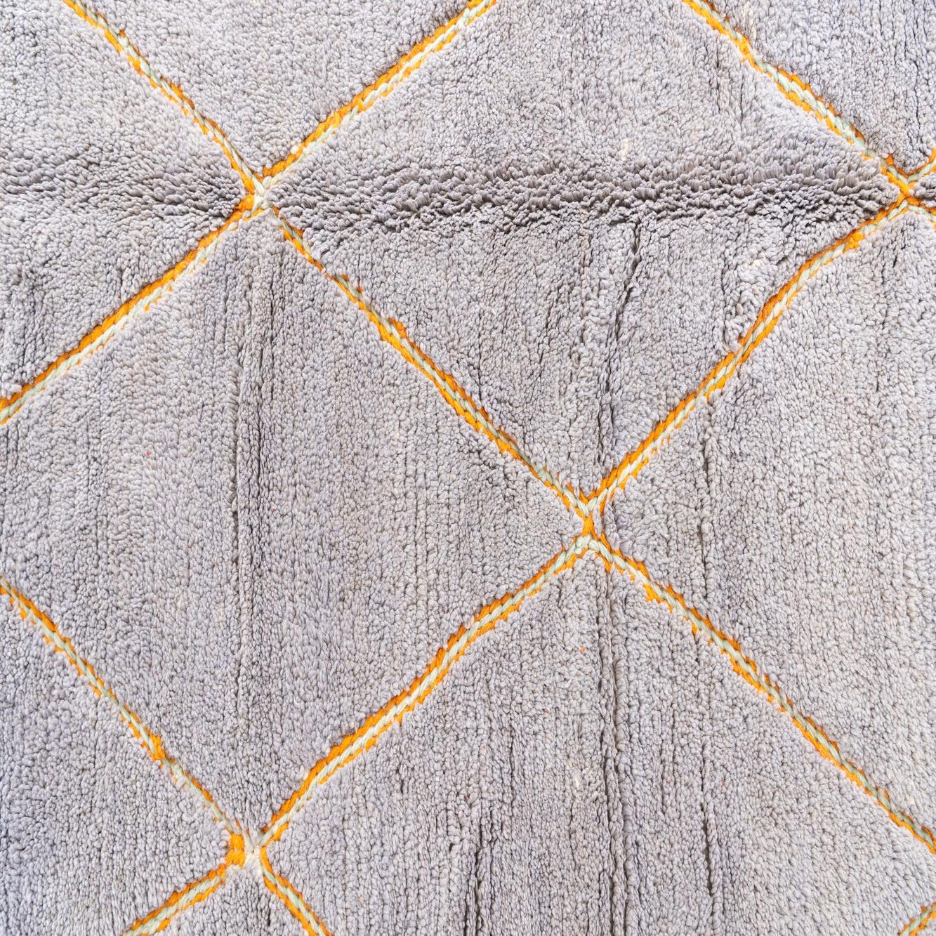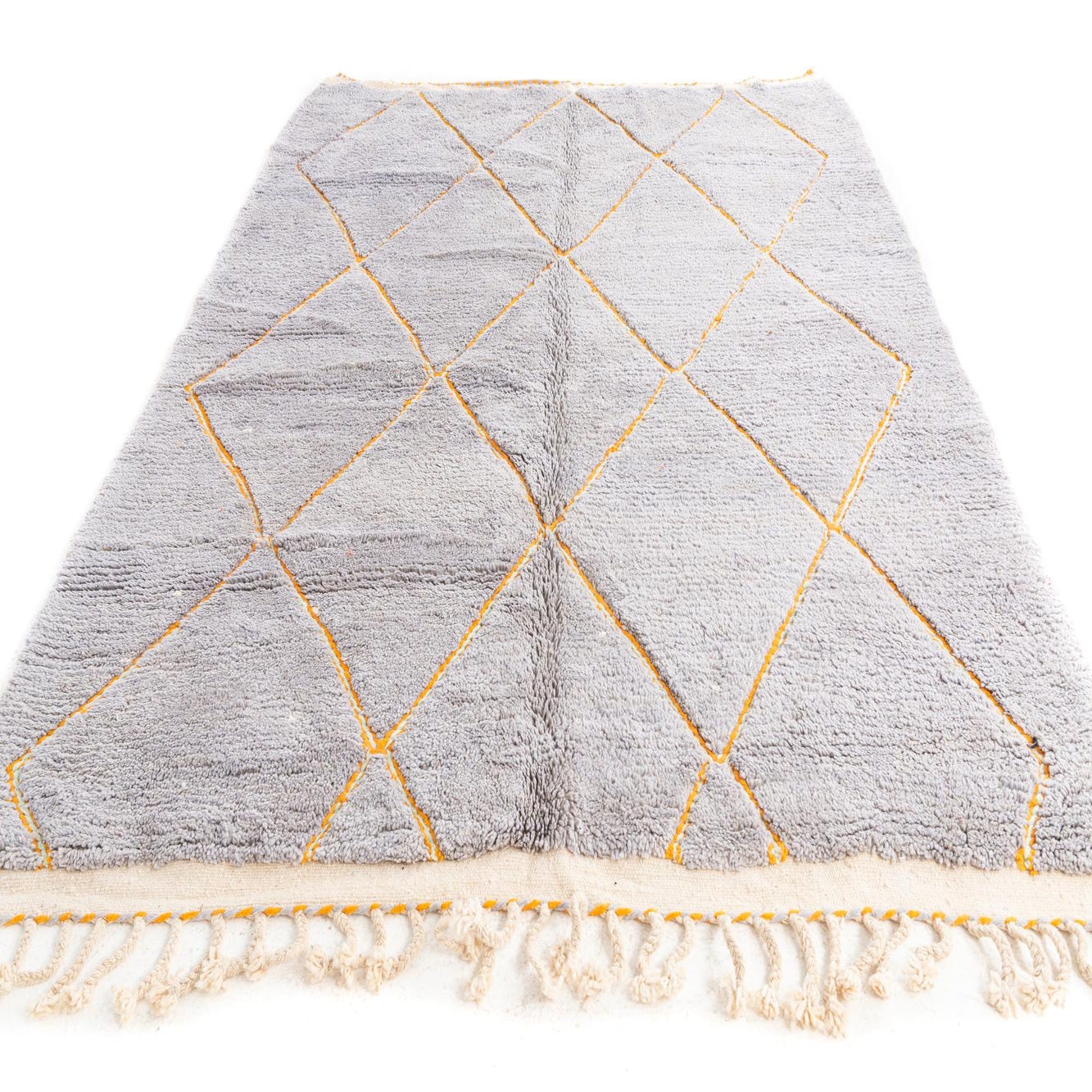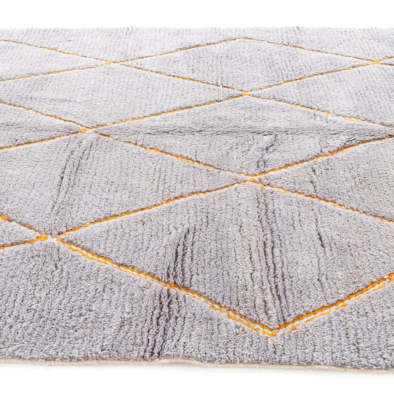 This hand-knotted Moroccan collection rug, measuring 7x10, embodies a tasteful blend of traditional design and understated elegance. The piece is crafted from 100% wool, showcasing a durable and plush texture that is comfortable underfoot. A gray base provides a versatile backdrop for the distinctive geometric pattern, which is delineated by lines of light green and yellow, adding a subtle hint of color to the design. The fringe detailing at the ends of the rug adds an authentic touch, characteristic of genuine handcrafted textiles.