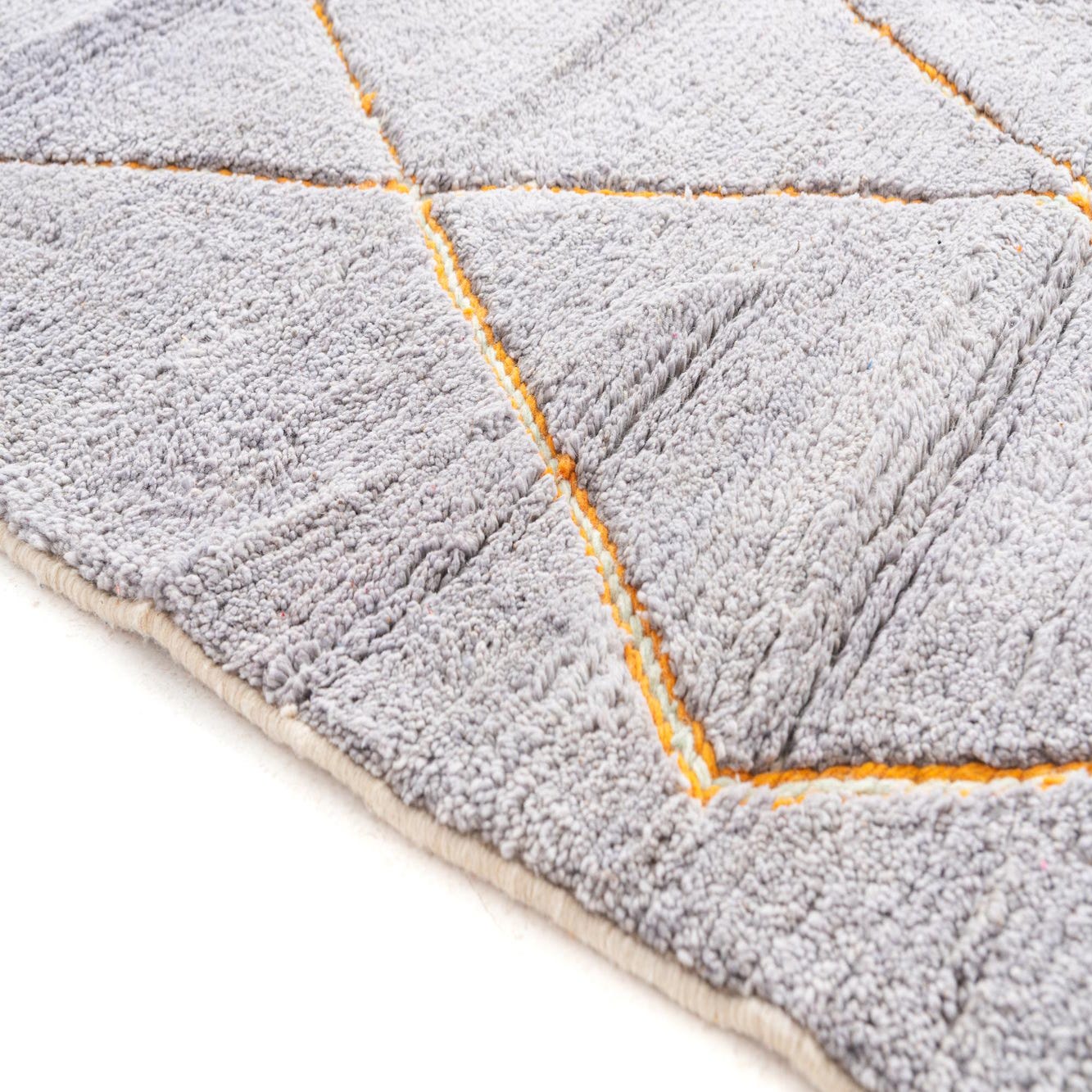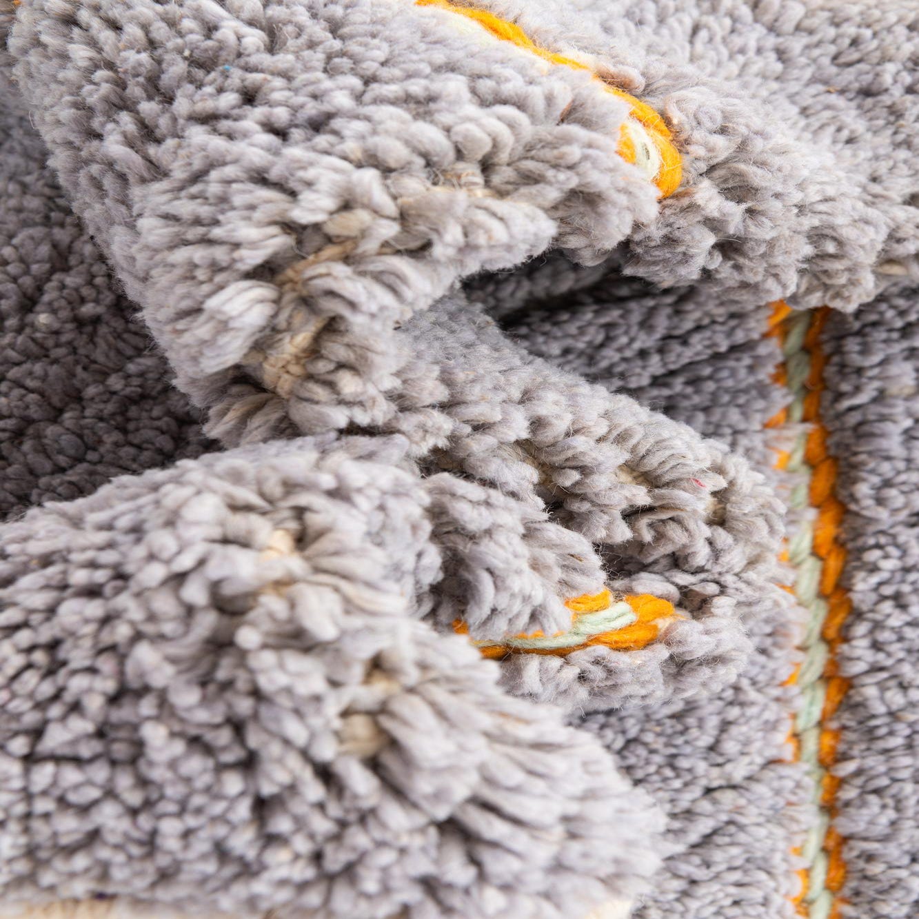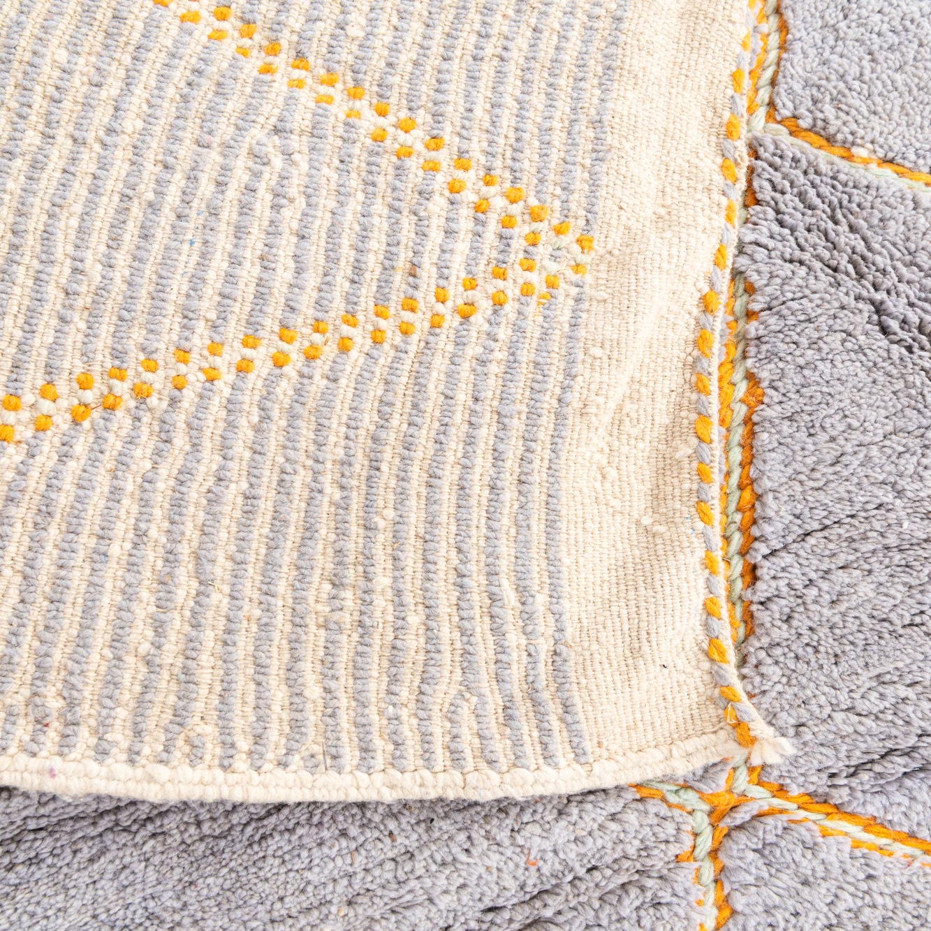 This hand-knotted Moroccan collection rug, measuring 7x10, embodies a tasteful blend of traditional design and understated elegance. The piece is crafted from 100% wool, showcasing a durable and plush texture that is comfortable underfoot. A gray base provides a versatile backdrop for the distinctive geometric pattern, which is delineated by lines of light green and yellow, adding a subtle hint of color to the design. The fringe detailing at the ends of the rug adds an authentic touch, characteristic of genuine handcrafted textiles.