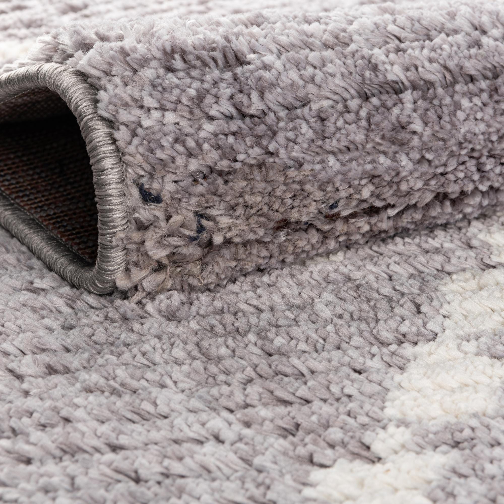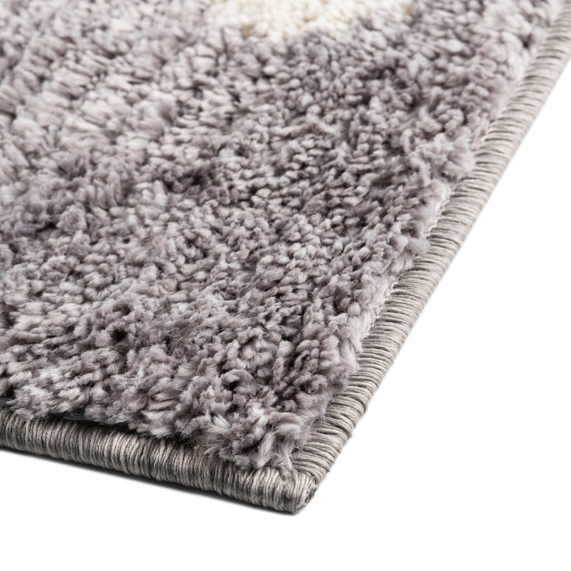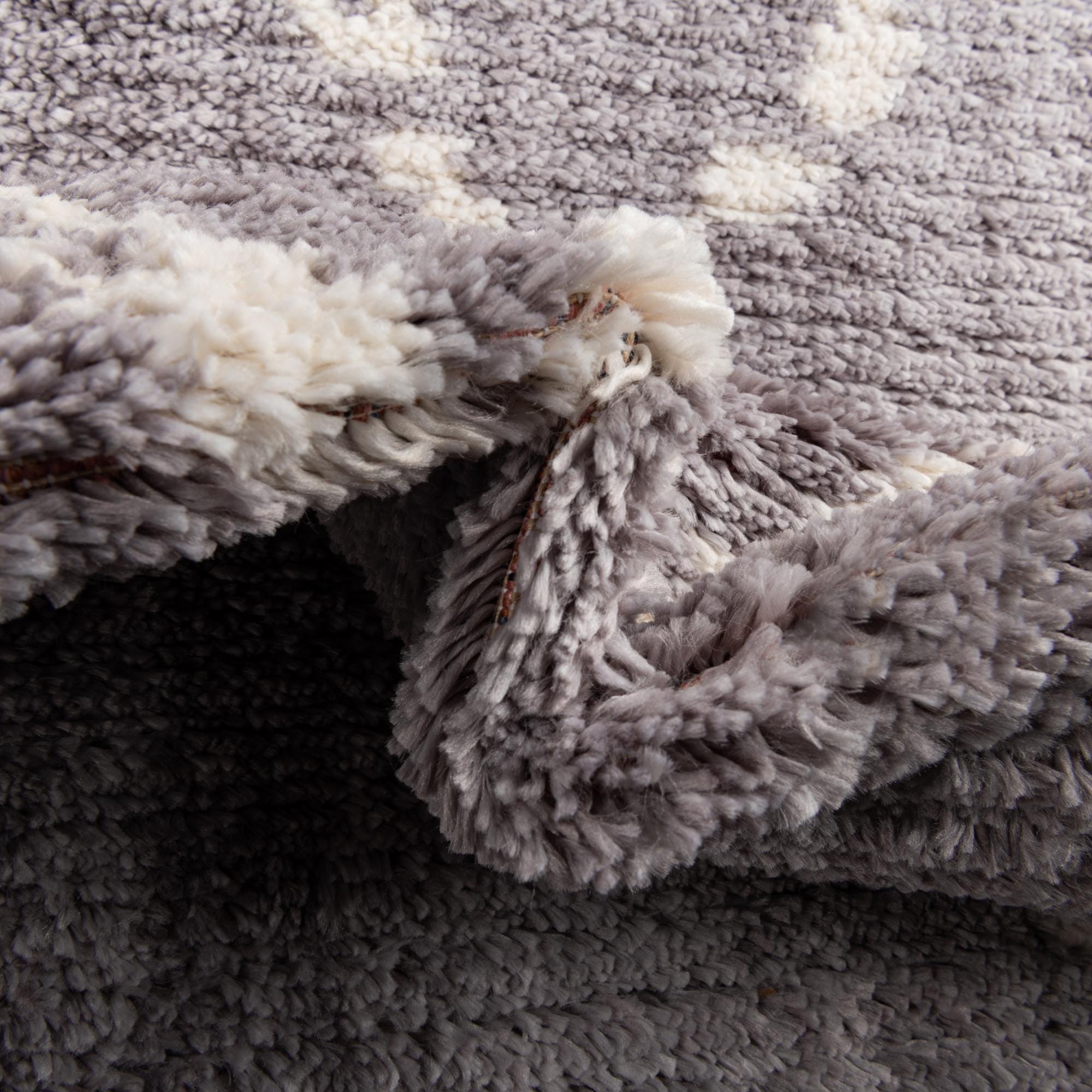 A 7x10 rectangular gray shag rug with an abstract white diamond pattern, suitable for a living room.