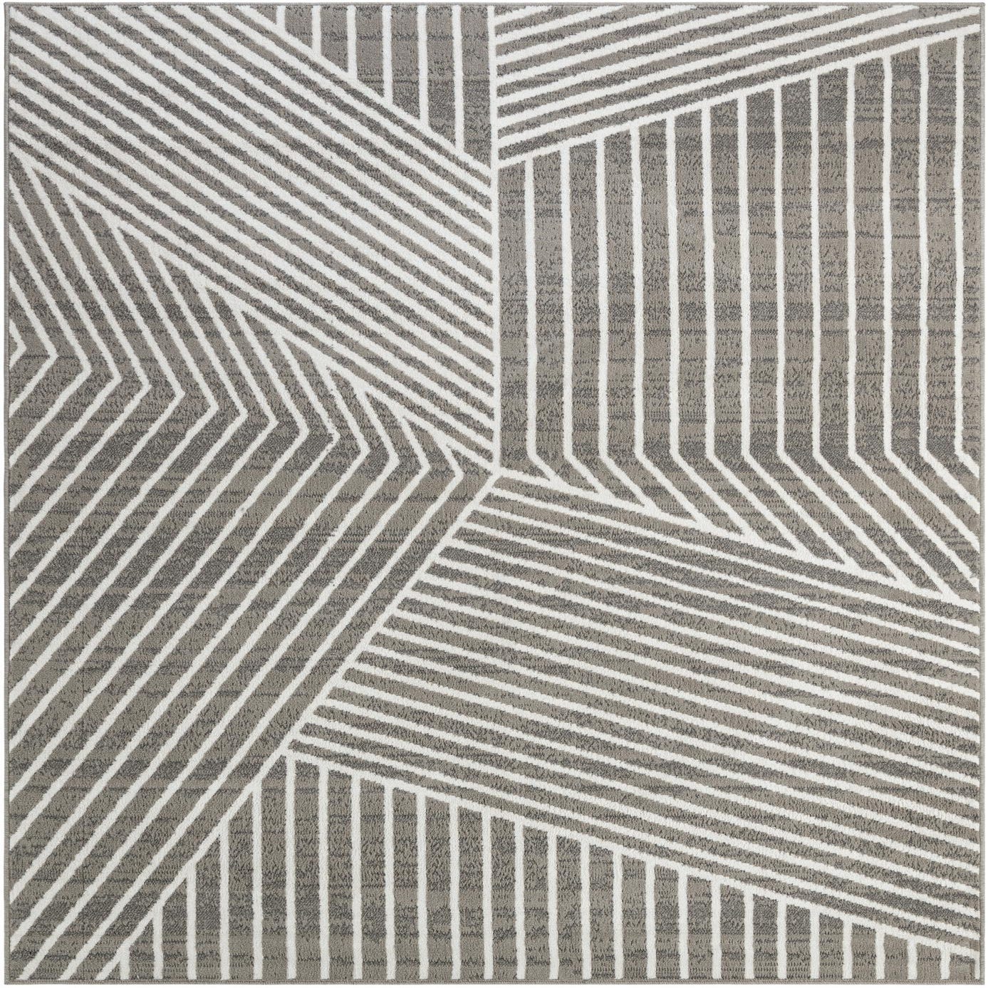 A geometric, modern rug with a striking interplay of linear bands and angled panels. Crisp ivory stripes cut across a soft gray background to form a series of intersecting fields—some with vertical lines, others with diagonal runs—creating a sense of movement without busy color. The surface has a tactile, low?pile polypropylene construction with a subtle high?low texture where the ivory lines lift slightly above the gray, offering visual depth and a pleasant underfoot feel. Machine made from 100% polypropylene for consistent color and weave.