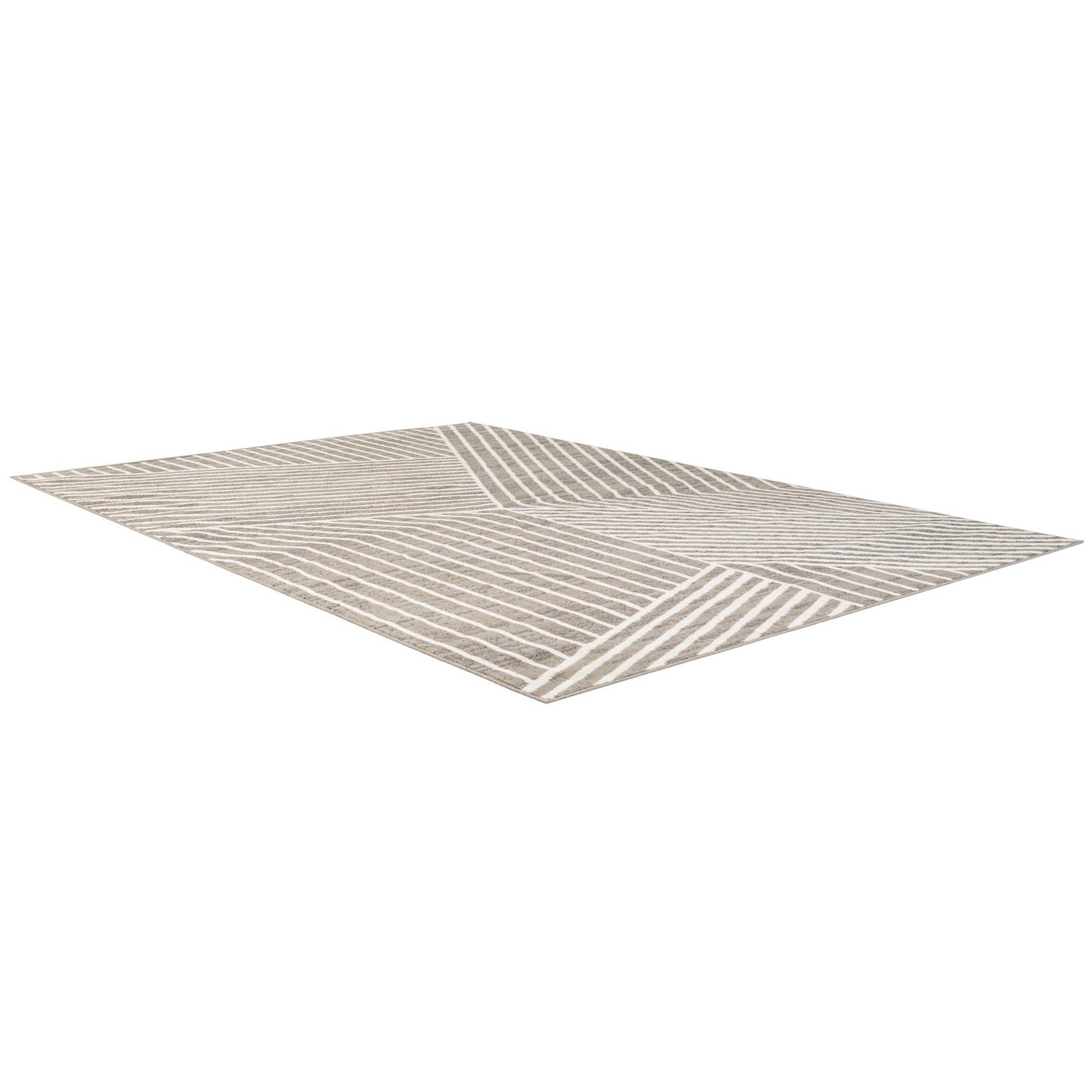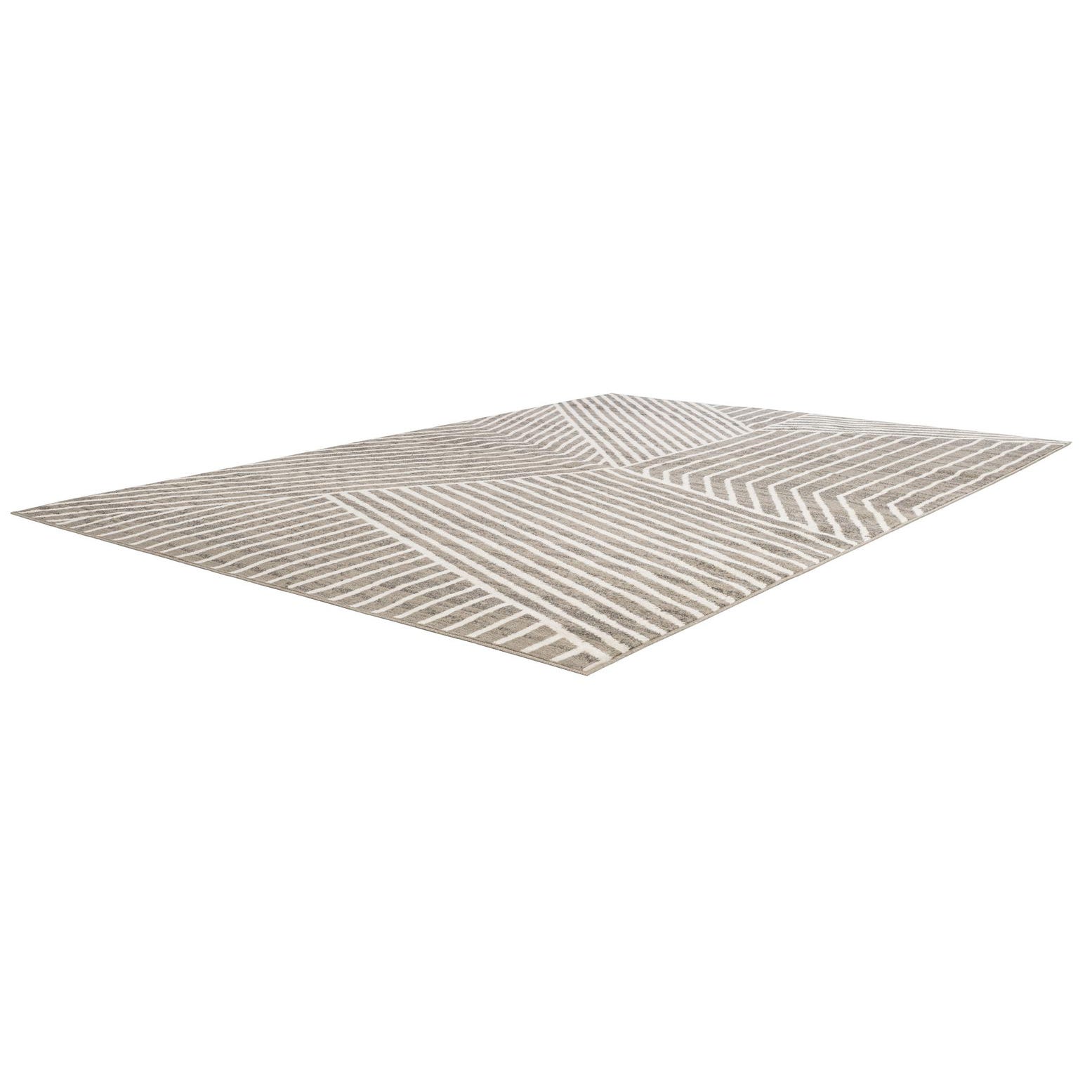 A geometric, modern rug with a striking interplay of linear bands and angled panels. Crisp ivory stripes cut across a soft gray background to form a series of intersecting fields—some with vertical lines, others with diagonal runs—creating a sense of movement without busy color. The surface has a tactile, low?pile polypropylene construction with a subtle high?low texture where the ivory lines lift slightly above the gray, offering visual depth and a pleasant underfoot feel. Machine made from 100% polypropylene for consistent color and weave.