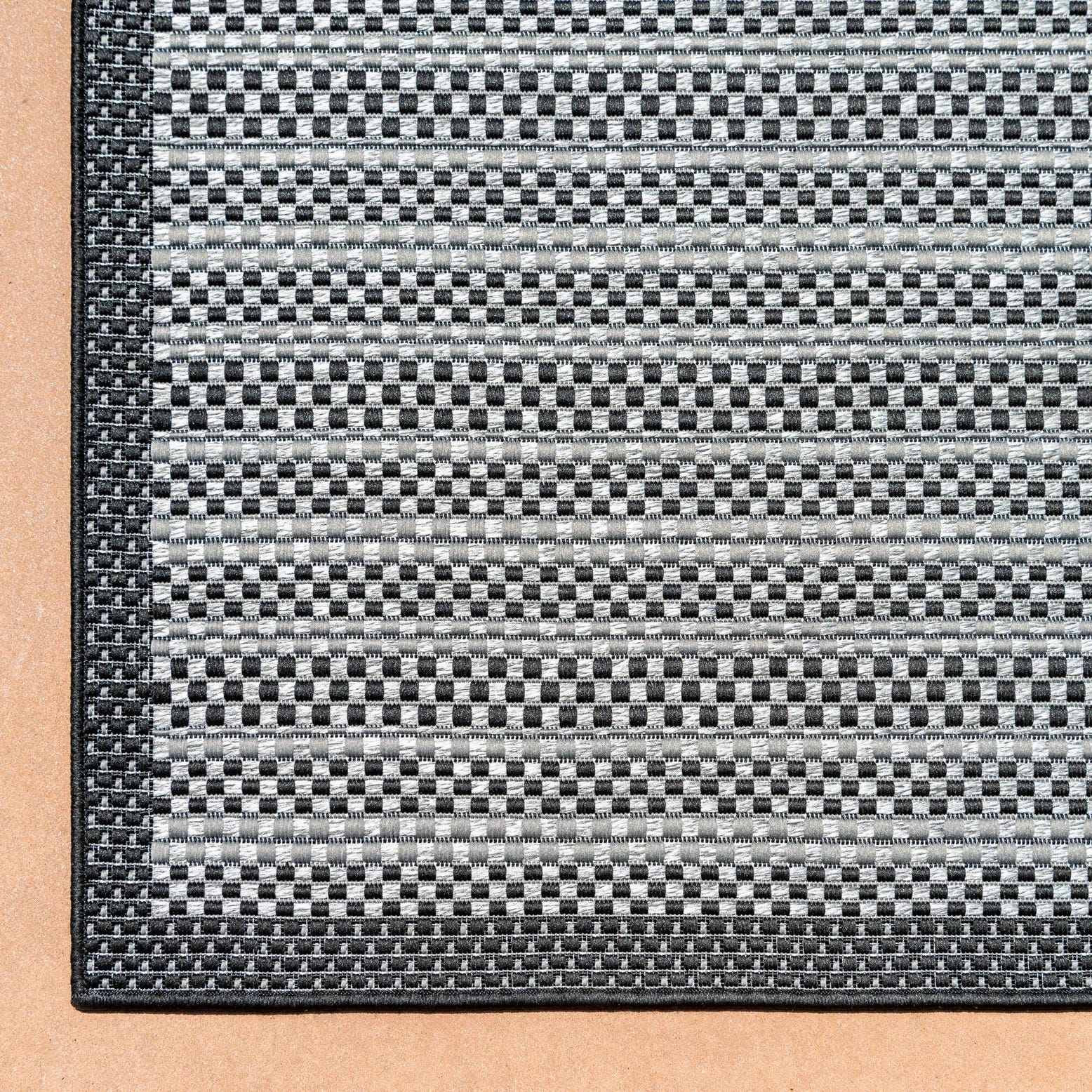 A tight, small-scale geometric weave creates a linear checker effect across a gray field, with black and silver threads interlacing to form subtle horizontal bands. A clean black border frames the design, giving it a tailored, contemporary edge. Machine-made of 100% polypropylene, the rug has a low-profile, flatwoven texture you can feel beneath your feet—firm and slightly textured rather than plush—ideal for high-traffic areas.