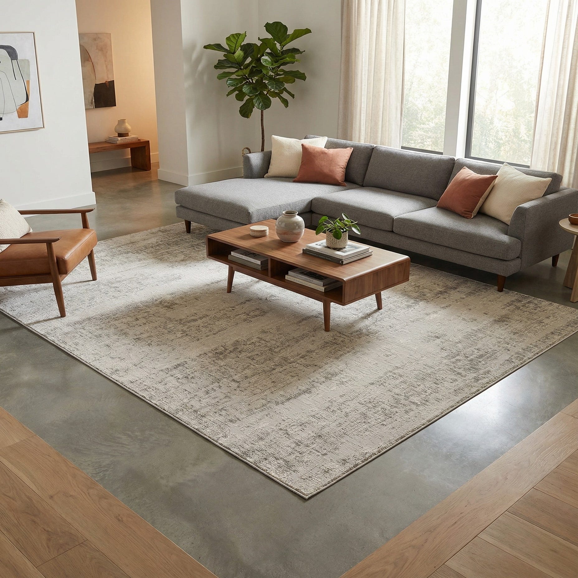 This rug pairs well with light-wood furnishings, linen upholstery, and metal-accent pieces for a calm, contemporary arrangement. Use it to anchor a living room seating area, define a covered patio or dining space, or add a neutral foundation in minimalist, Scandinavian, or transitional interiors where subtle texture and muted color are needed.