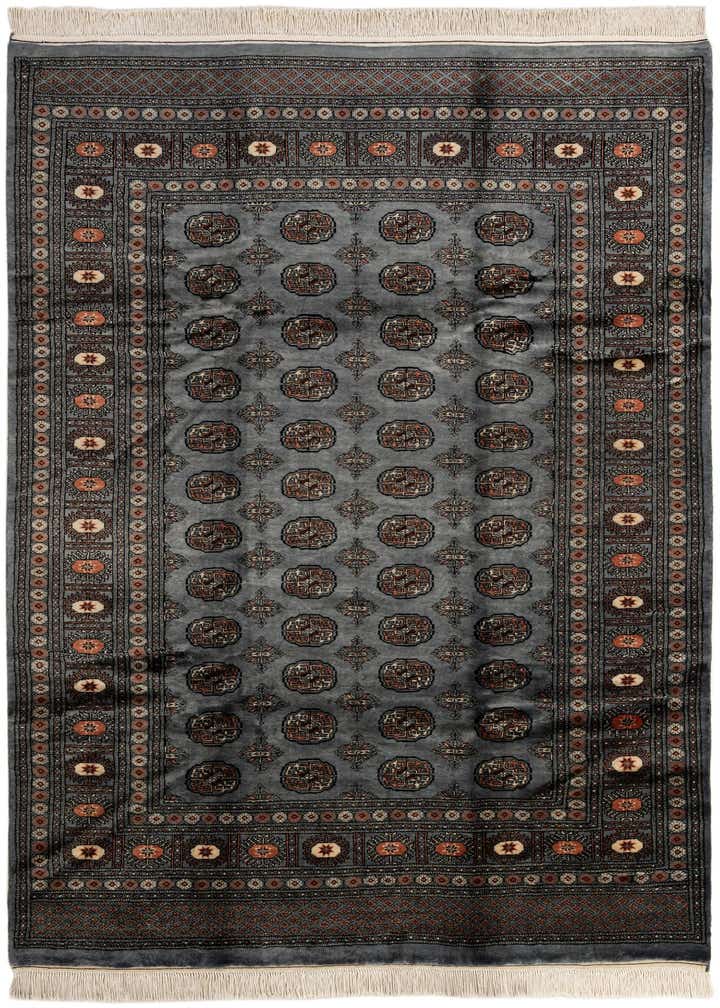A 7x10 rectangular Torkaman wool rug in gray with traditional Persian medallion and geometric patterns, ideal for a living room.