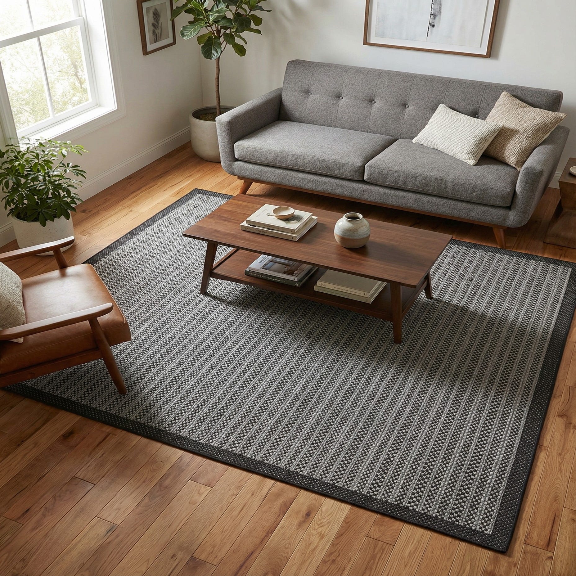Place it on a covered patio or balcony to ground outdoor seating, or use it in a sunroom or mudroom where easygoing style and durability matter. Its neutral gray base with black and silver accents pairs well with modern metal furniture, coastal wicker in muted tones, or a monochrome interior where pattern is needed without overwhelming the space.