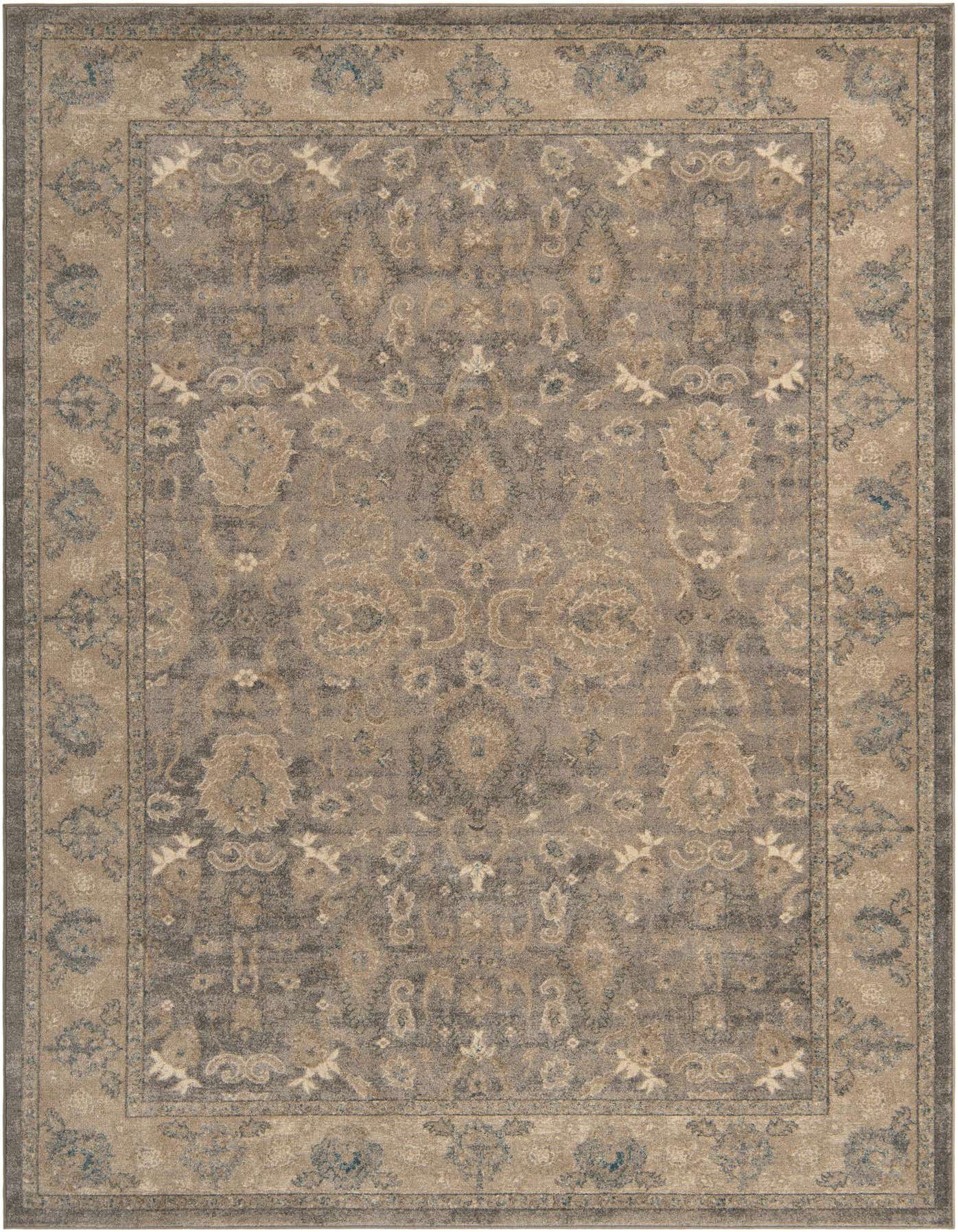 Primary color is Gray. Colors in this rug include: Gray, Light Blue, Ivory.