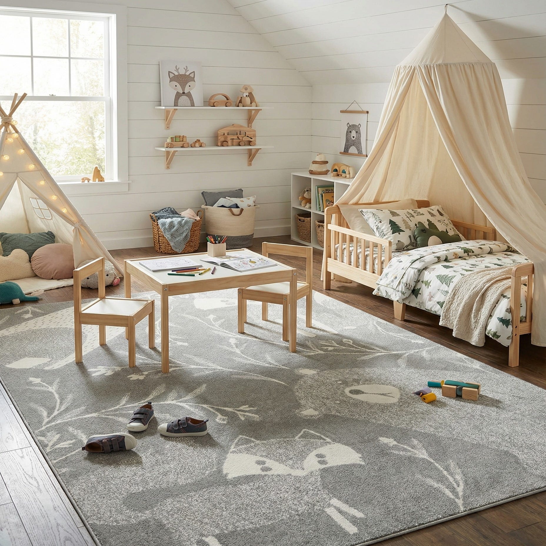 Machine-made from 100% polypropylene, the rug has a low, dense pile with a soft, smooth hand underfoot and a durable face that holds its design definition. The calming gray-and-ivory palette pairs easily with light woods, muted pastels, or crisp whites—ideal for a nursery, playroom, or a cozy reading nook. It also layers nicely in Scandinavian or modern farmhouse interiors where you want a touch of charm and texture without adding bold color.