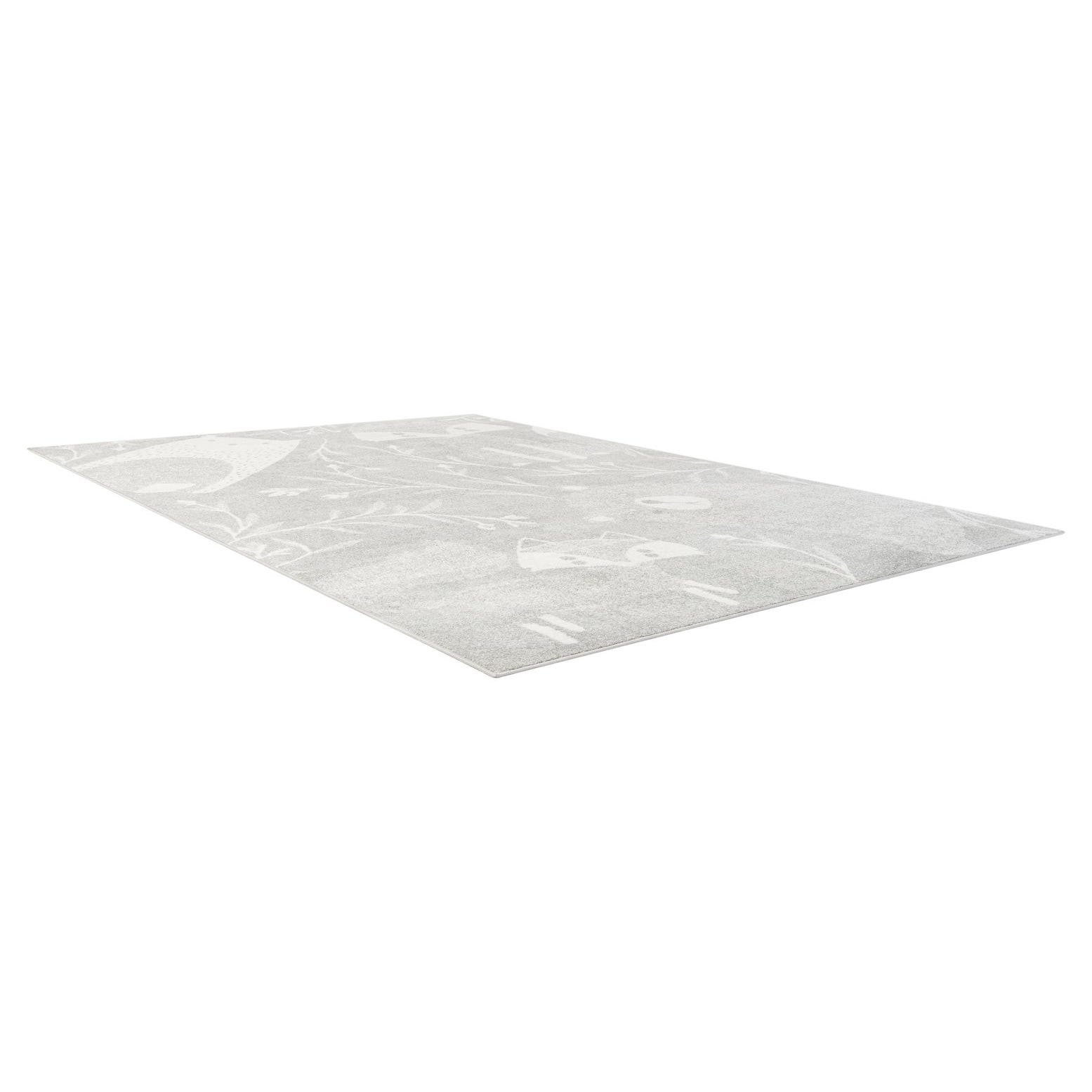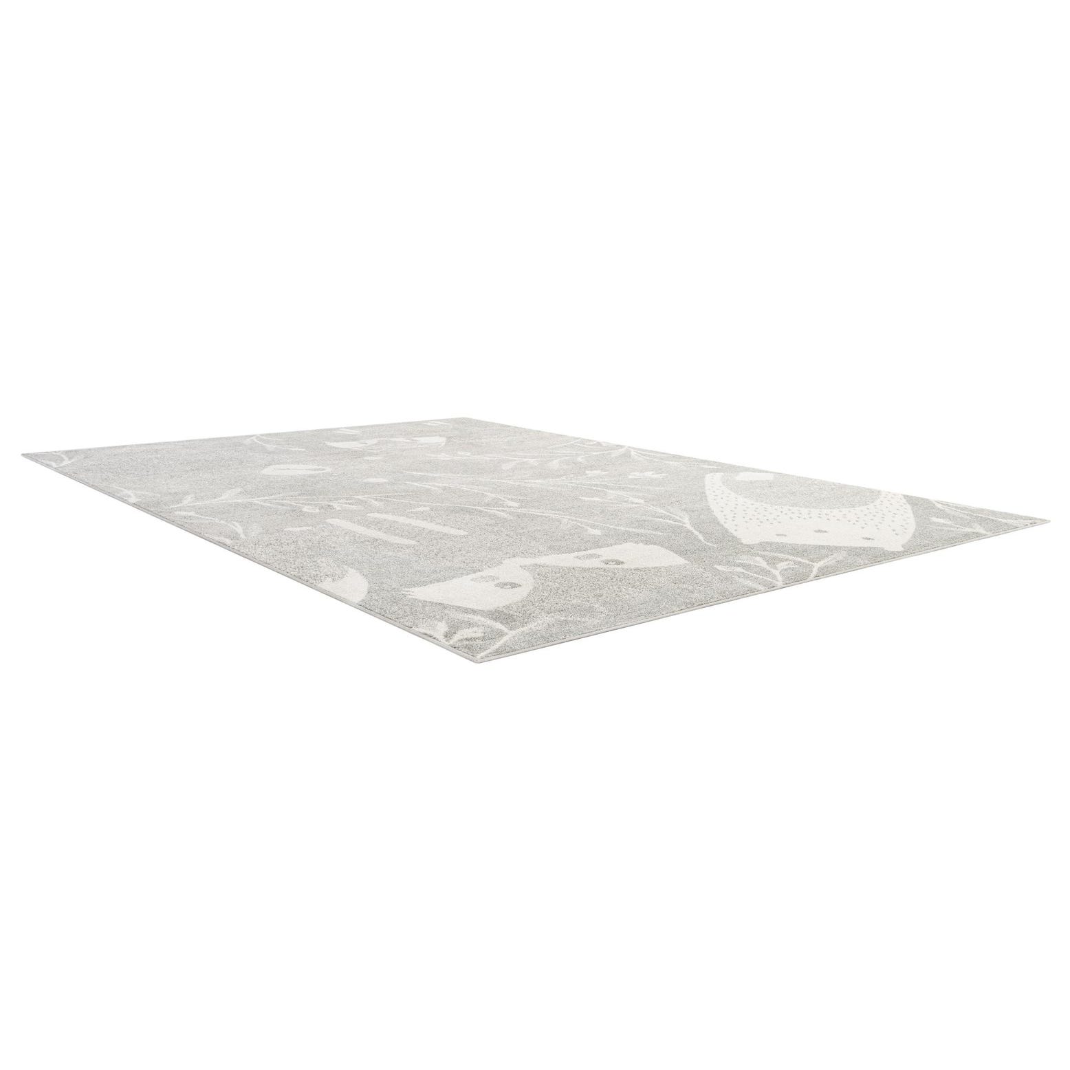 A gray 7x10 rectangular rug featuring a whimsical pattern of white bears, foxes, and delicate foliage.