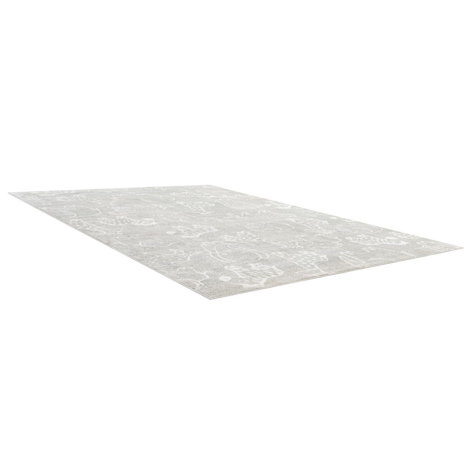 A rectangular 7x10 gray area rug with a playful modern abstract pattern of white outlined safari animals like elephants, giraffes, and zebras.