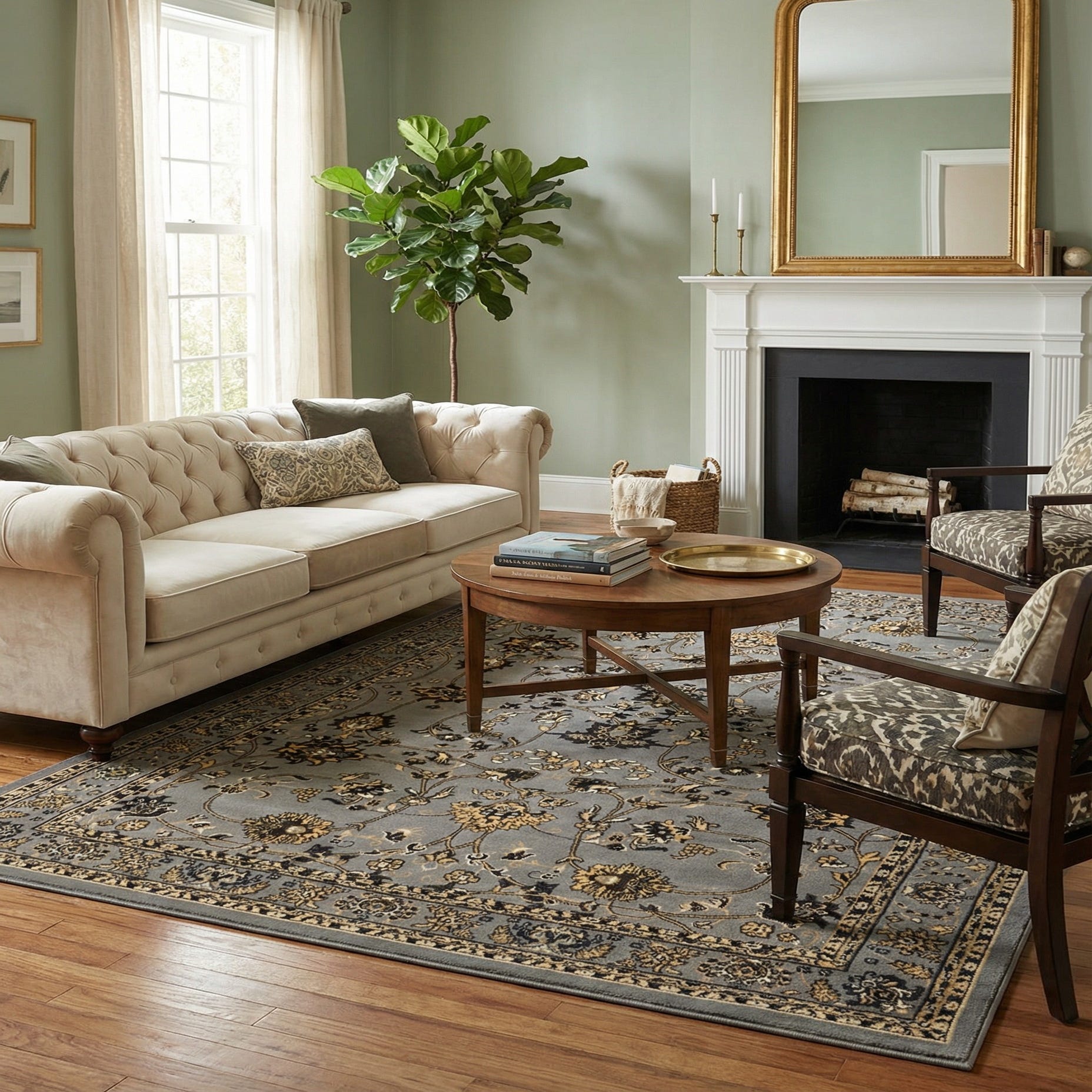 Works well beneath a living room seating group or centered under a dining table to anchor a formal arrangement, and it can also add structure to a home office or entry hall. Pair it with warm wood tones and brass or matte black accents to bring out the tan and black details, or layer it with ivory textiles and cool grays for a more contemporary, transitional look.