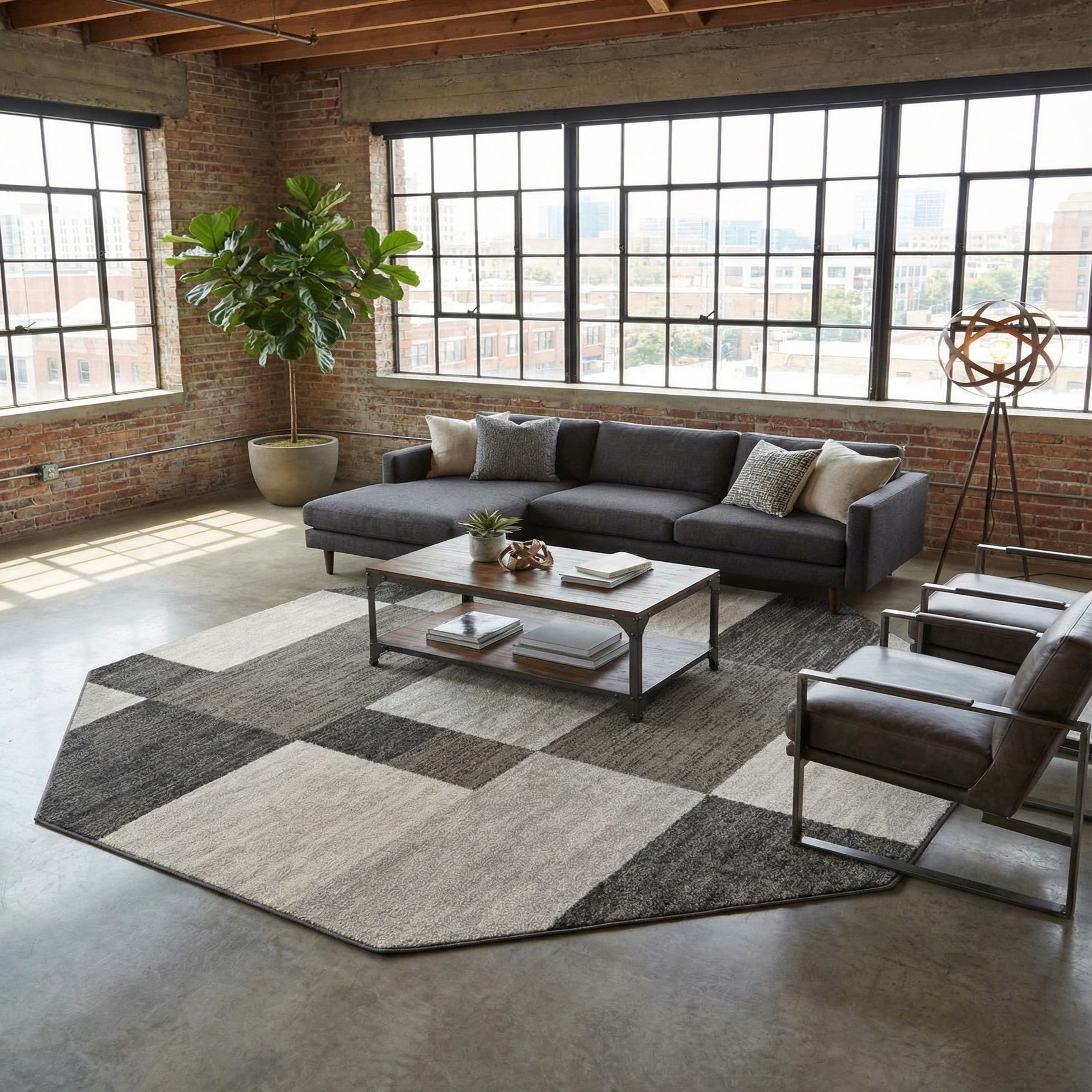 Machine-made of 100% polypropylene, the rug has a low-profile pile that feels smooth underfoot with a subtle texture where the darker blocks are ribbed. The finish is tidy and consistent, a good match for clean-lined furnishings. Place it beneath an octagonal or round dining table, anchor a compact living or seating area, or use it in a foyer to introduce pattern without heavy color. It pairs well with warm wood tones to balance the cool grays, black metal accents for an industrial-modern look, or ivory textiles to brighten a neutral palette.