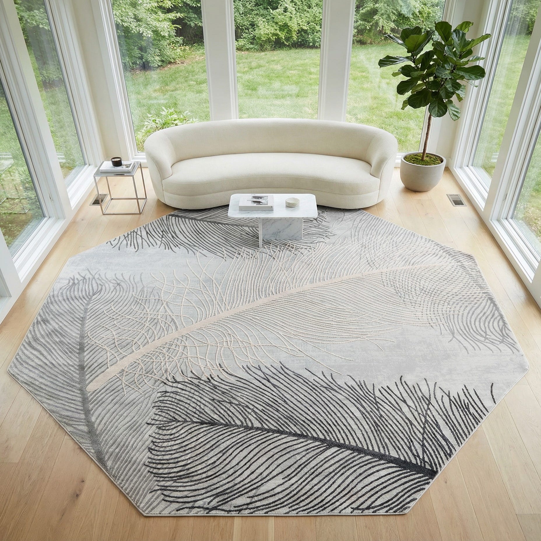 A soft gray field provides a calm, neutral backdrop for an oversized feather motif rendered in ivory and warm beige, with fine charcoal-gray line work adding definition. The organic pattern reads modern yet soothing, and the octagonal outline gives the piece a sculptural presence. Machine-made from 60% polypropylene and 40% polyester, the rug has a low-profile pile with subtly raised patterning where the feather lines are slightly elevated, offering gentle texture underfoot without adding bulk.