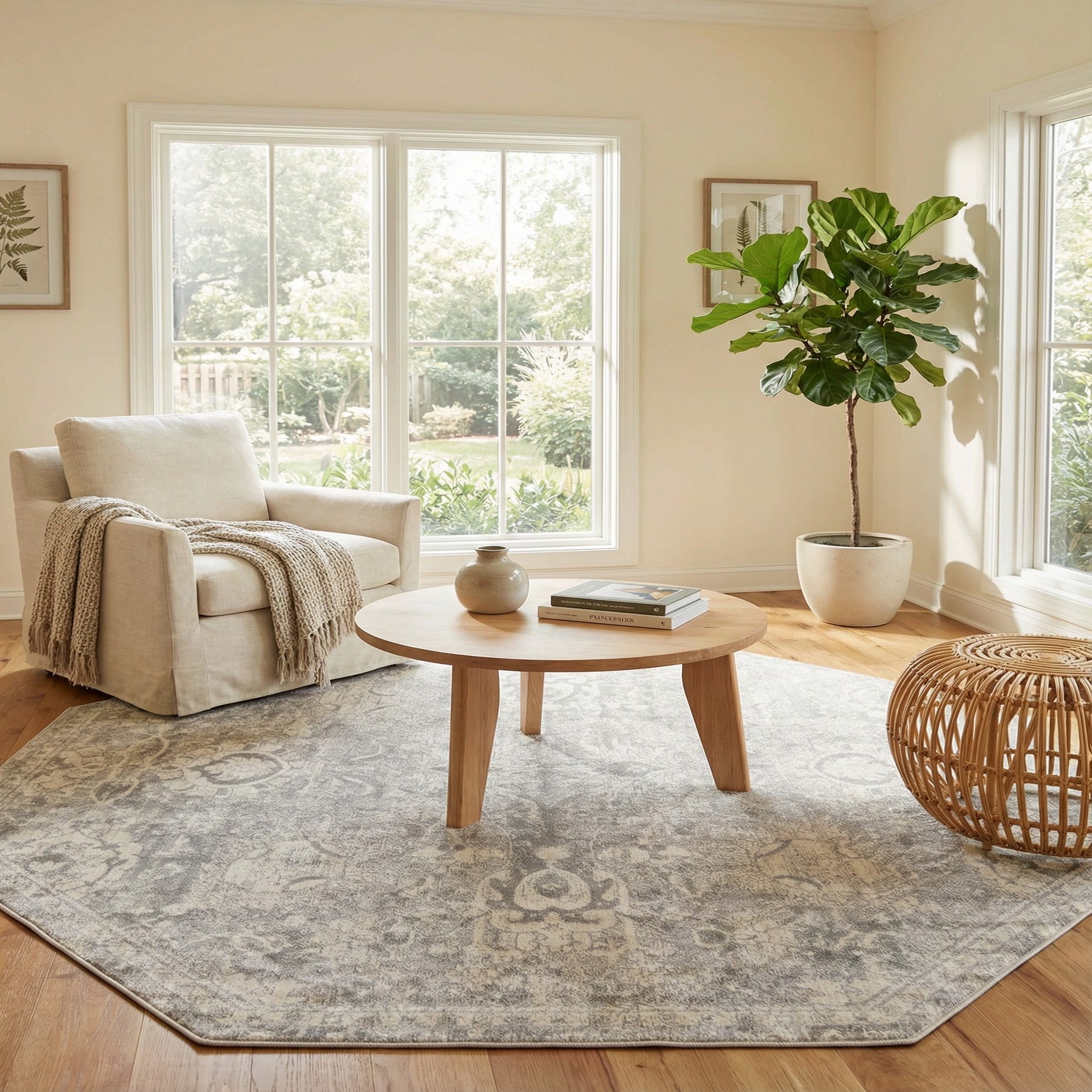 A soft, low?contrast pattern gives this octagonal rug a quietly traditional look. Floral and arabesque motifs are woven into a muted, distressed field so the ivory and beige accents sit gently against a gray background. The design reads as a vintage?inspired medallion with a barely?there border, offering visual texture without overpowering a room’s other elements.