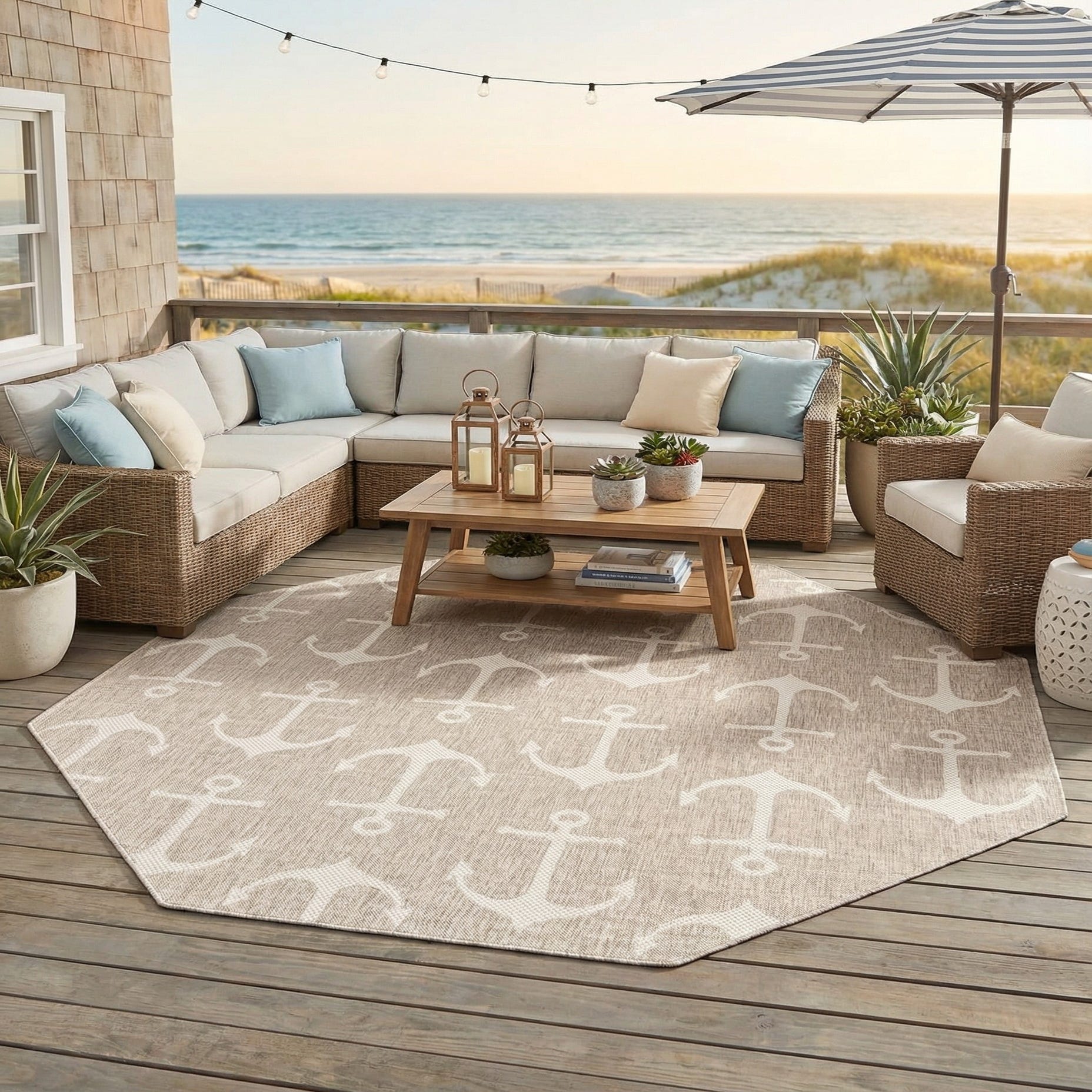 An octagon-shaped gray rug with a repeating white anchor pattern, suitable for indoor or outdoor use.