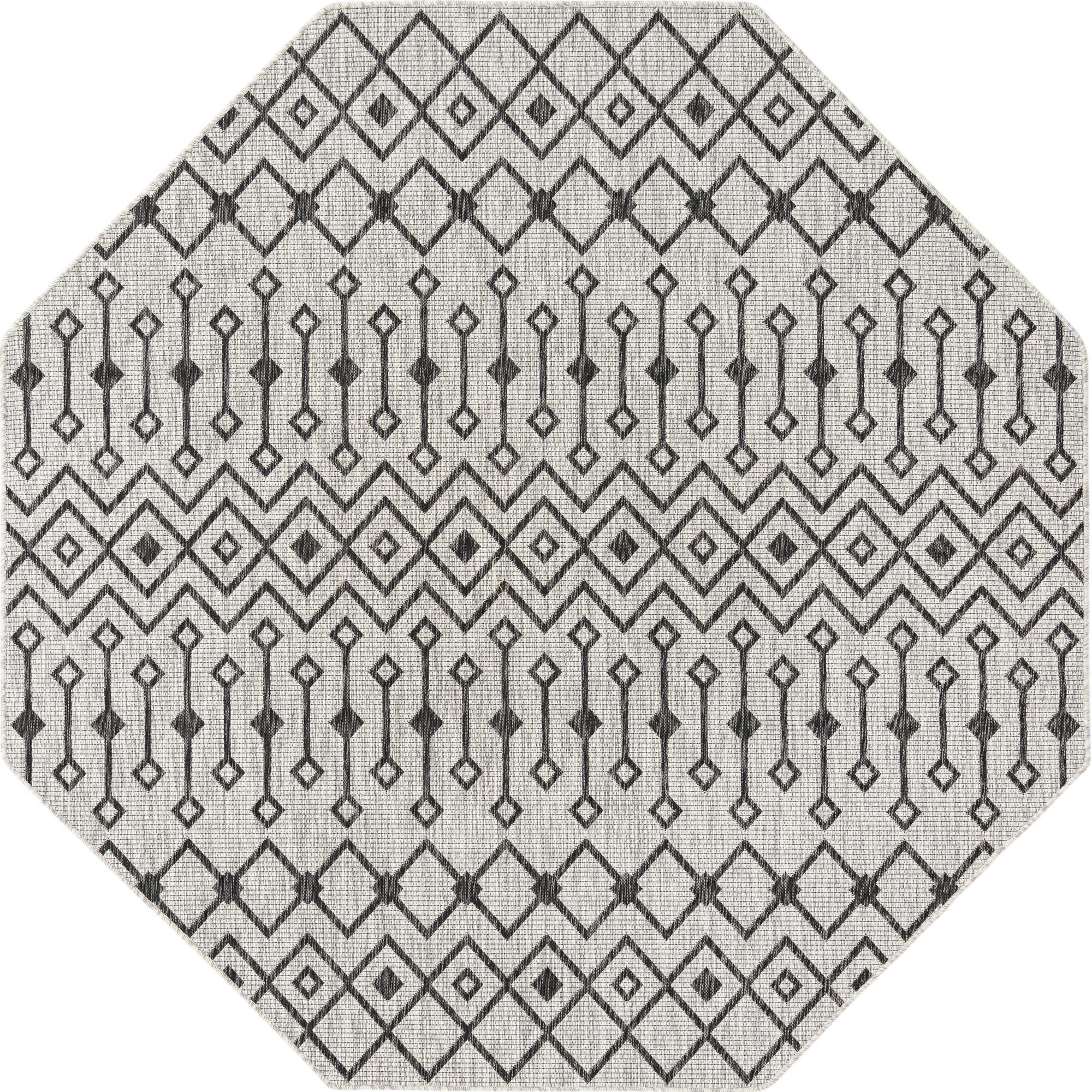 The Outdoor Lattice collection presents a modern take on classical design with this 8 Ft Octagon rug. The rug has a grey background which serves as a neutral canvas for the striking lattice pattern in black that adorns its surface. This geometric layering creates a sense of dimension and an engaging visual appeal.