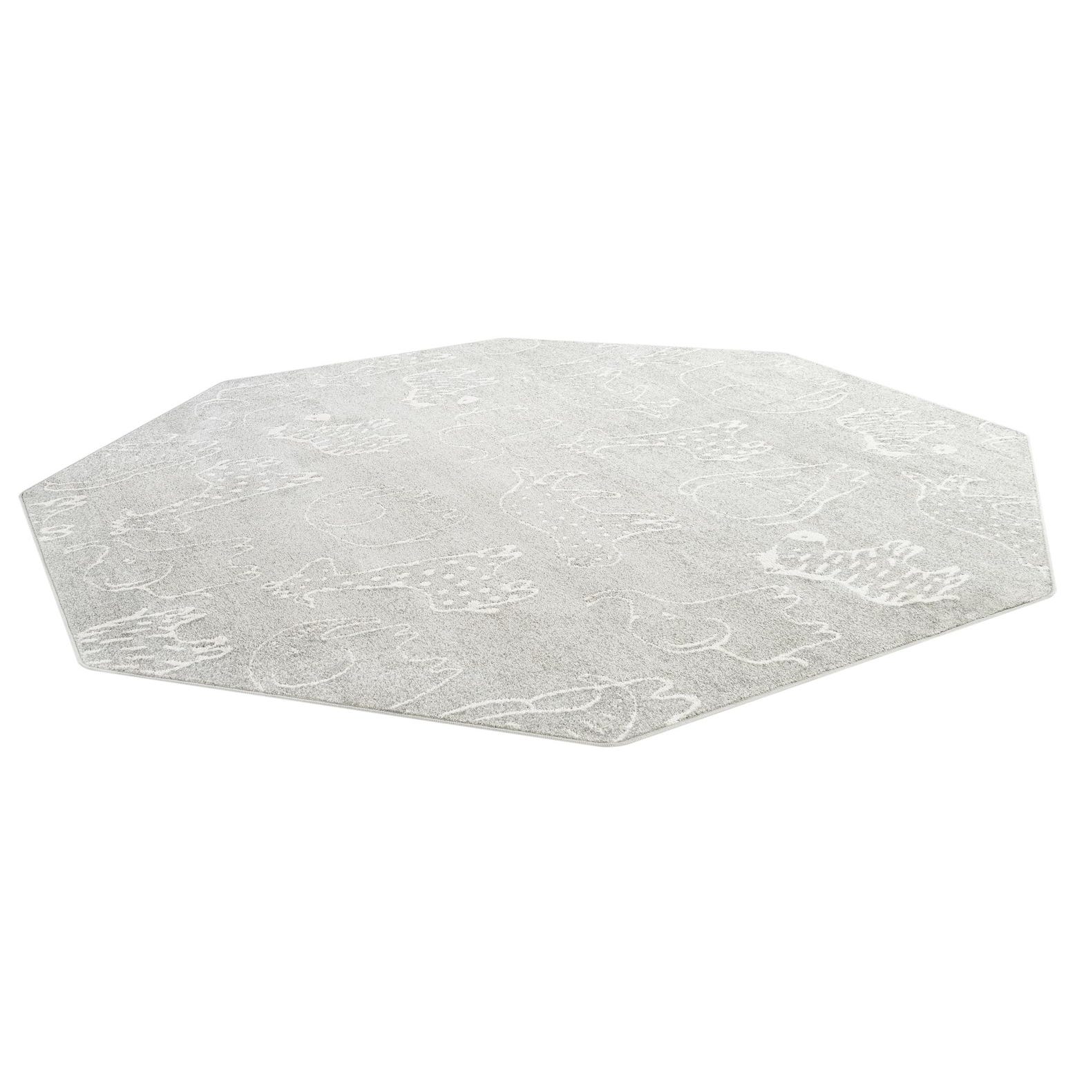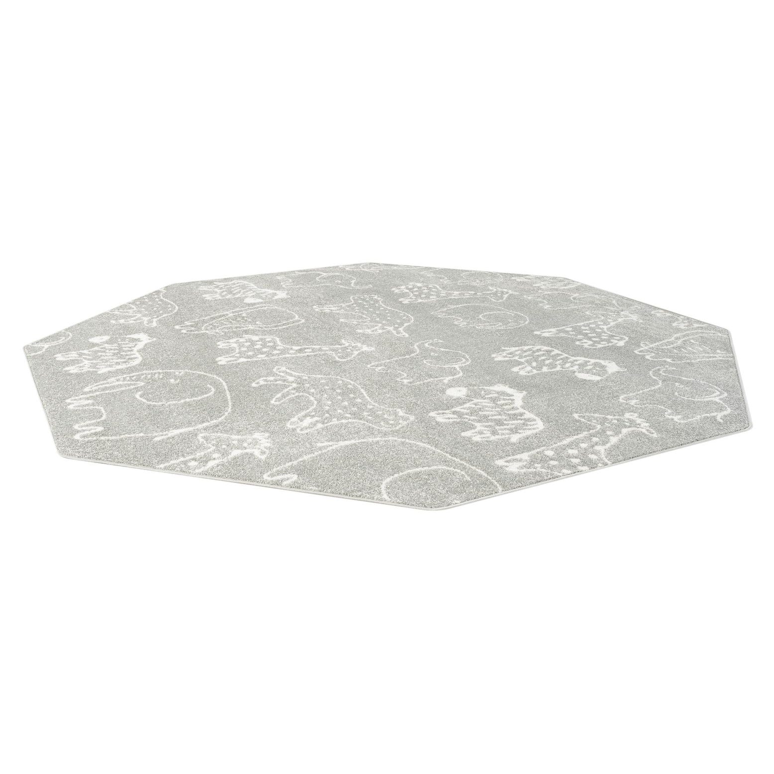 Octagon rug in light gray with white outlines of various safari animals like elephants, giraffes, zebras, and leopards.