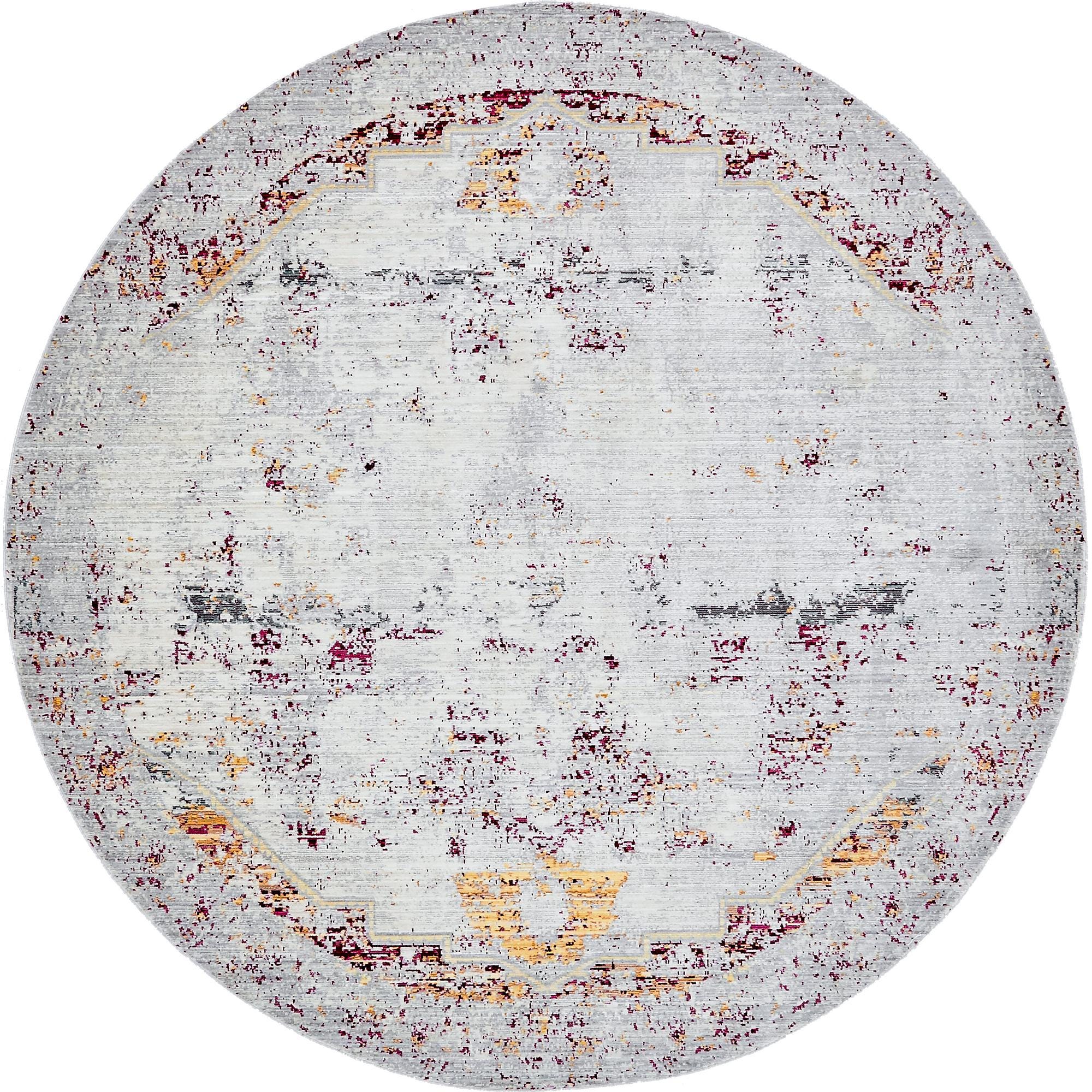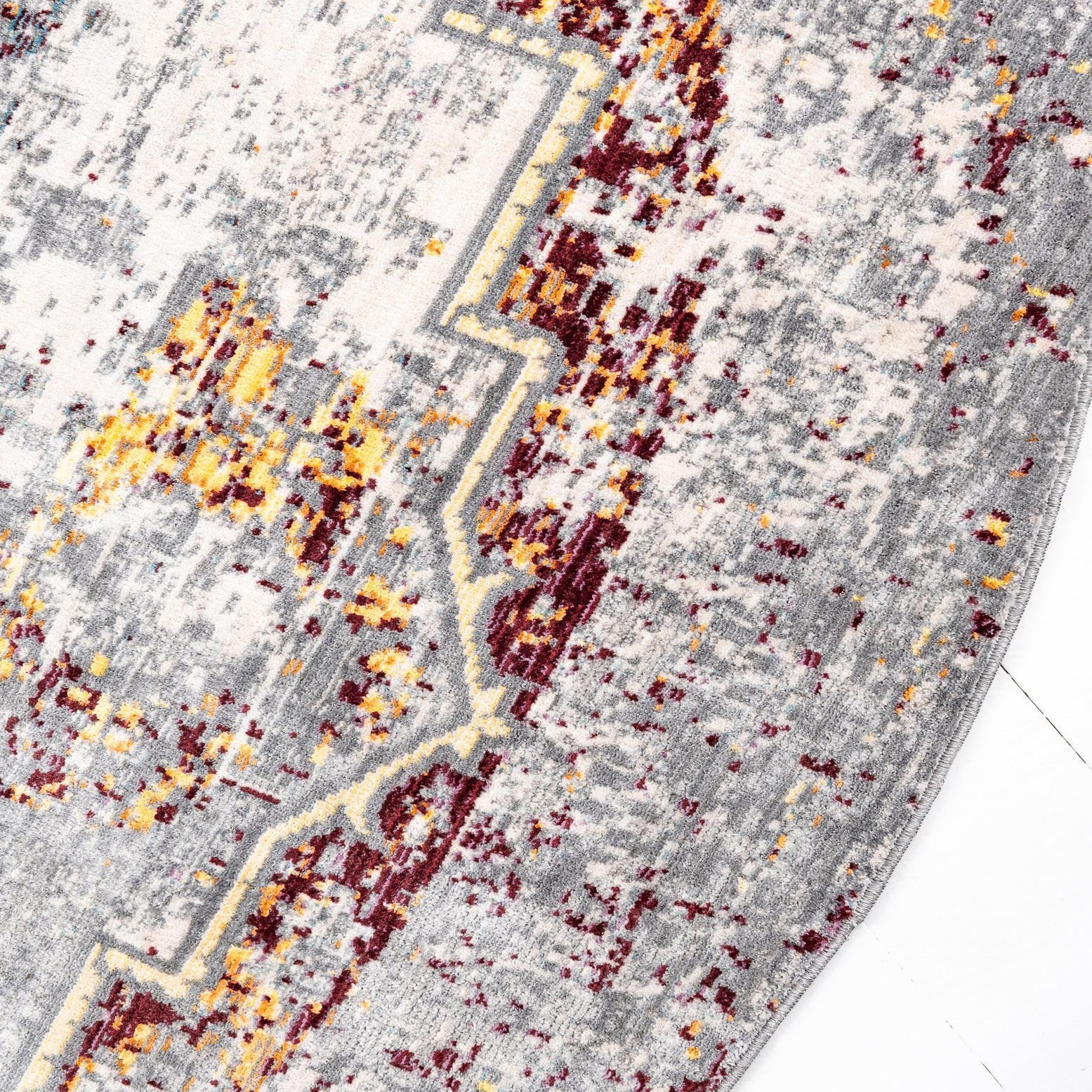 Set on a gray background, this round rug presents a softly distressed medallion motif with scattered color flecks in burgundy, orange, peach, tan, yellow, brown and cream. The pattern blends a faint geometric border into the field for a lived-in, vintage-inspired look, while subtle color variations create depth without overwhelming the neutral base. Machine-made from 100% polyester, the rug has a low, dense pile that feels smooth and slightly lustrous underfoot, offering a tactile, approachable surface.