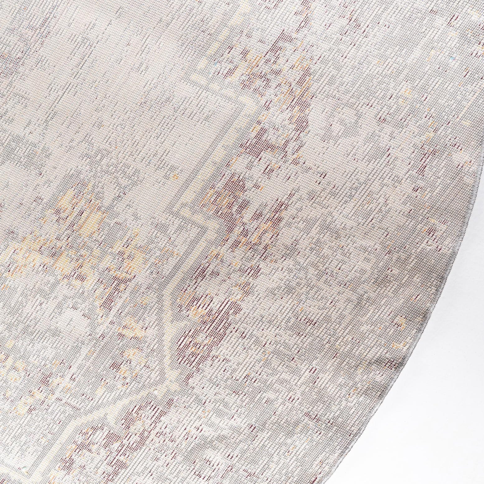 This piece works well beneath a round dining table or centered under a conversational seating group, where the muted gray will ground warm wood tones and richer upholstery. Pair it with mid-century modern or transitional furnishings, layer it over hardwood or tile to soften the room, or use it in a bedroom to add color without competing with patterned bedding. The palette and texture make it versatile for both contemporary and eclectic interiors.