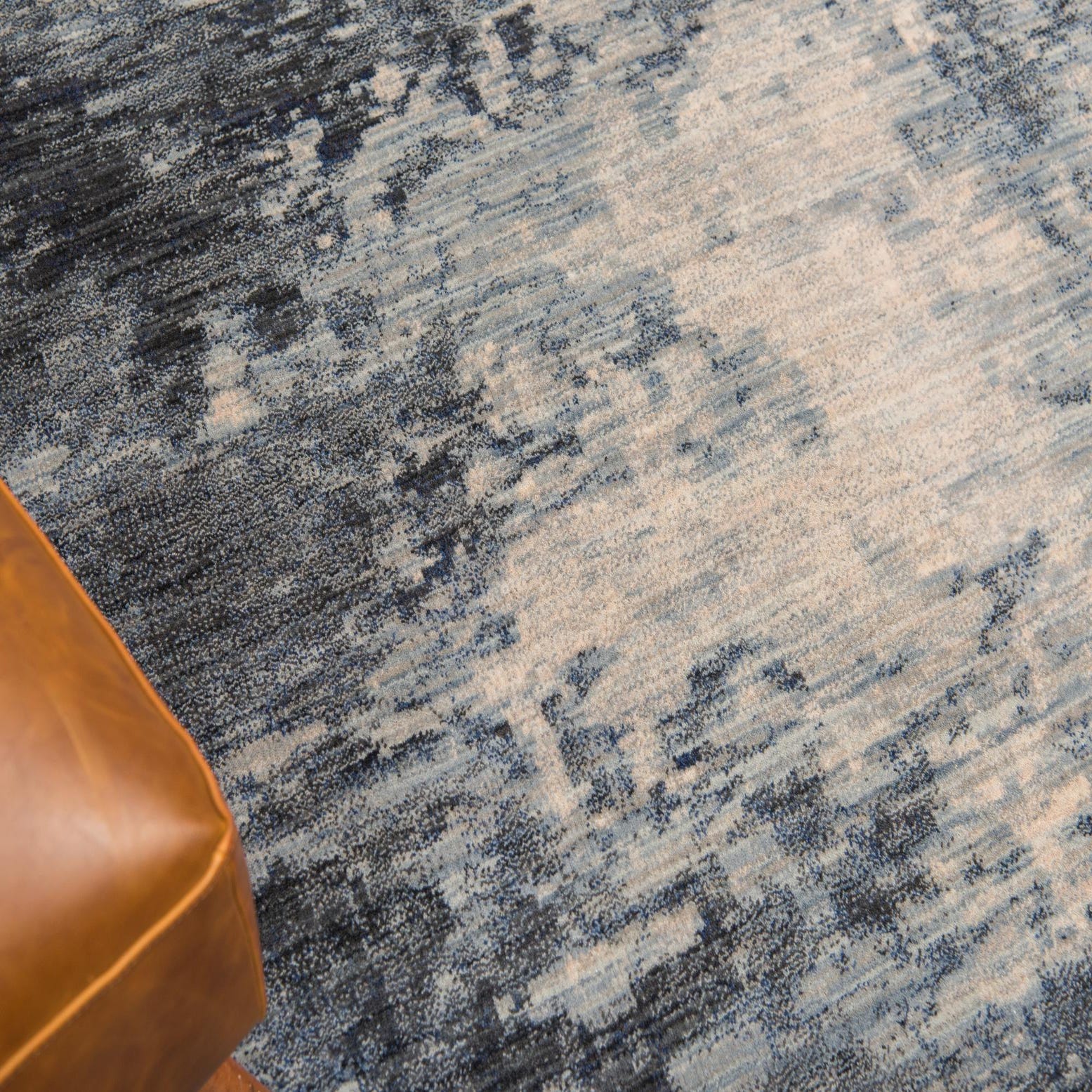 A soft, painterly abstract pattern settles across a gray background, where washes of ivory and cool blue mingle in layered, weathered strokes. The muted palette and subtle variations in tone create visual depth without a rigid motif, giving the rug a calm, contemporary-transitional look. Machine made of 100% polypropylene (space-dyed yarn), the surface has a low, smooth pile with a slightly velvety hand and a gentle sheen where the yarn catches the light.