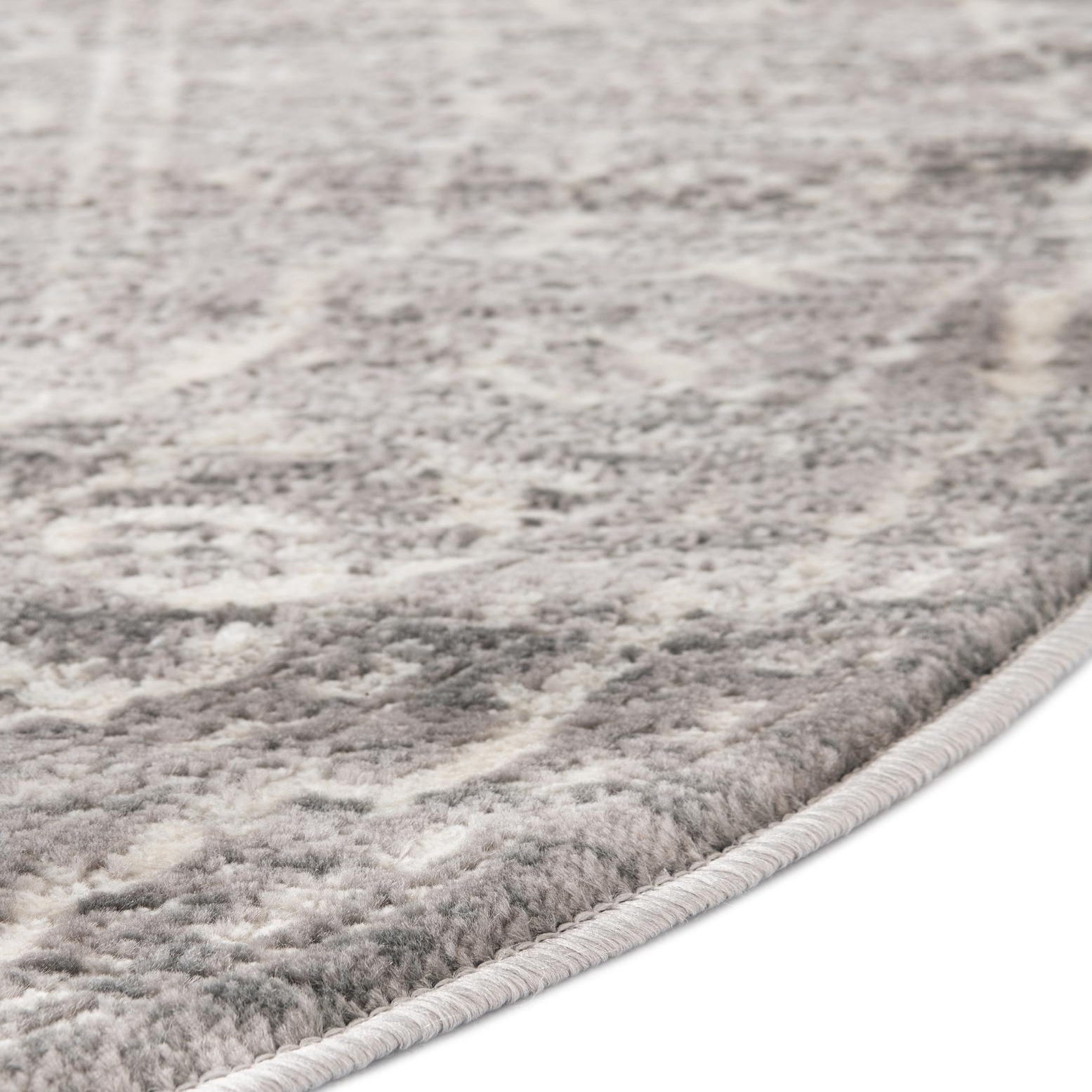 The Boston Collection presents a refined 8-foot round rug, skillfully machine-woven from a blend of 55% polypropylene and 45% polyester ensuring durability and consistent texture. This piece showcases a sophisticated gray and ivory color palette, where a deeper shade of gray serves as the background, elegantly complemented by lighter ivory tones that articulate the detailed pattern.