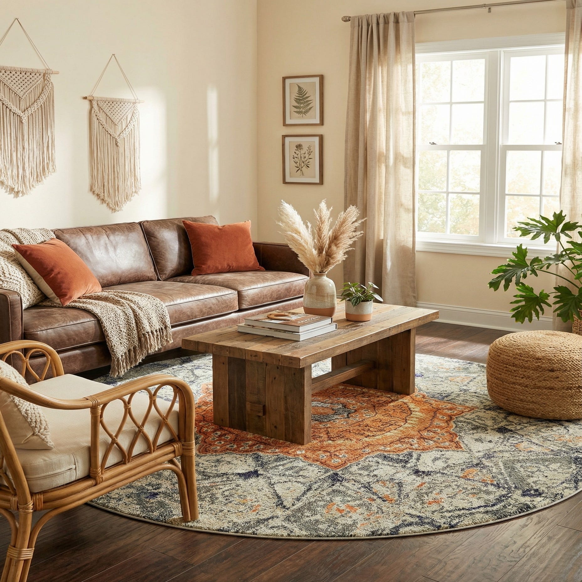 Machine-made of 100% polypropylene, the rug has a low, dense pile that feels smooth underfoot and holds its shape in everyday use. The round format and strong center motif make it a natural focal point under a circular dining table, beneath a seating group in a living room, or as an entryway statement that ties warm wood tones, leather furniture, or navy and neutral upholstery together. Its mix of warm orange and red with cool grays and blues lets it bridge transitional, mid-century and eclectic interiors.