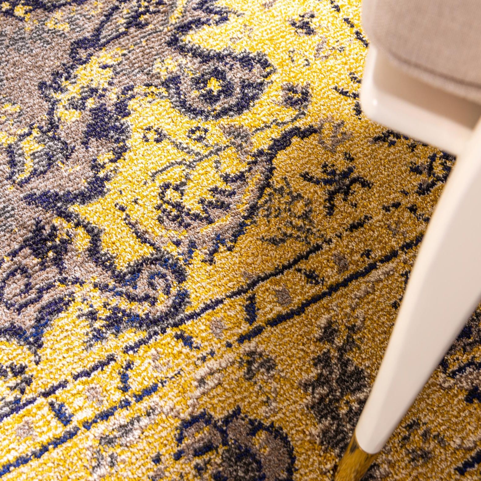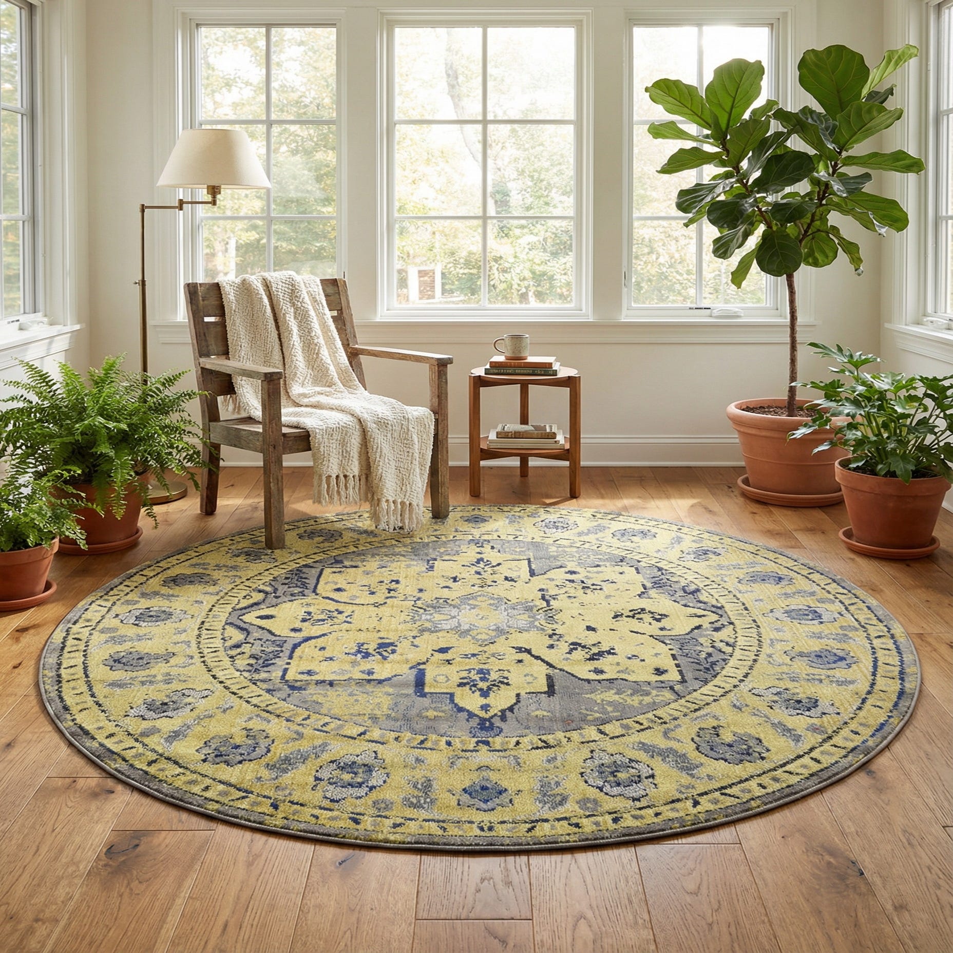 This rug works well as an anchor under a round dining table or tucked beneath a seating group to introduce pattern without overwhelming the room. It pairs nicely with mid-century furnishings and brass or gold-tone accents, complements industrial loft interiors with gray and black metal finishes, and brings a layered, traditional touch to neutral living rooms or bedrooms. Place it on warm wood floors to highlight the gold tones or use it on lighter floors to emphasize the gray field and patterned edge.